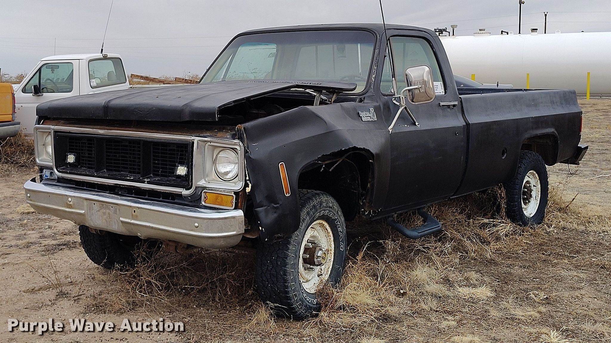 1976 Chevrolet Custom Deluxe C10 pickup truck. Miles: 58,720 on odometer, VIN: CCL146F440402. Engine Cylinders: 8, Fuel type: Gas. Transmission Manual, Speed: 4, Four wheel drive. Interior Heat. Tires Size: 265/75R16. Notes Collision damage, Battery missing, Unknown operating condition. Colorado title. Title distribution may be delayed up to 14 days from verification of funds. Kiowa County. Eads, CO 81036