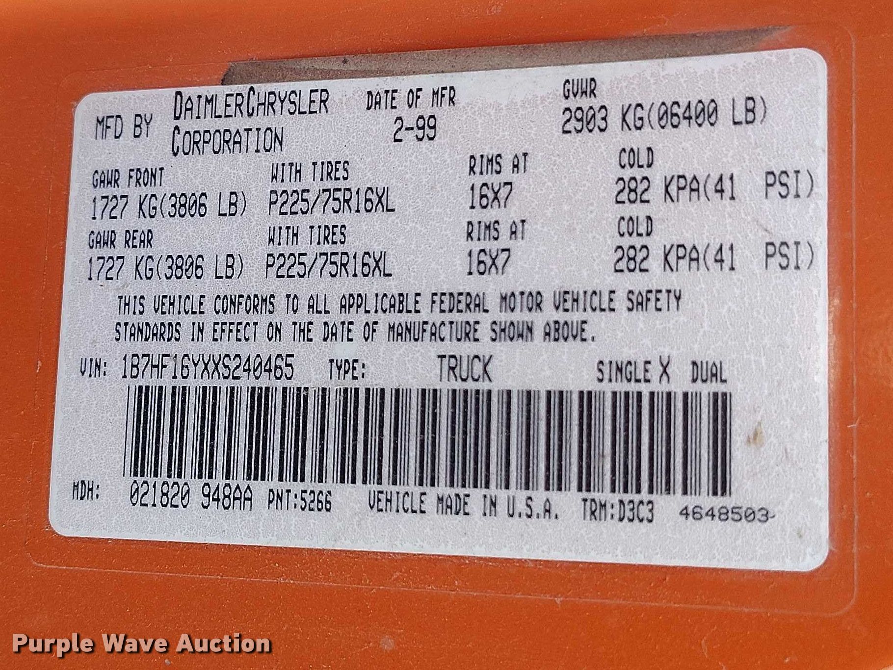 Purple Wave is selling a used 1/2 Ton Pickup or Van in Colorado. This item is a 1999 Dodge Ram 1500 pickup truck with the following: Miles: 218,289 on odometer, VIN: 1B7HF16YXXS240465