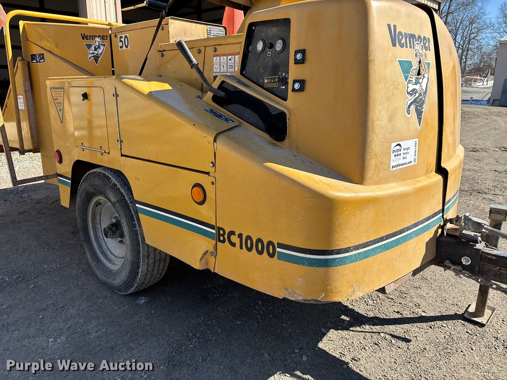 2000 Vermeer BC1000 wood chipper. Hours: 1,777 on meter, VIN: 1VRU111A7Y1000191. Engine Cummins B3.3, Displacement: 3.26L, Cylinders: 4, Fuel type: Diesel. Features Capacity: 12", Throat opening: 16" x 15", Auto feed. Tires Size: 225/75R15. Trailer Hitch: Pintle, Suspension: Spring, Brakes: Electric, Axles: Single. This is worksite support equipment and will not come with a title. Transfer of ownership documentation will be a bill of sale. Cape Girardeau County, MO. Jackson, MO 63755