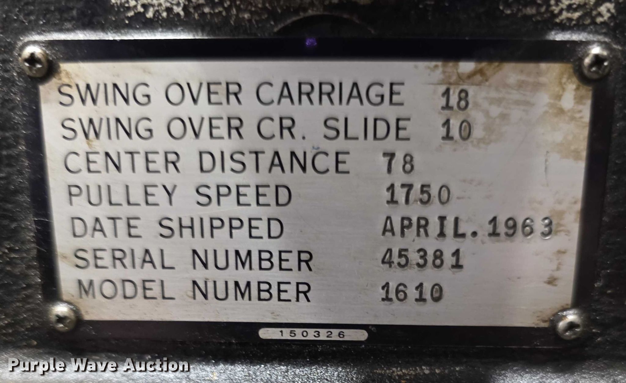 Purple Wave is selling a used Machine Shop Tools and Equip. in Kansas. This item is a 1963 Lodge and Shipley 1610 power turn lathe with the following: Serial: 45381
