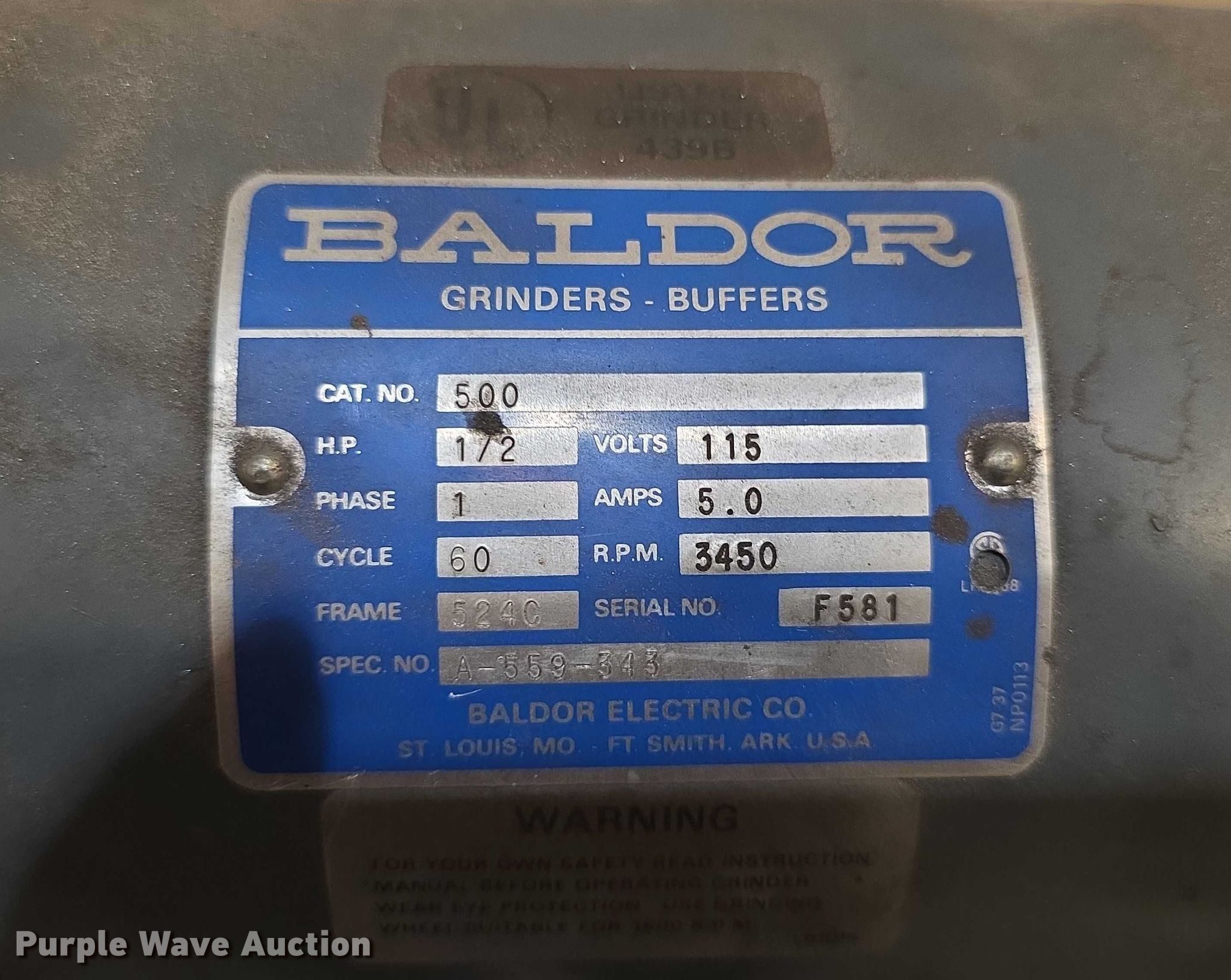 Purple Wave is selling a used Machine Shop Tools and Equip. in Kansas. This item is a (2) grinders with stands with the following: Baldor motor, Phase: Single, Volts: 115, Dayton motor, Phase: Single, Volts: 115