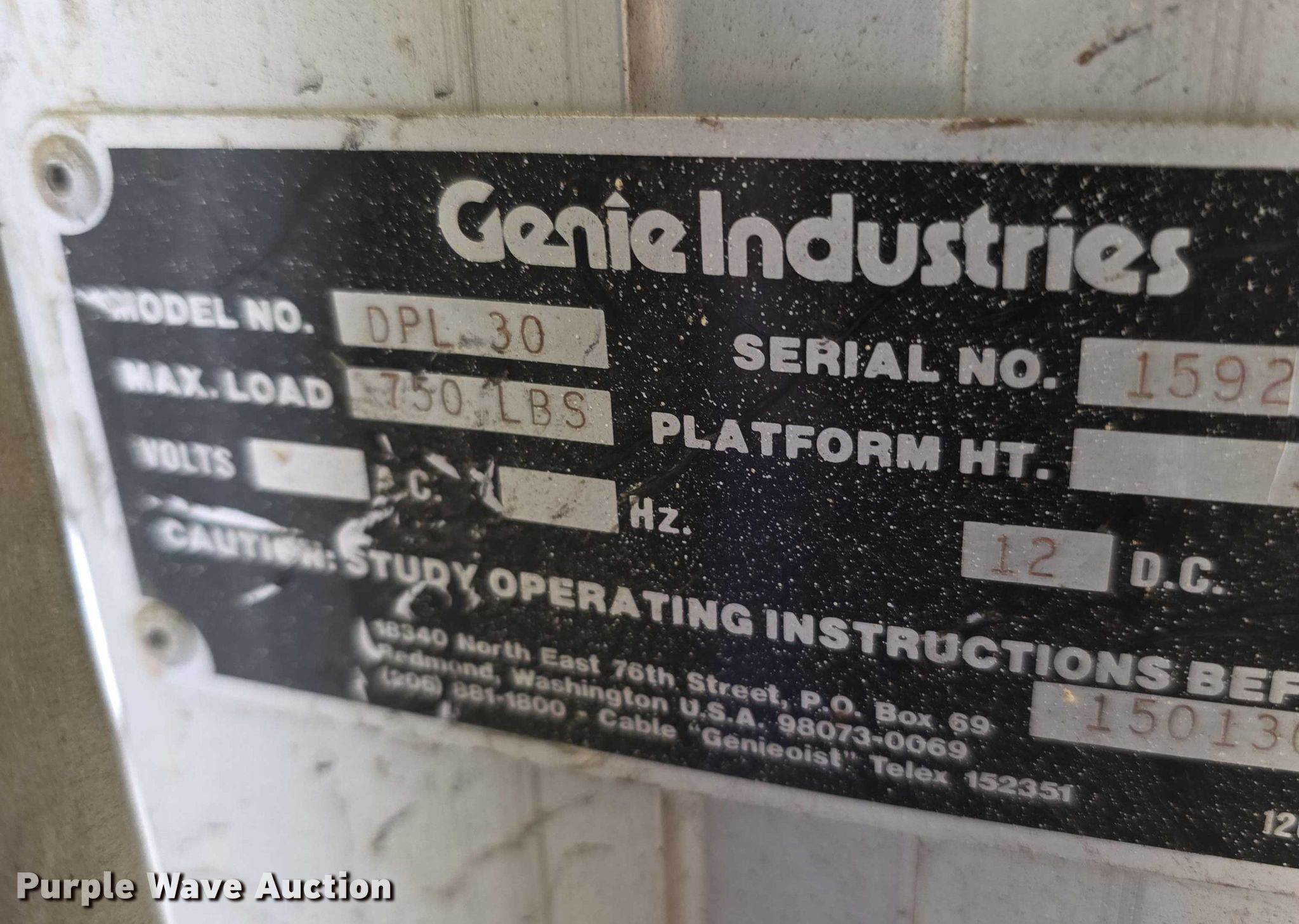 Genie Dual DPL30 vertical lift. Serial: 15923558S. Features Maximum lift capacity: 747 lbs, Maximum lift height: 29', Platform: 72" L x 26" W. Notes Unknown operating condition. Kansas City Board of Public Utilities. Kansas City, KS 66102