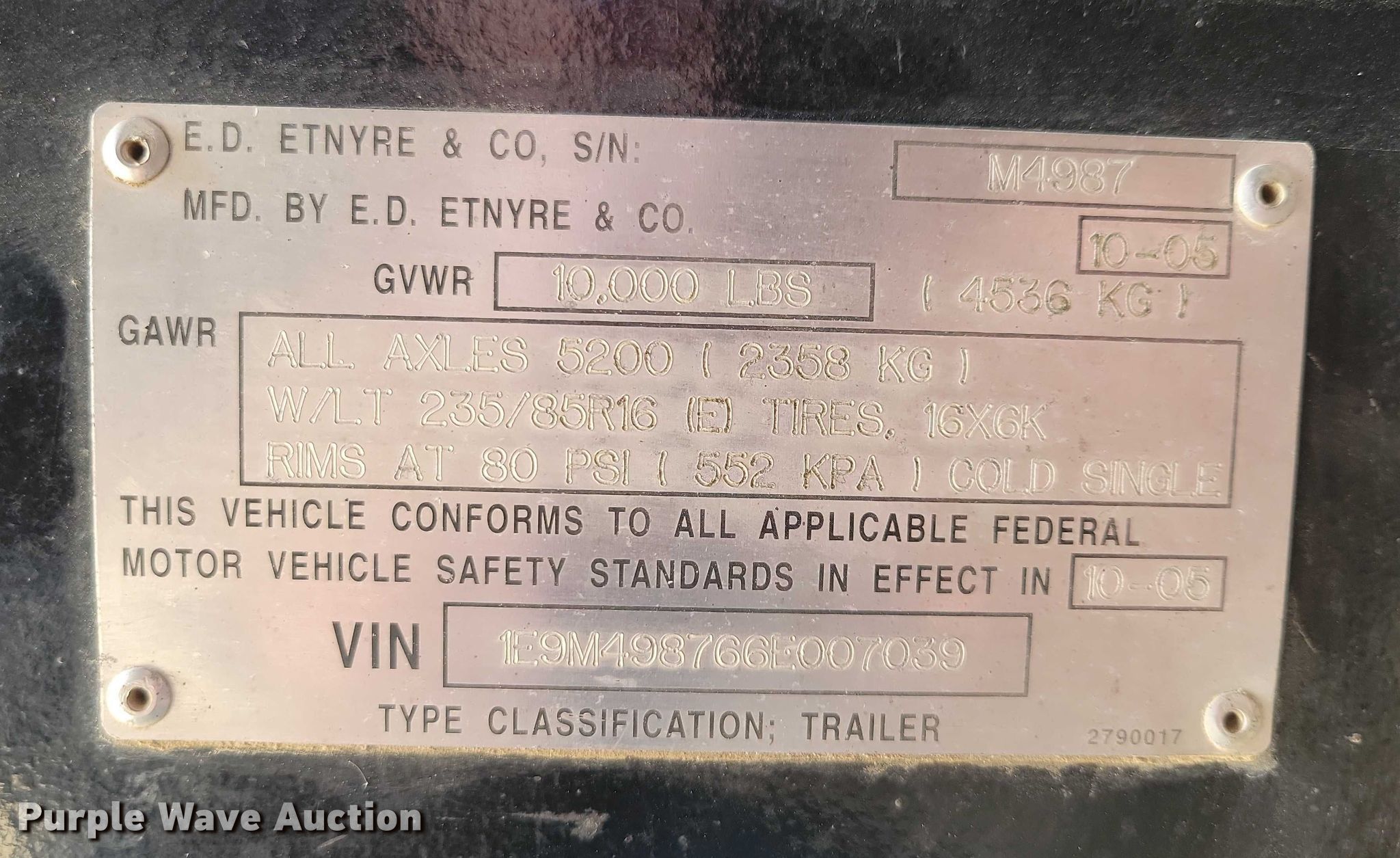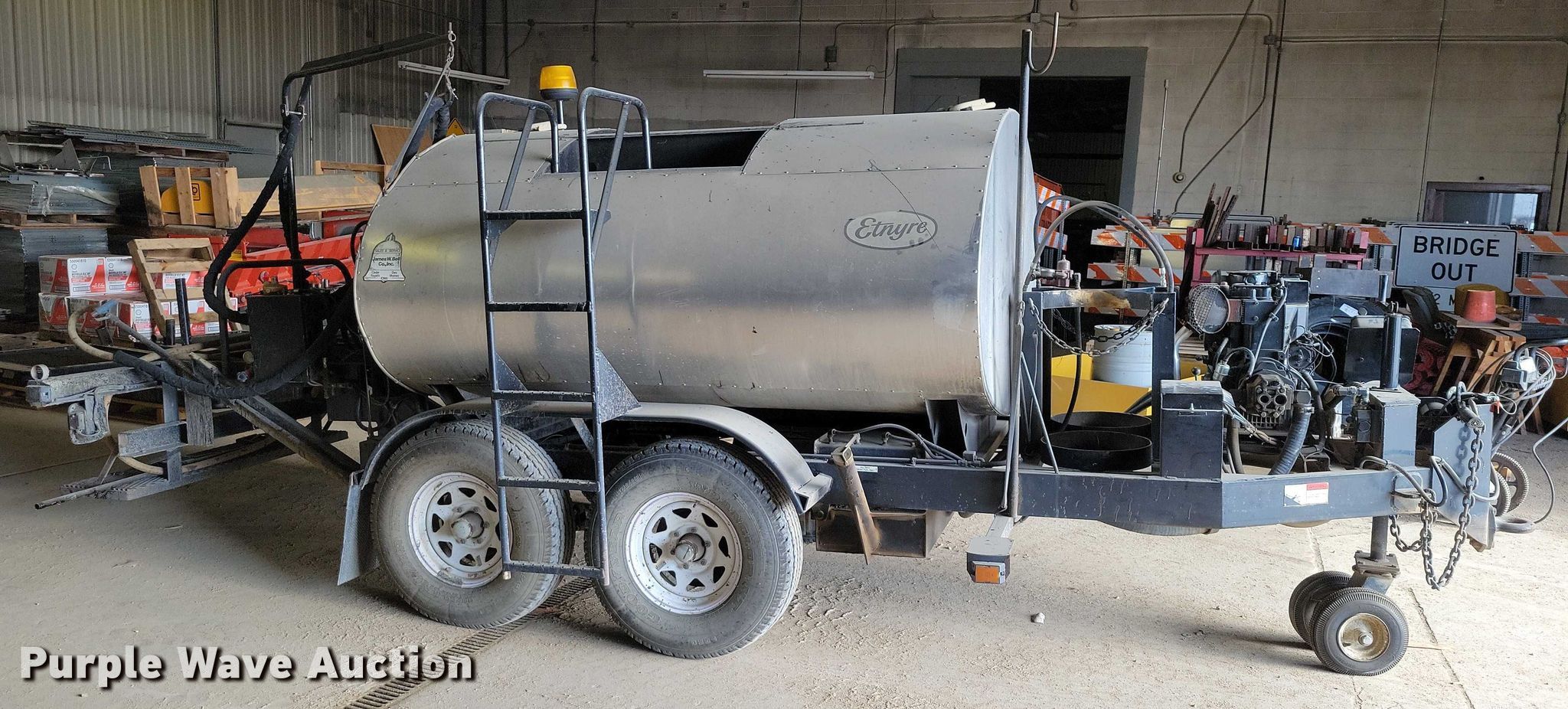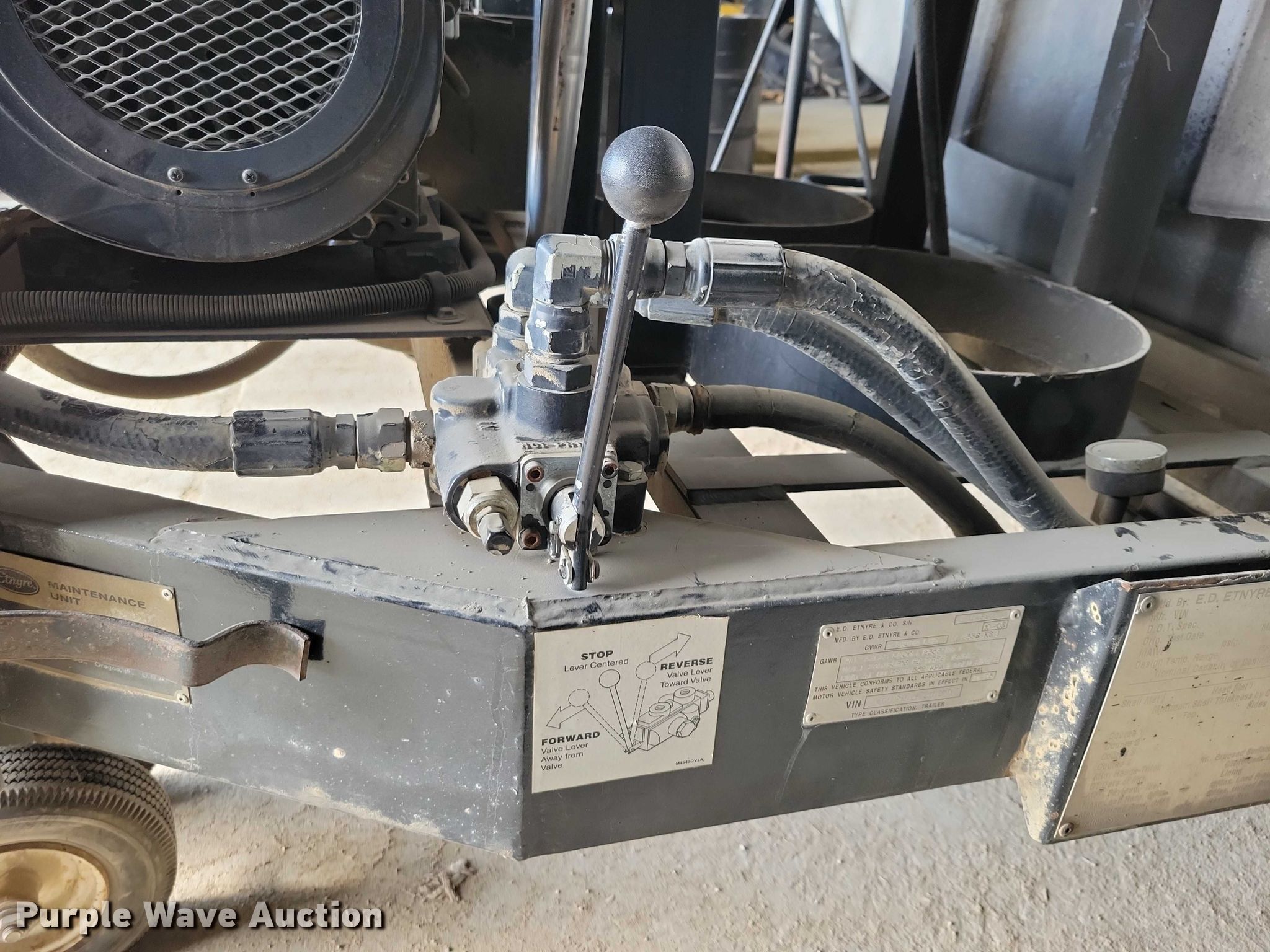 2005 Etnyre M4987 pothole patcher. Hours: 1,419 on meter, VIN: 1E9M498766E007039, Serial: M4987. Dimensions Overall Length: 19', Width: 89". Engine Hatz, Serial: D911B04036957, Cylinders: 2, Fuel type: Diesel, kW: 14.4. Tires Size: LT235/85R16. Notes Dead battery. This is worksite support equipment and will not come with a title. Transfer of ownership documentation will be a bill of sale. Buena Vista County, IA. Storm Lake, IA 50588