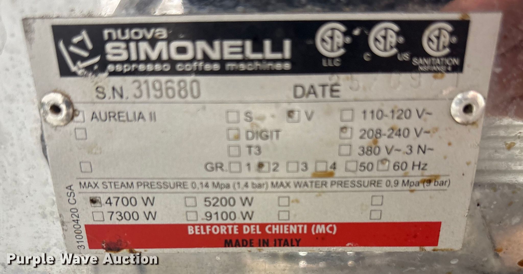 Purple Wave is selling a used Appliances in Iowa. This item is a 2012 Simonelli Aurelia II Espresso machine with the following: Serial: 319680