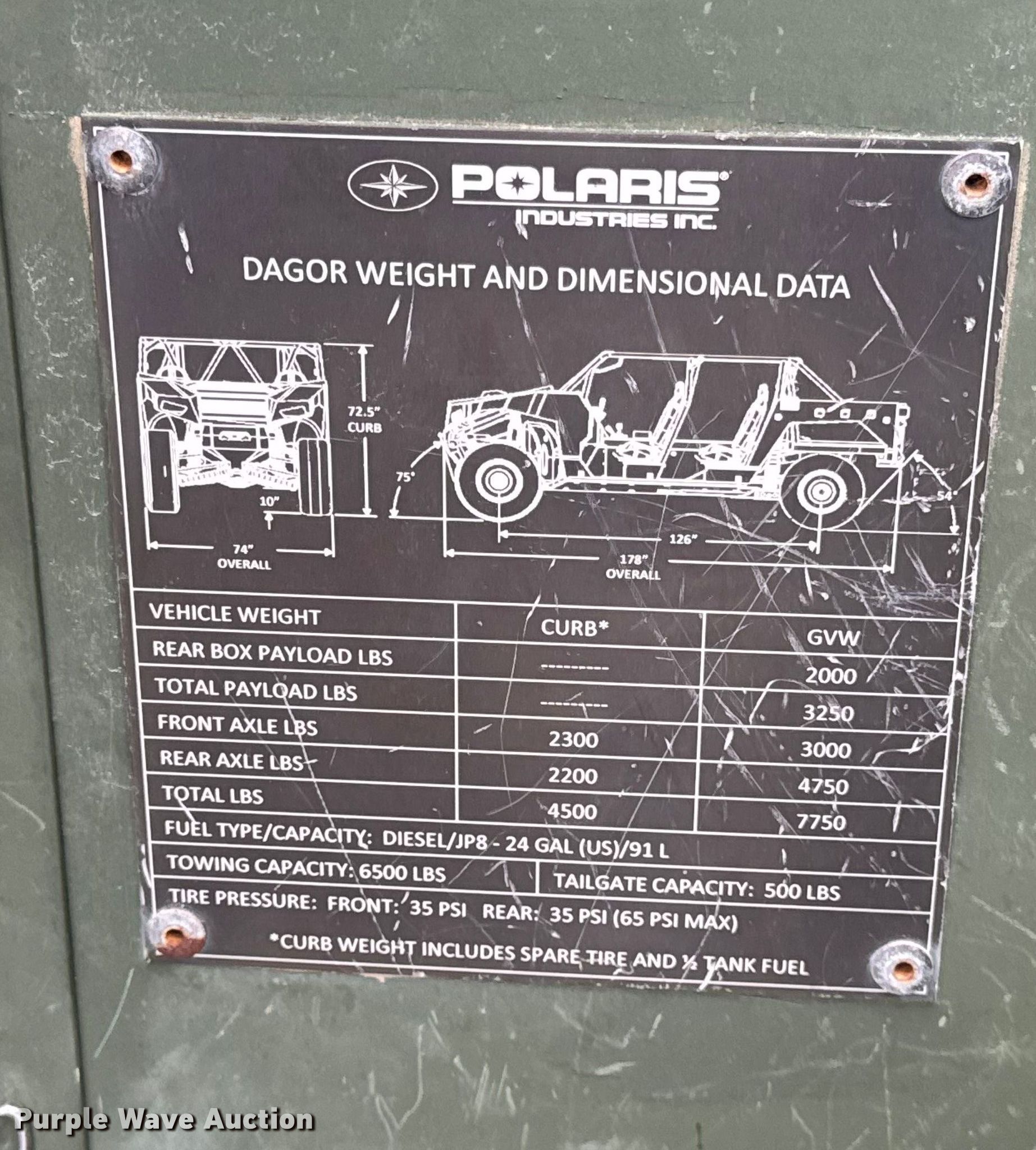 Take a look at this used 2015 Polaris Defense Dagor utility vehicle being sold on March 17th, 2026 in the Tuesday March 17 Government Auction made by Polaris Defense. Take a look at all of the item information below or take a look at similar auctions for ATV and Utility Vehicles.