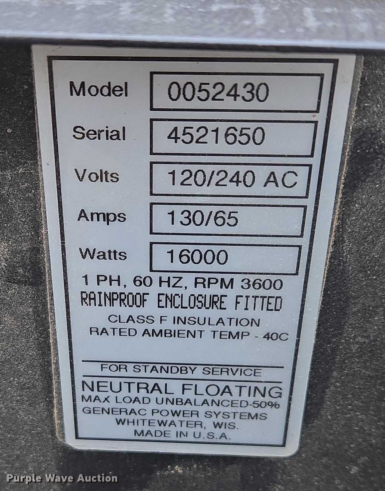 Purple Wave is selling a used Generator Set in Nebraska. This item is a Generac 0052430 generator with the following: Serial: 4241650