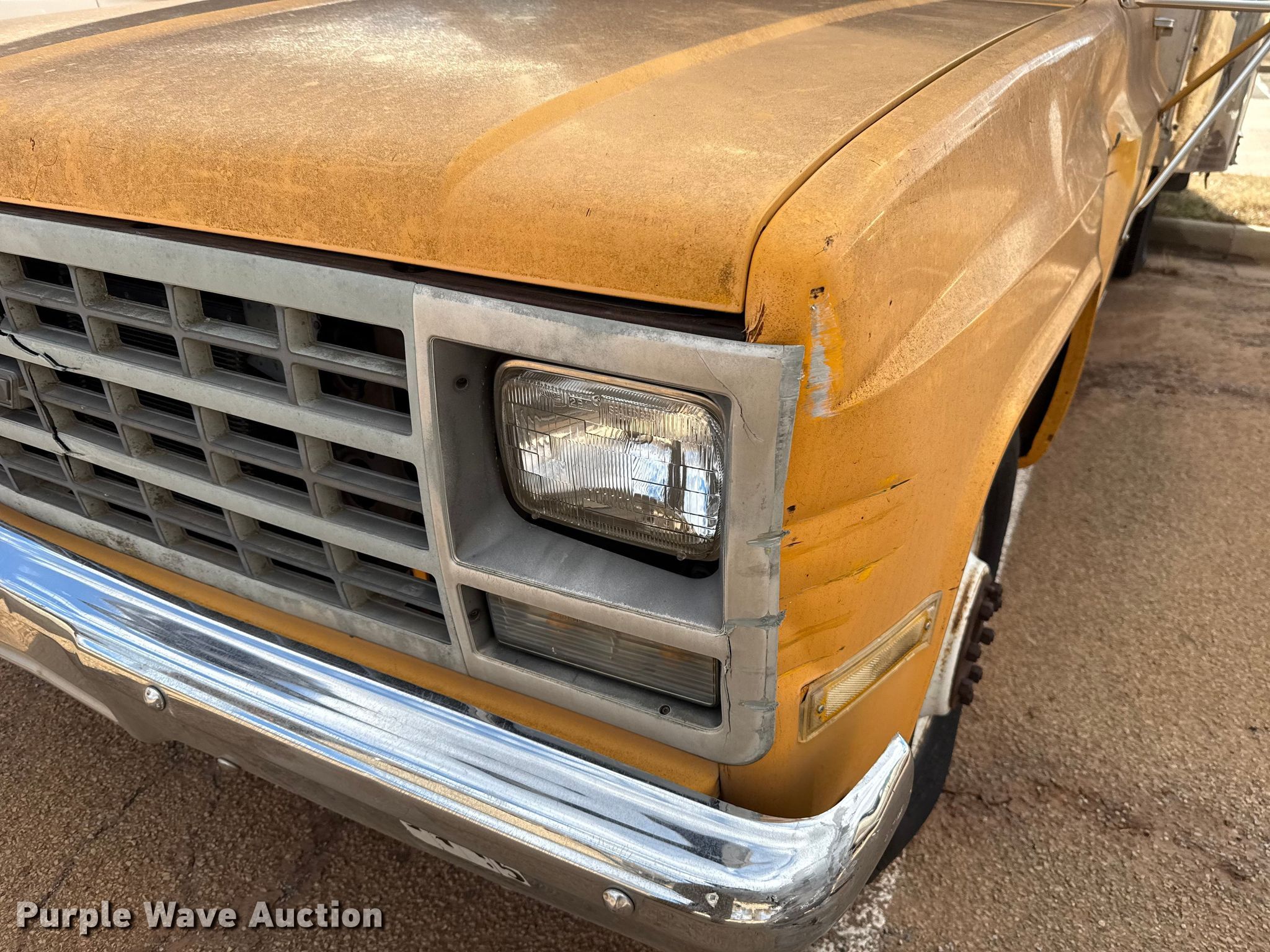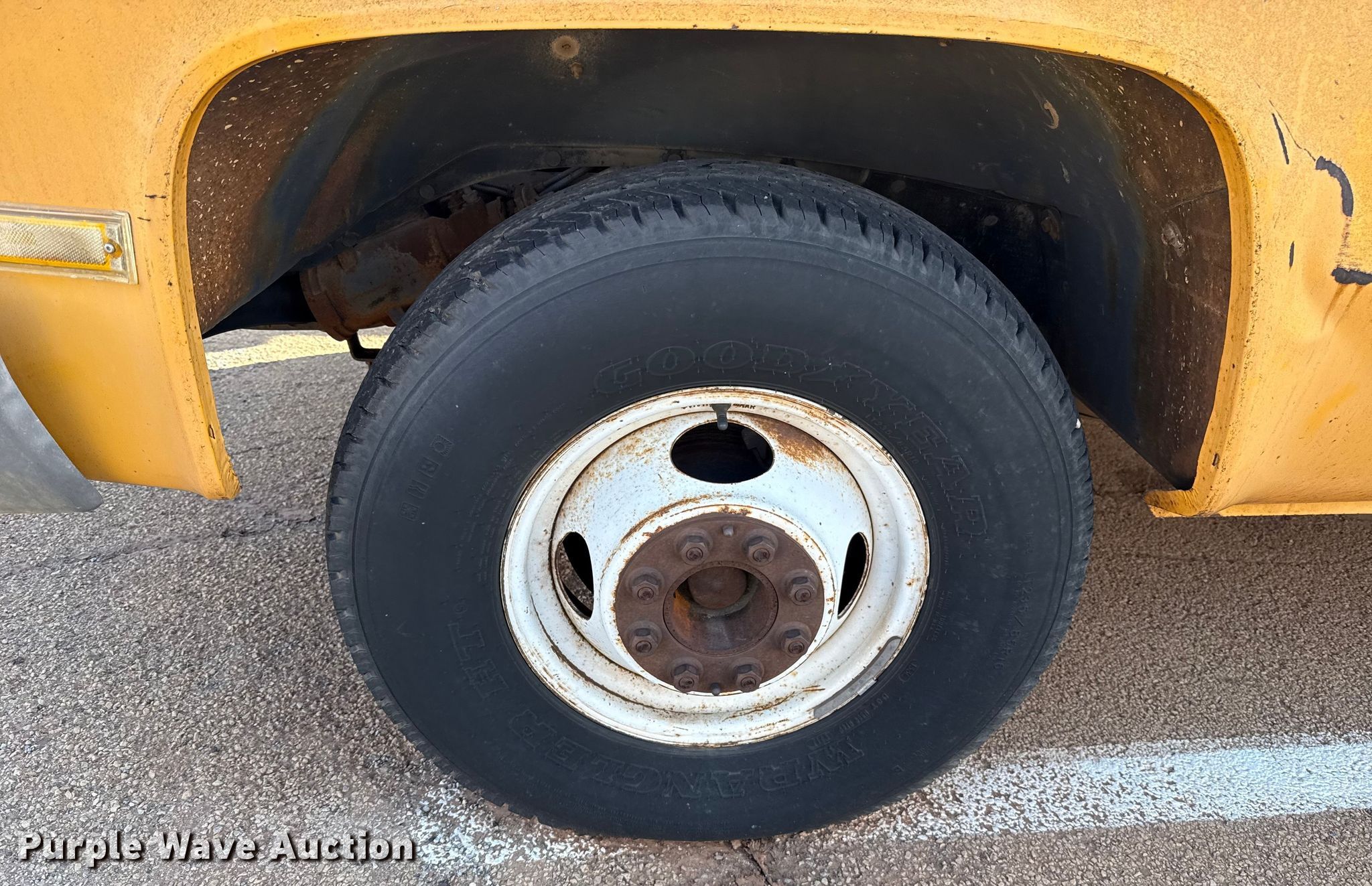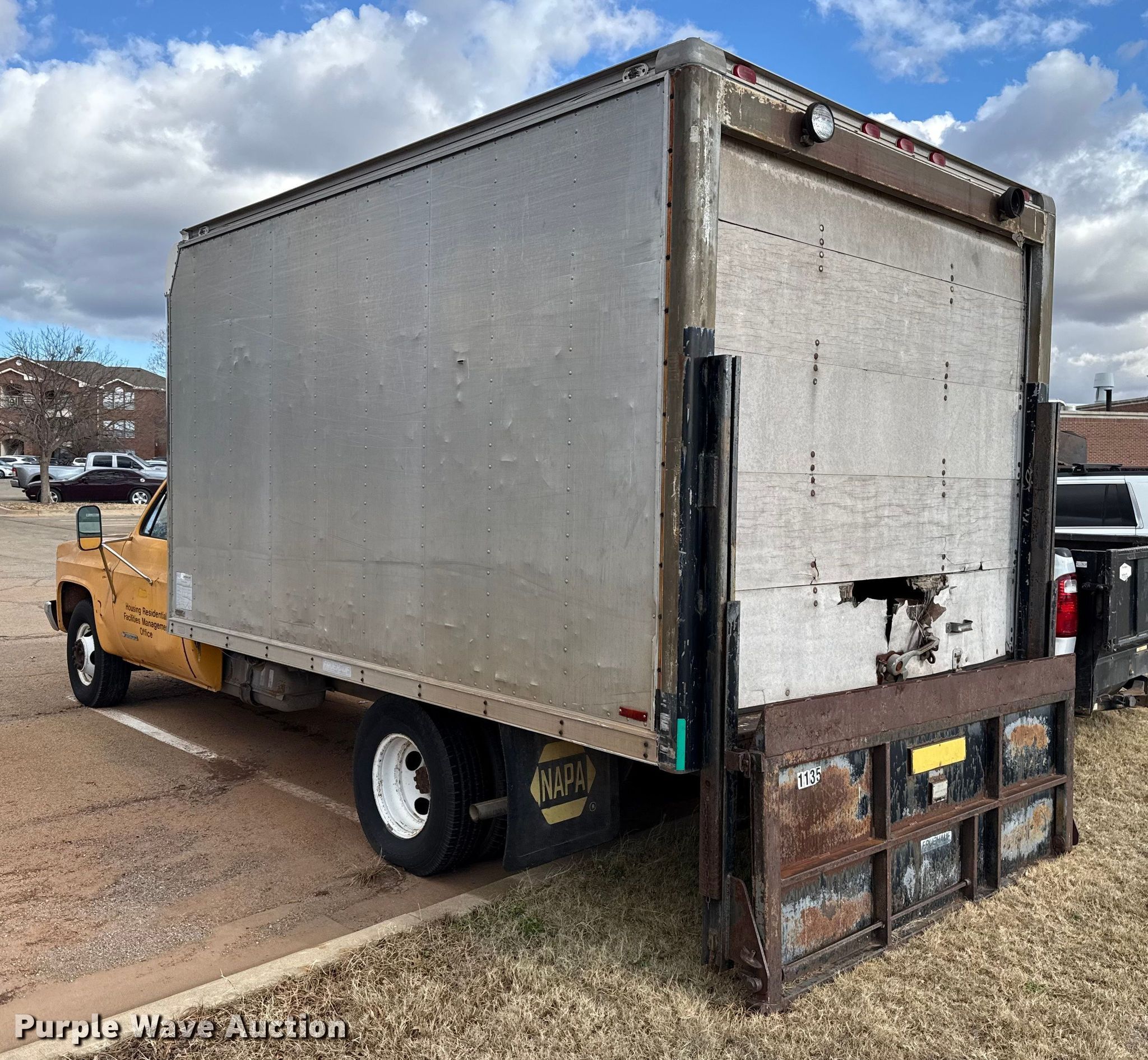 1989 Chevrolet Cheyenne 3500 box truck. Miles: 59,367 on odometer, VIN: 1GBJR34K1KJ117952, Unit #: 1135, Sale #: 2638-KP. Engine GMC, Displacement: 5.7L, Cylinders: 8, Fuel type: Gas. Transmission Automatic. Chassis Axles: Single, Suspension: Spring, Brakes: Hydraulic. Interior AC, Heat. Features Bed Box bed, Supreme Corp. K30685, Serial: VA12078096, Length: 12' 6", Width: 96", Height: 82", Floor: Wood, End gate lift, Maxon RCM-12A, Capacity: 1,250 lbs. Tires Size: LT235/85R16. Notes Jump start required during on-site data collection, Unknown operating condition of end gate lift, Air intake hose damaged, Front passenger tire leaks, Box bed rear door damaged, hole. Oklahoma title. Oklahoma State University. Stillwater, OK 74074