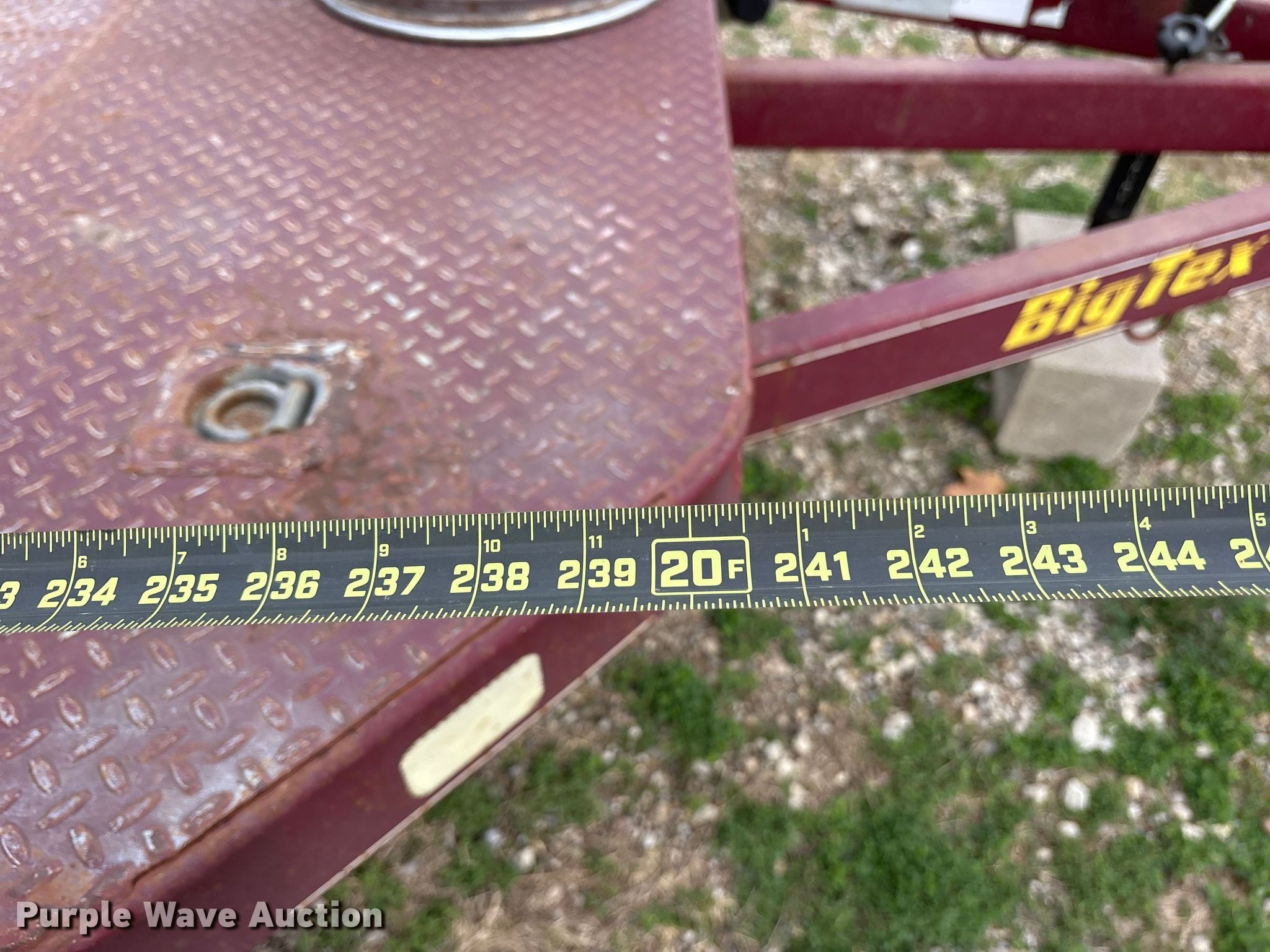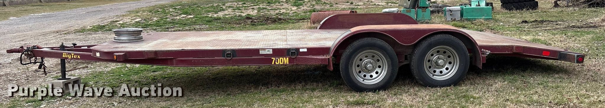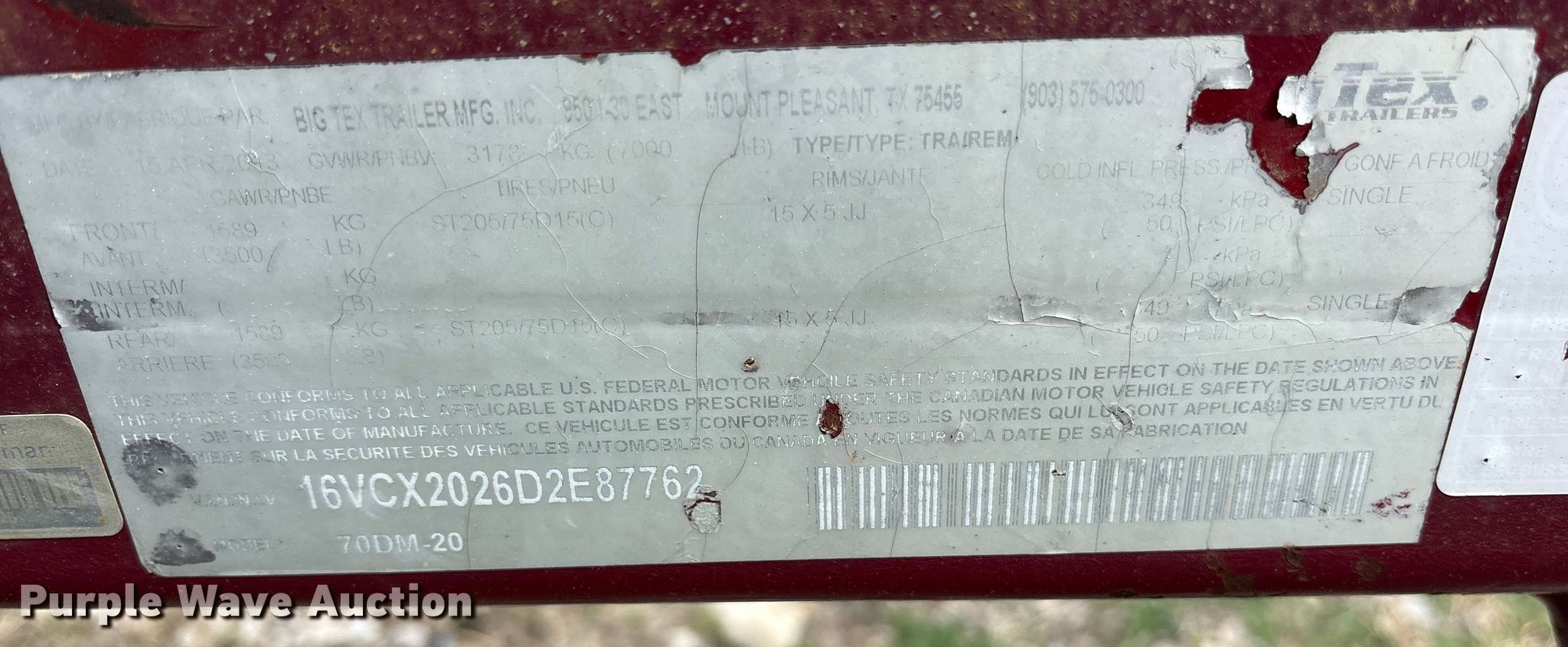 2013 Big Tex 70DM-20 utility trailer. VIN: 16VCX2026D2E87762. Dimensions Overall Length: 24' 6", Width: 8' 6", Deck Length: 20', Width: 7' 2", Deck height: 24", Ramps: Manual Length: 5'. Features Deck type: Steel. Chassis Ball hitch: 2", Landing gear: Single, Suspension: Spring, Brakes: Electric, Axles: Tandem, GVWR: 7,000 lbs, GAWR: 3,500 lbs. Tires Steel wheels, Size: ST205/75R15. Texas title. Title distribution may be delayed up to 14 days from verification of funds. City Of Sherman. Sherman, TX 75090