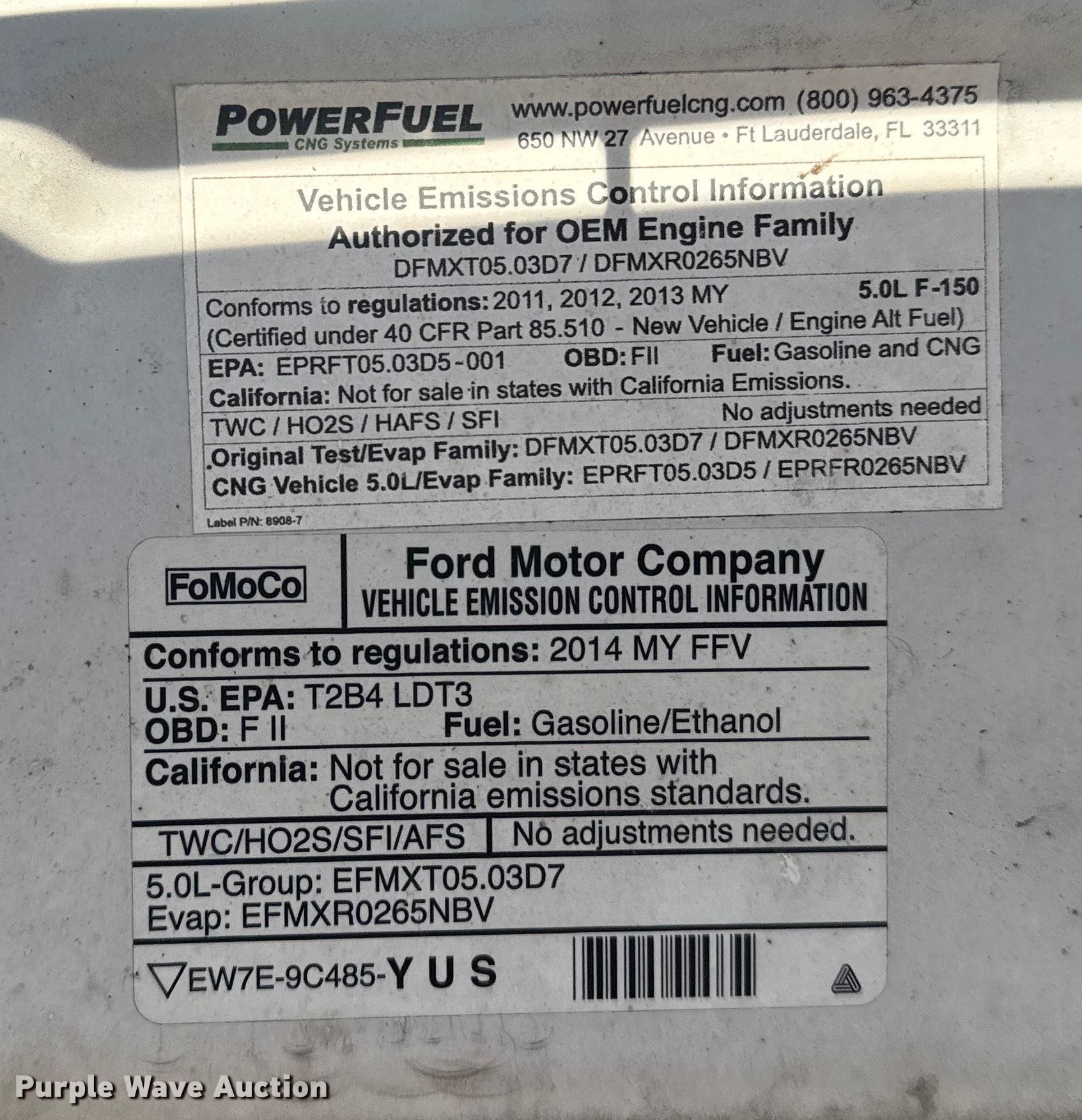 2014 Ford F150 pickup truck. Miles: 185,061 on odometer, VIN: 1FTNF1EF9EKE03042. Engine Displacement: 5.0L, Cylinders: 8, Fuel type: Gas, CNG. Transmission Automatic, Four wheel drive. Interior AC, Heat, Power windows, Power locks, Cruise control. Tires Size: LT245/75R17. Notes Dash warning indicator: TPMS. Oklahoma title. Title distribution may be delayed up to 30 days from verification of funds. Broken Arrow, OK 74012