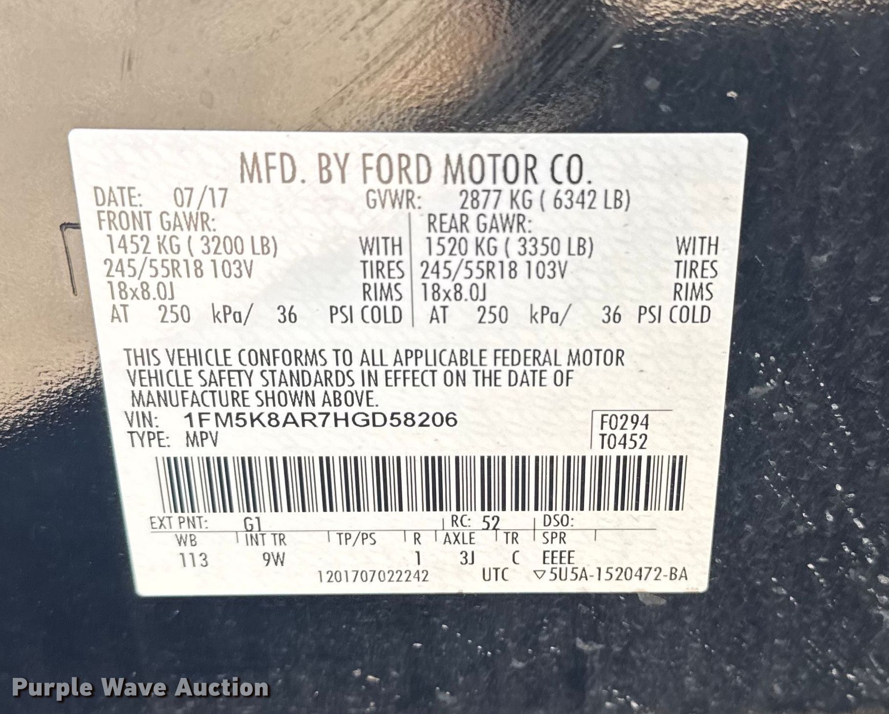 - VIN: 1FM5K8AR7HGD58206