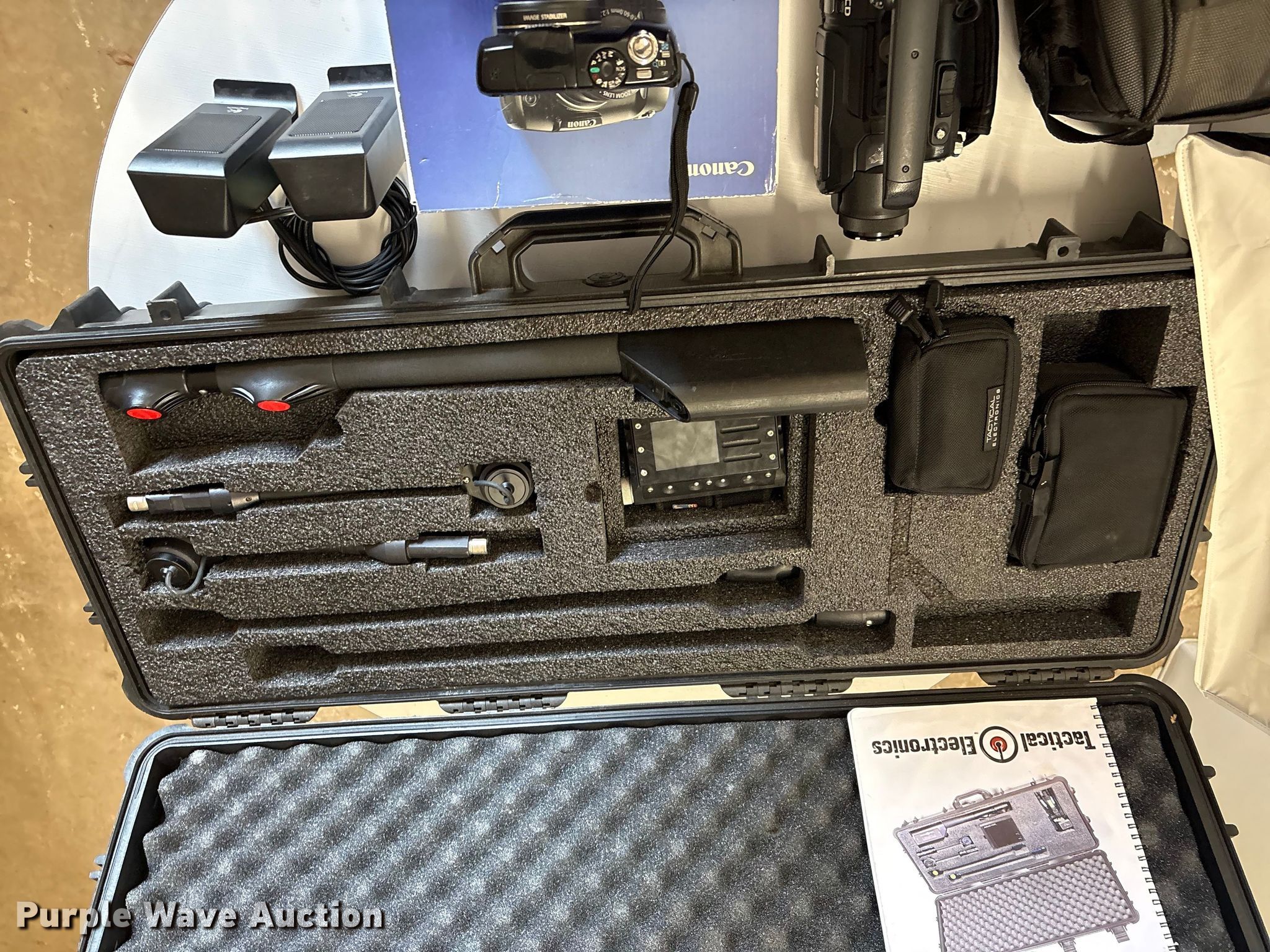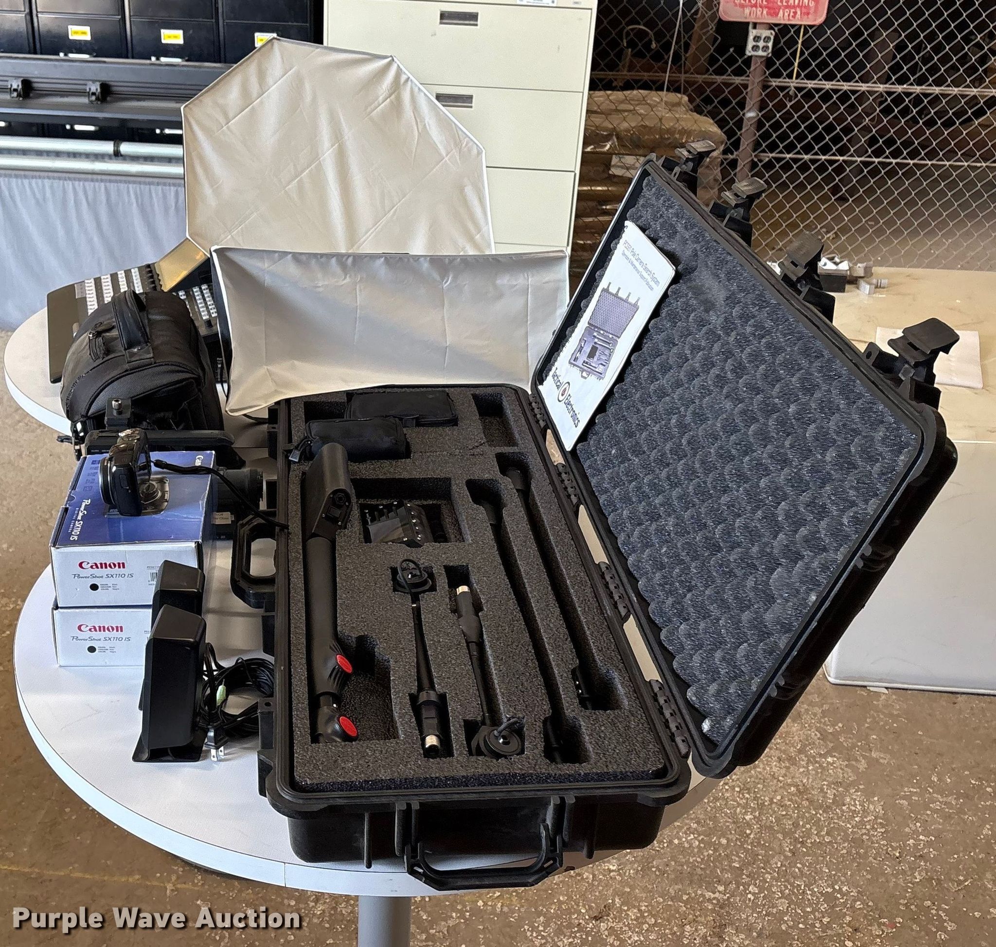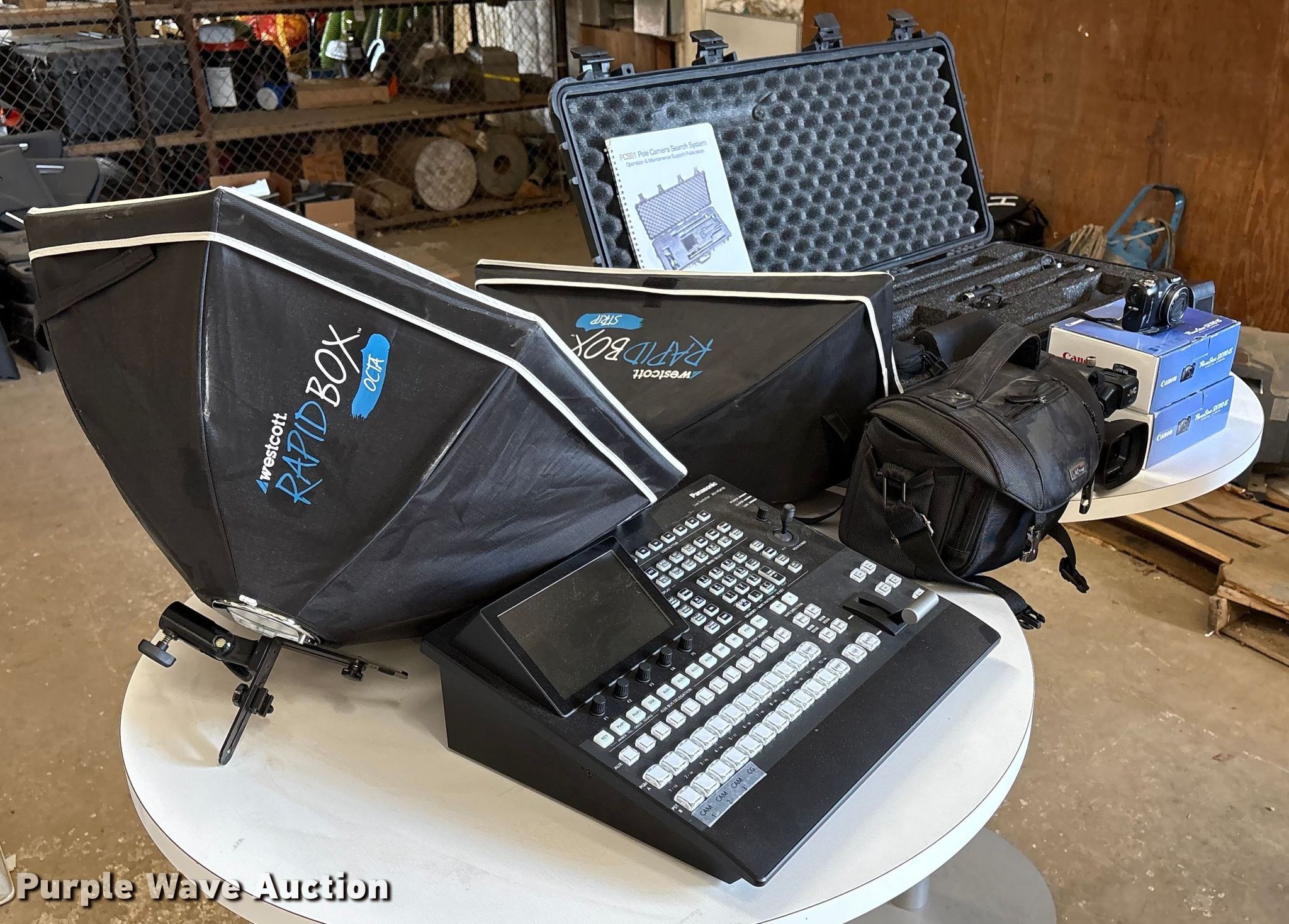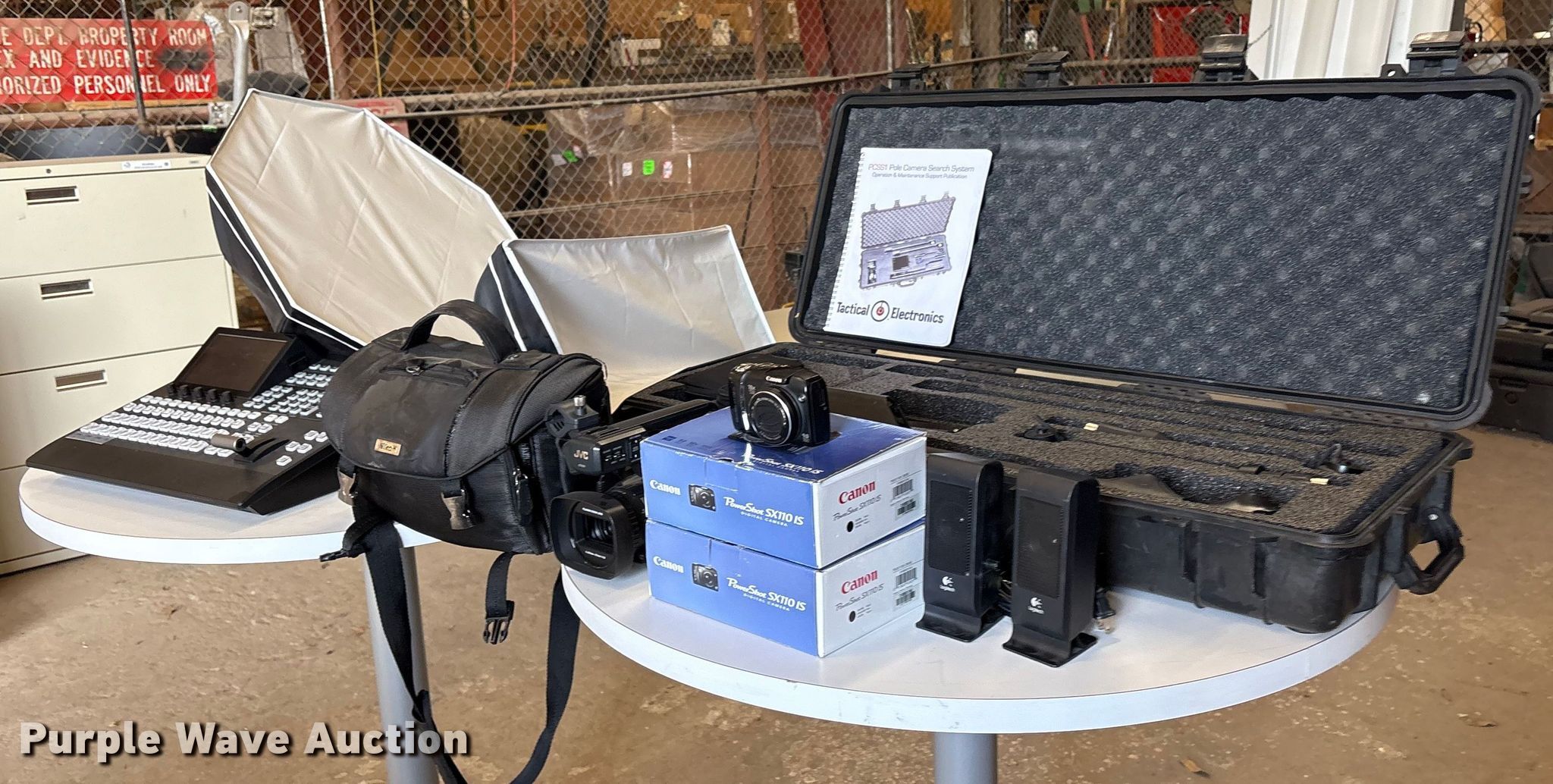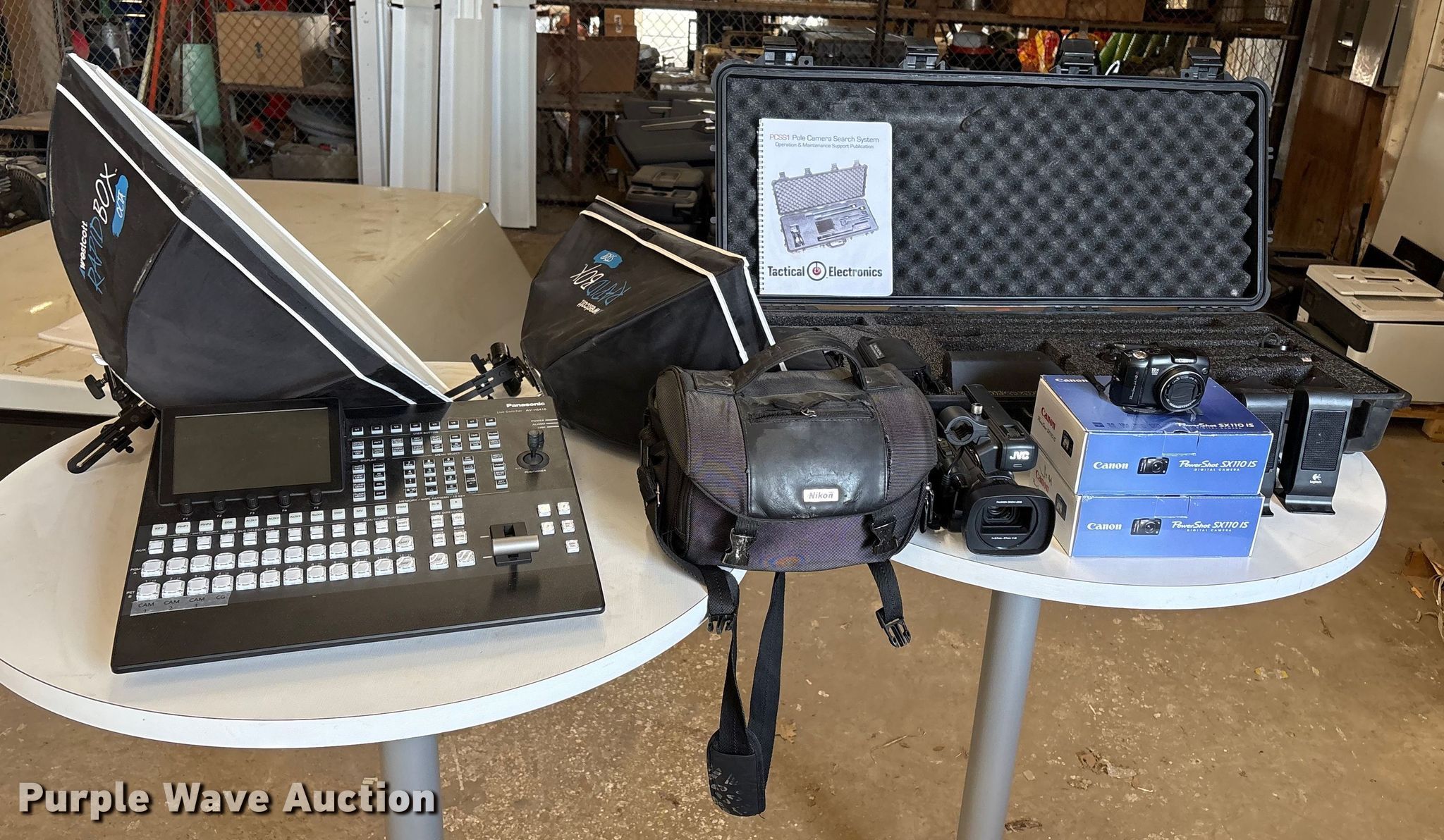 Purple Wave is selling a used Electronics in Oklahoma. This item is a Electronics with the following: (2) Canon Powershot SX110 IS, Computer speakers, JVC video camera, Panasonic AV-HS410 live switcher, (2) light diffusers, Tactical Electronics PCSS1 pole camera search system