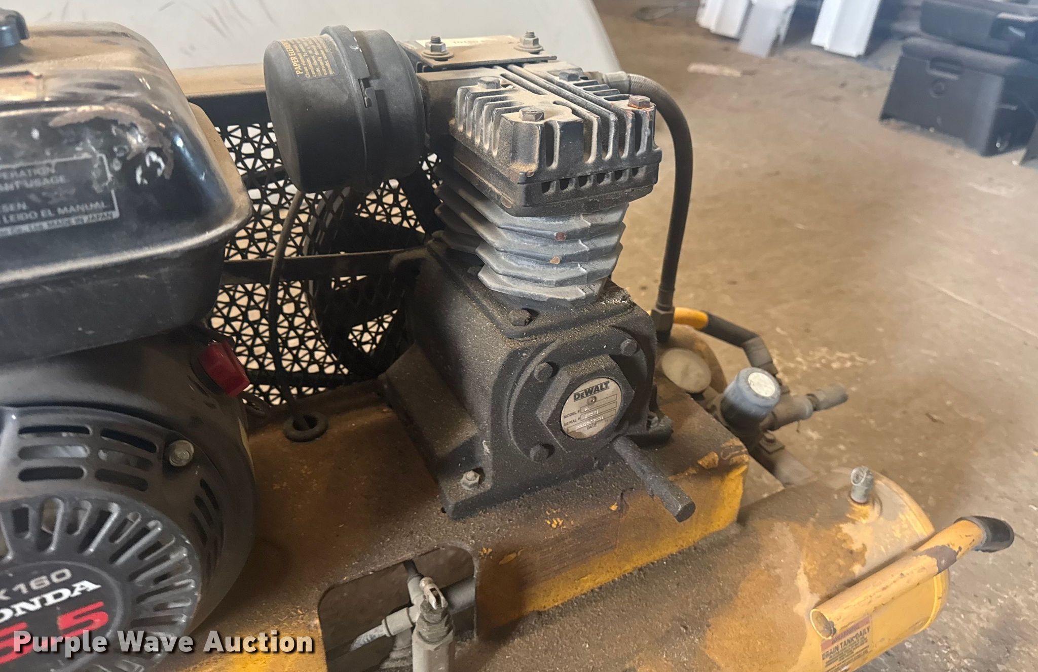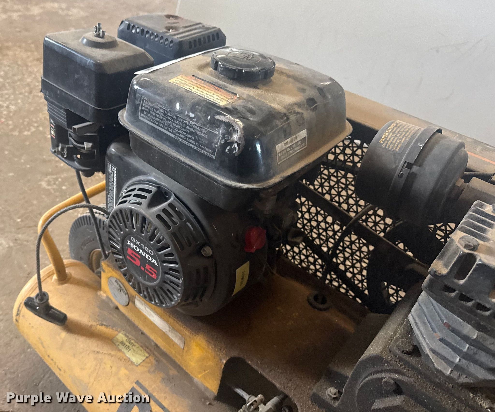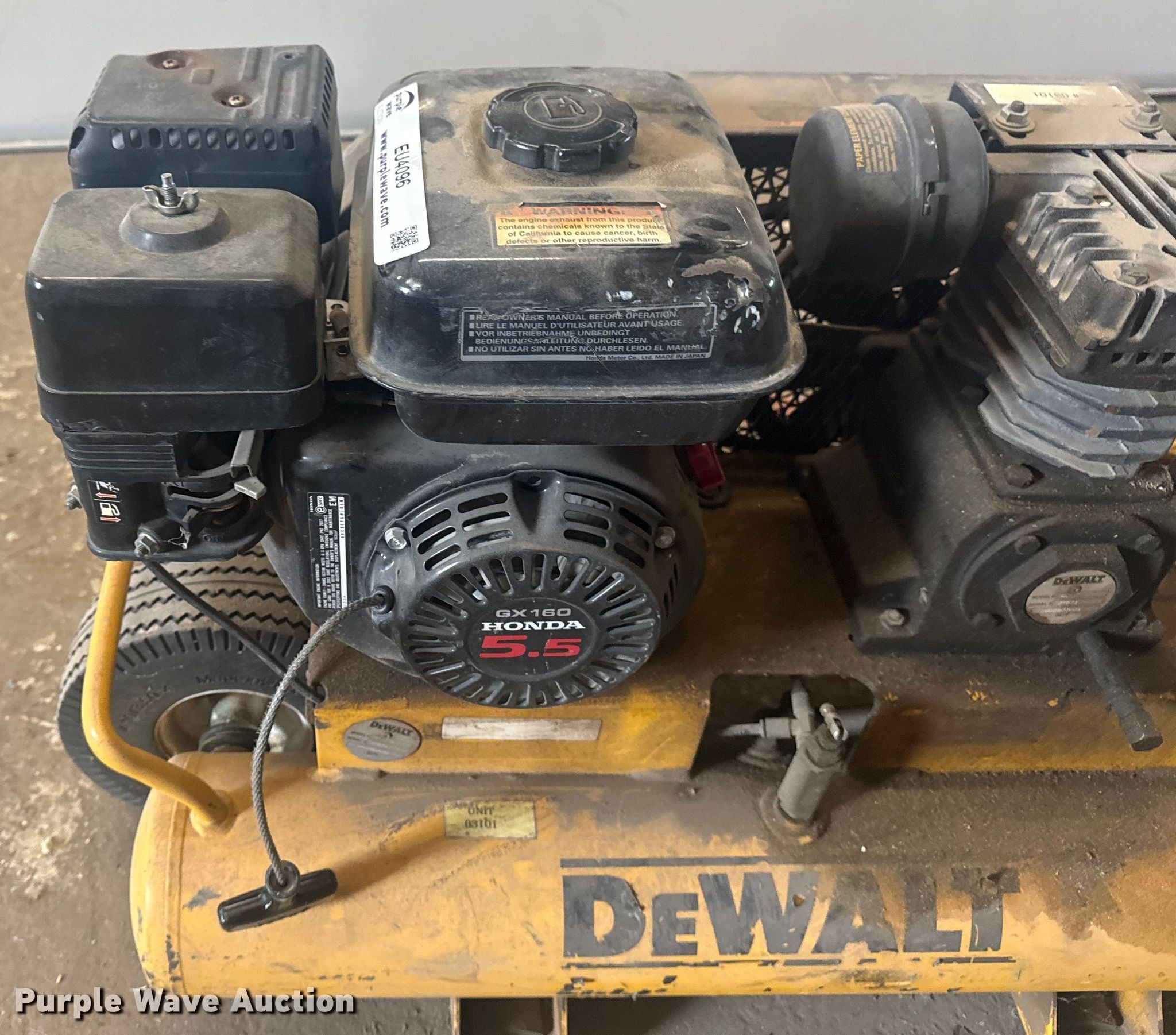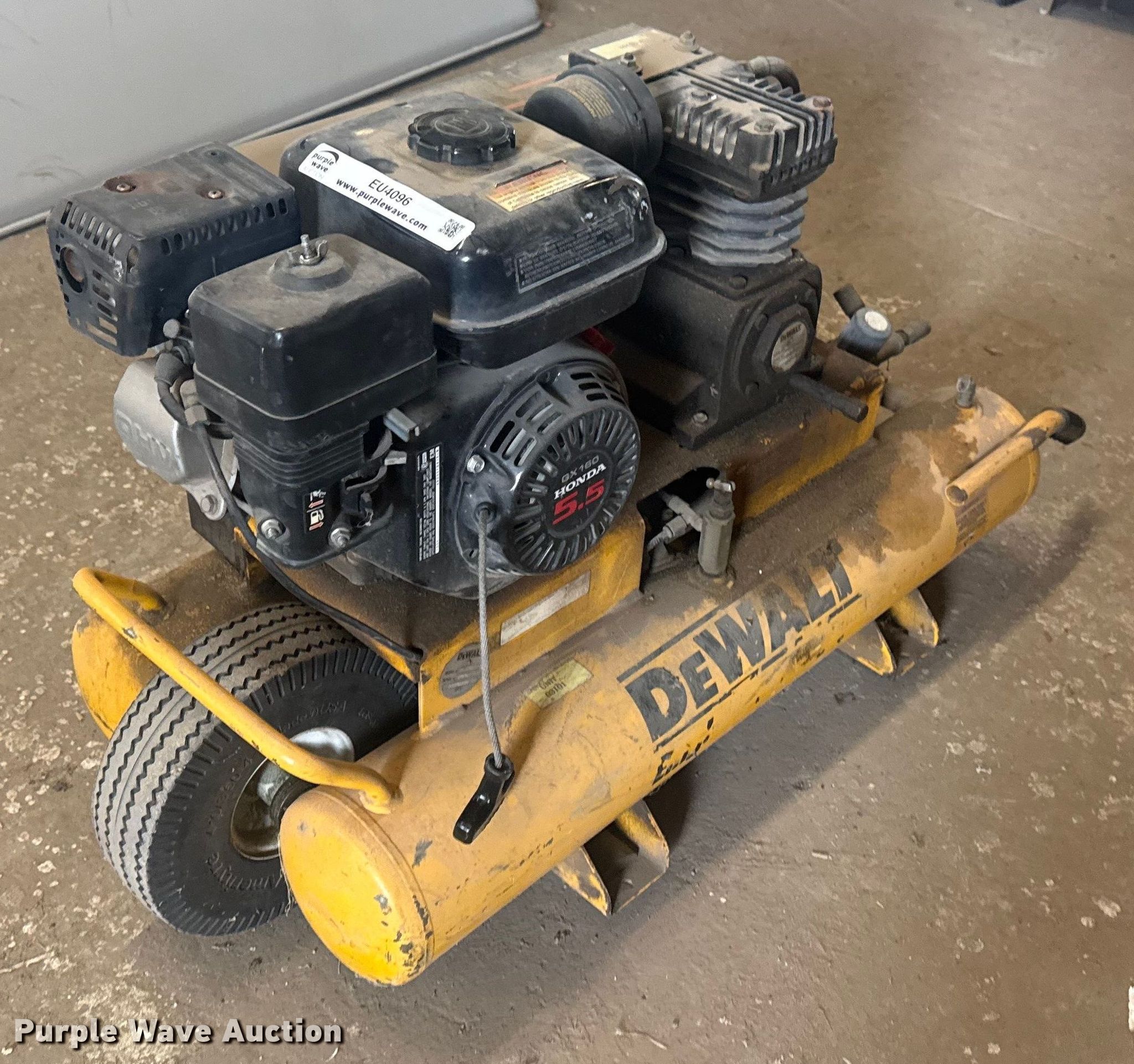 Purple Wave is selling a used Air Compressor in Oklahoma. This item is a Dewalt air compressor with the following: Honda GX160, Displacement: 163 cc, Cylinders: 1, Fuel type: Gas, HP: 5
