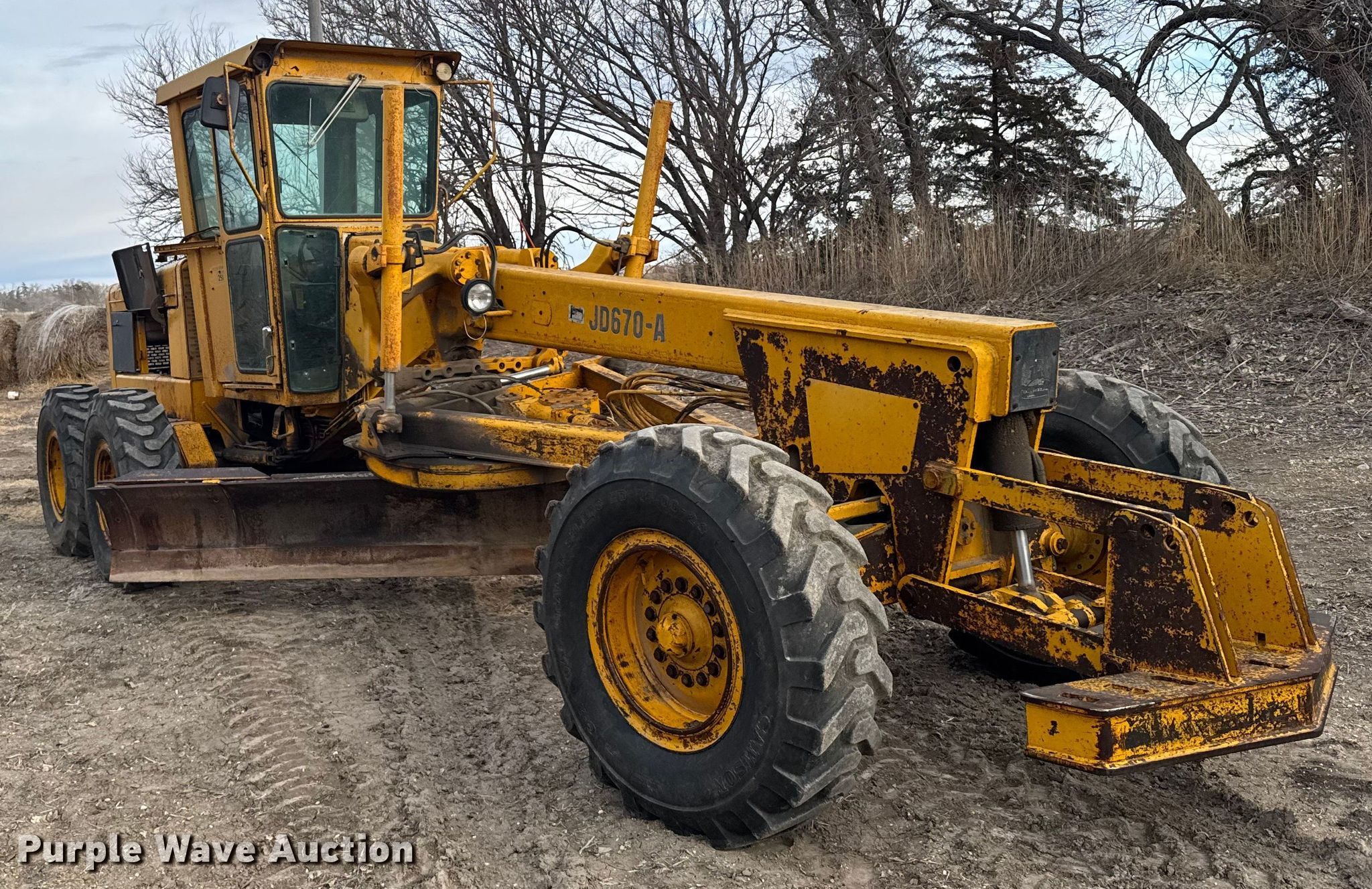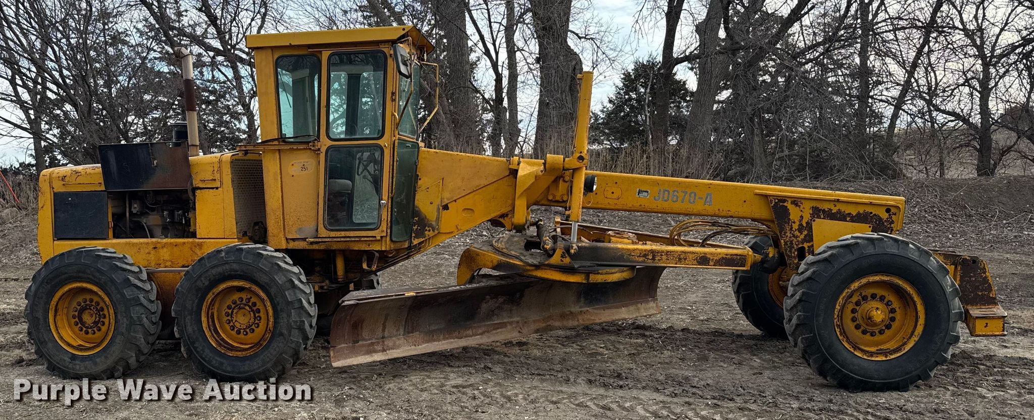 Purple Wave is selling a used Motor Grader in Kansas. This item is a John Deere 670-A motor grader with the following: Hours: 3,368 on meter, Hours: Unknown, Serial: 071441