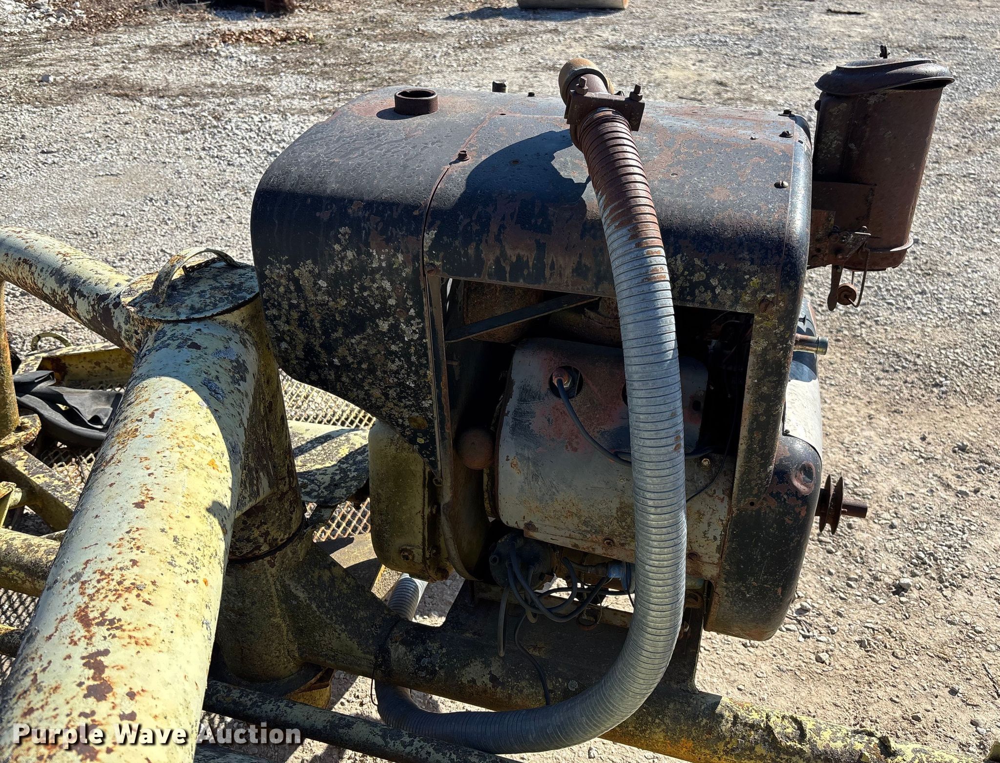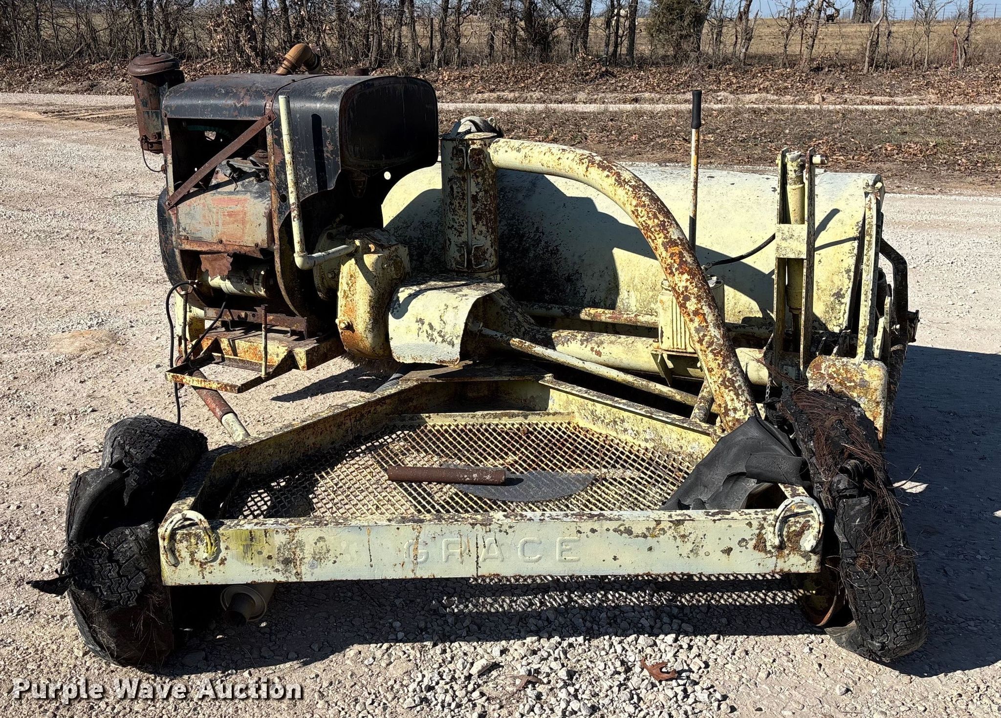 W.E. Grace pull behind broom. Serial: MB-105-1309. Engine Cylinders: 2, Fuel type: Gas. Features Broom Width: 84". Notes Tires need replaced, Non-operational unit. Dade County. Everton, MO 65646