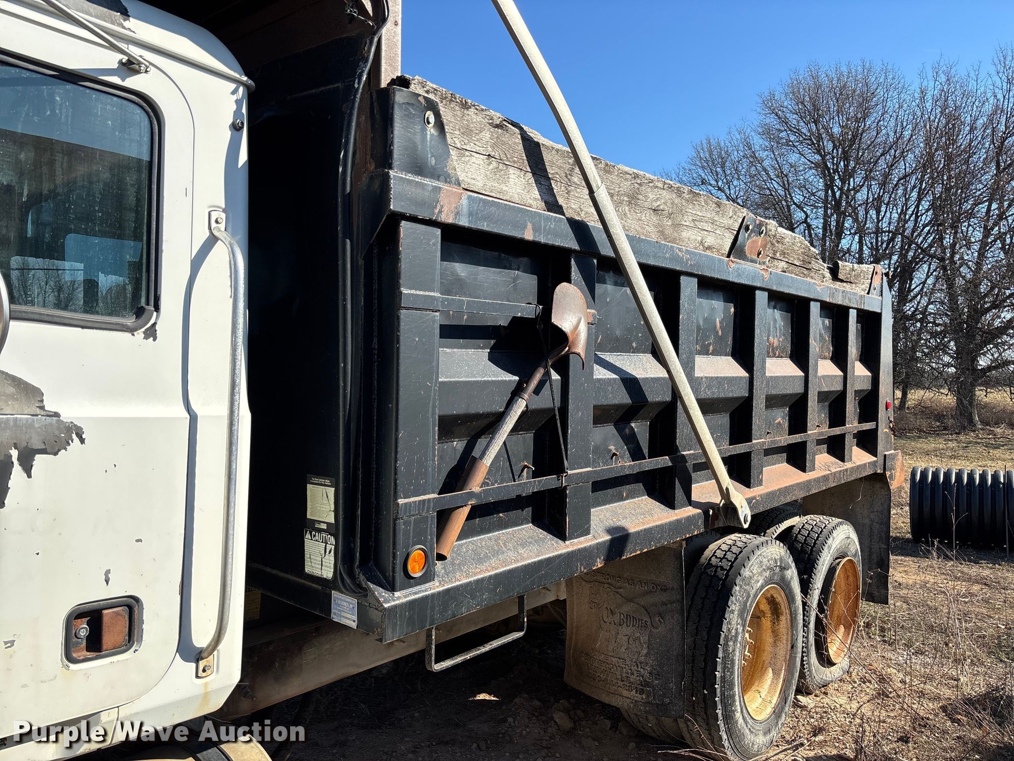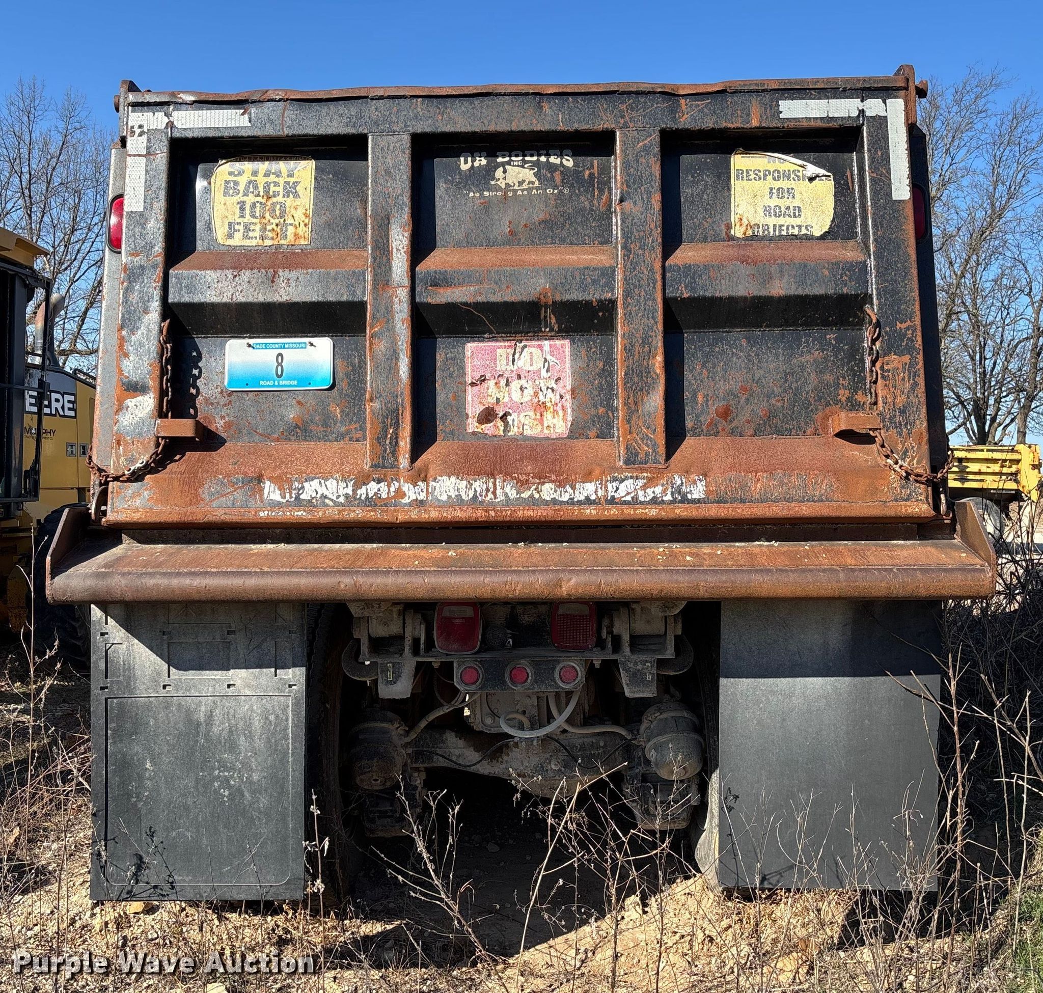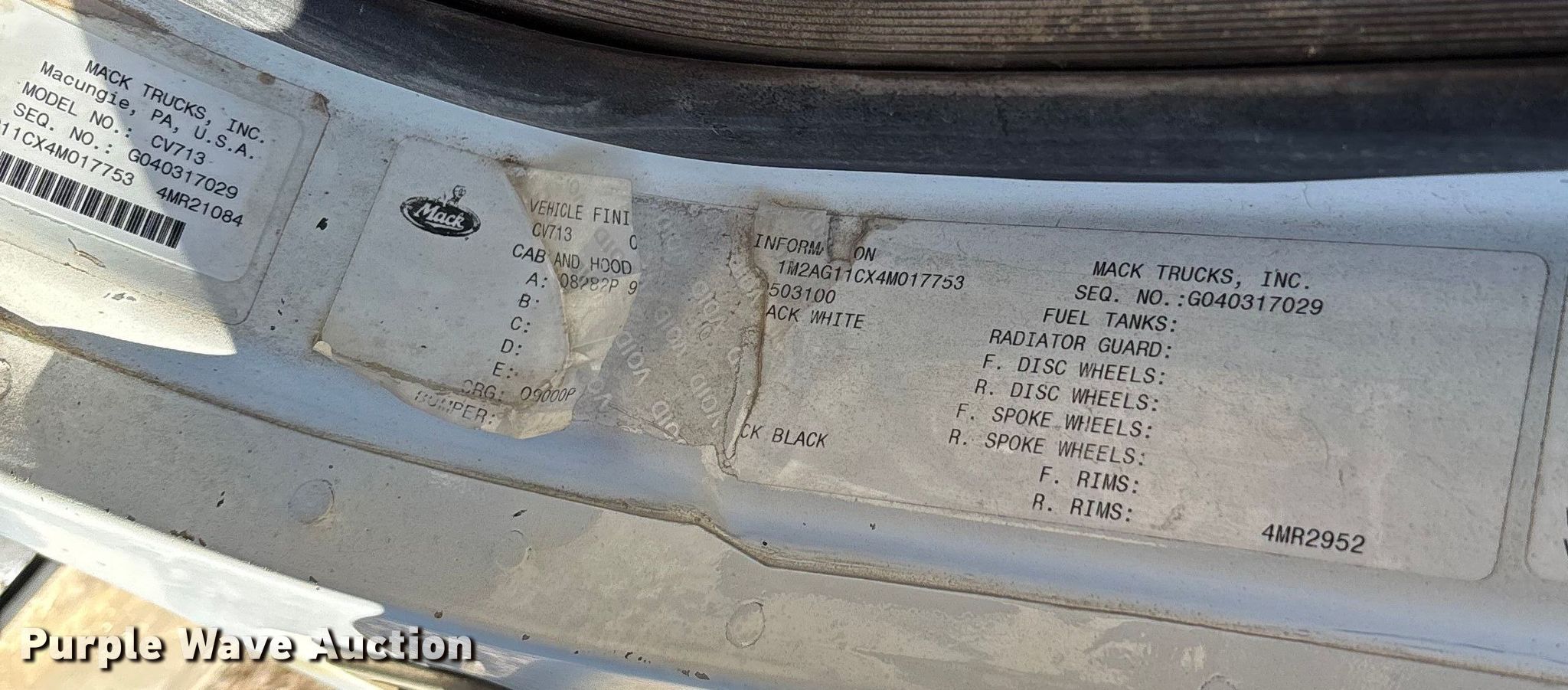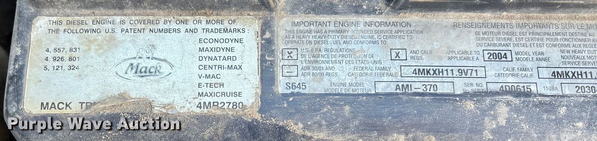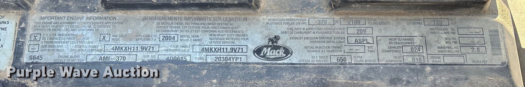 2004 Mack CV713 dump truck. Miles: Unknown, VIN: 1M2AG11CX4M017753. Engine Mack AMI-370, Displacement: 12.0L, Cylinders: 6, Fuel type: Diesel. Transmission Manual, Speed: 10. Chassis Axles: Tandem, Differential lock: Inter-axle, Suspension: Camelback, Brakes: Air, PTO, Wheelbase: 210". Interior AC, Heat, Cruise control. Features Bed Dump bed, Ox Bodies, Serial: 404852AL, Length: 15' 6", Width: 8', Capacity: 16 cu.yd., Side height: 42", Side board height: 9", Bed type: Steel, Roll tarp, Ram: Single, End gate: Air operated. Tires Front: 315/80R22.5, Rear: 11R24.5. Notes Windshield chipped or cracked, Possible electrical issues, Non-operational unit. Missouri title. Mileage has not been verified. Exempt will be written in the odometer disclosure on the title. Title distribution may be delayed up to 30 days from verification of funds. Dade County. Everton, MO 65646