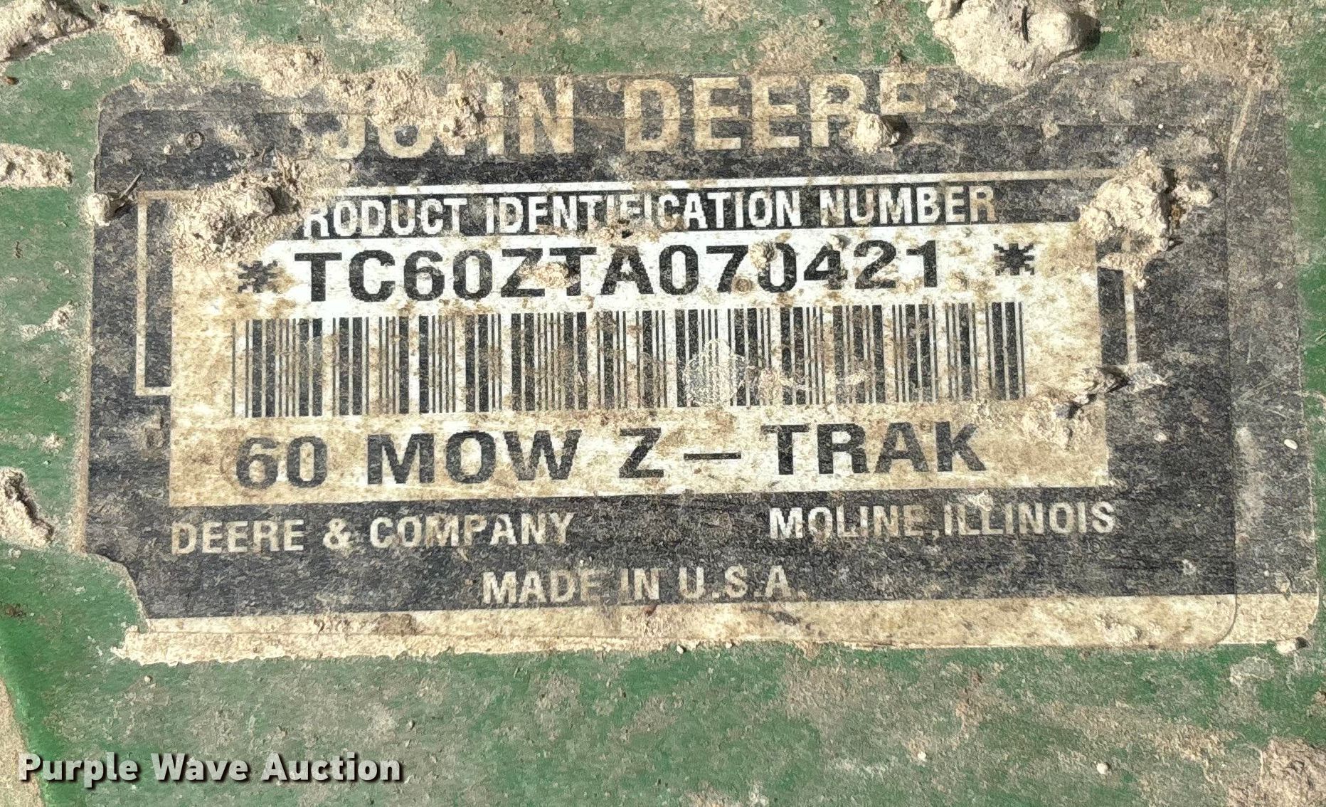 Purple Wave is selling a used Commercial Turf Mower in Kansas. This item is a John Deere F687 ZTR lawn mower with the following: Hours: 997 on meter, Cutting width: 60", Serial: TCF687X050652
