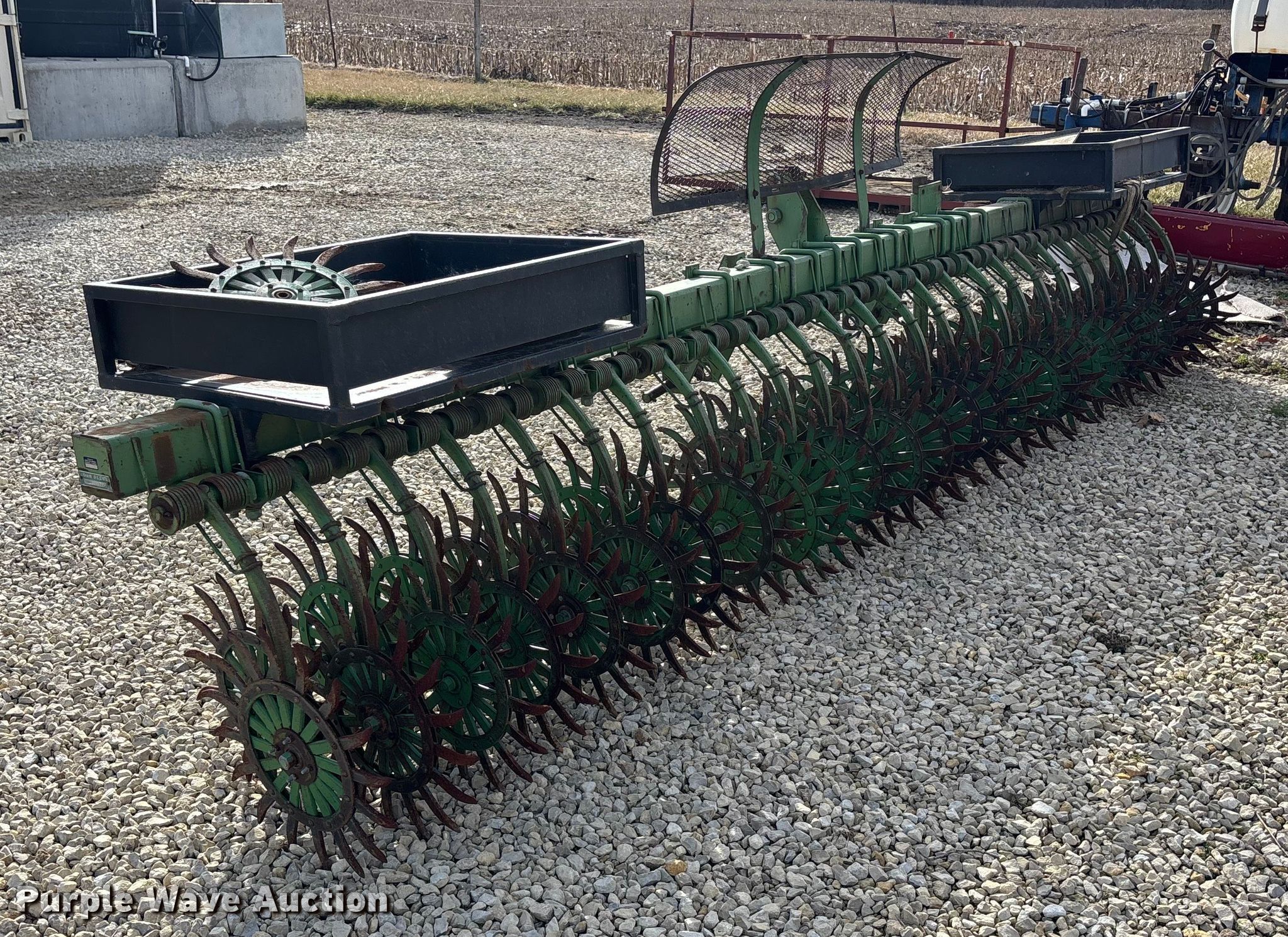 John Deere E0400 rotary hoe. Overall width: 15', Serial: 063363N. Features Diameter: 16", Spacing: 3", Hitch: Three point. Kansas State University Agronomy Farm. Manhattan, KS 66502