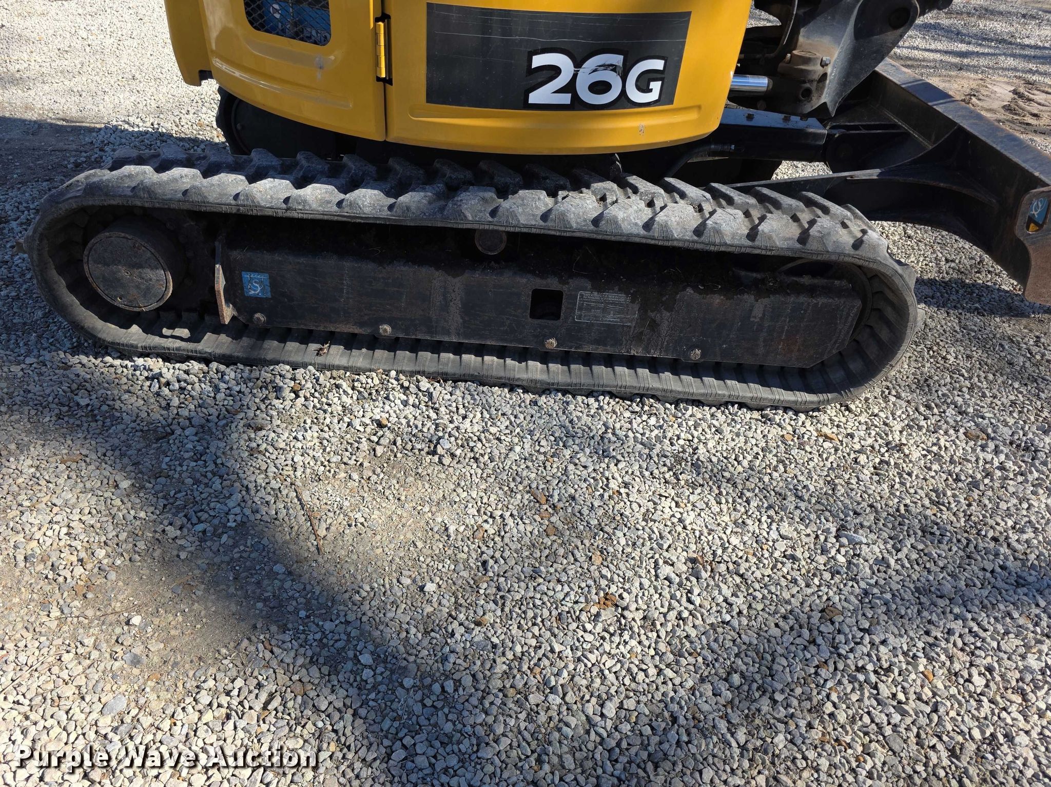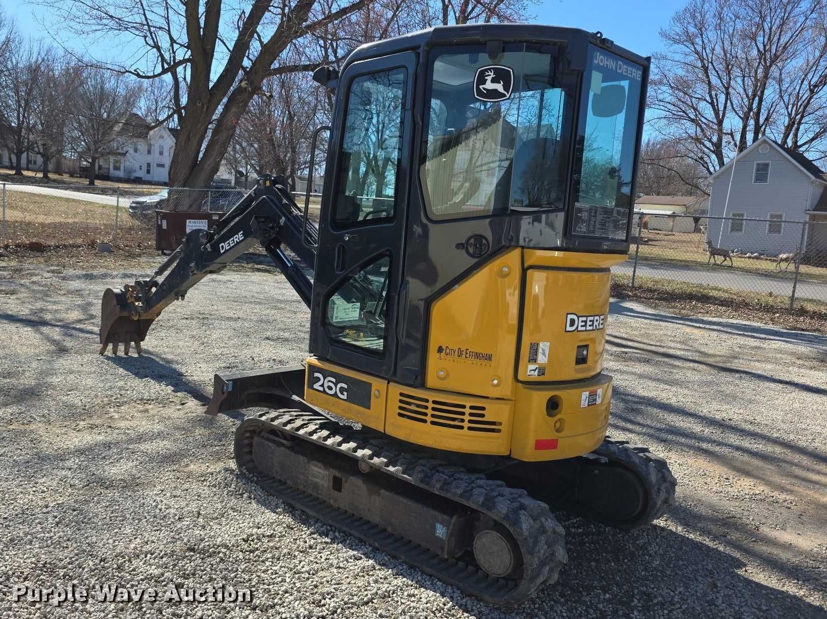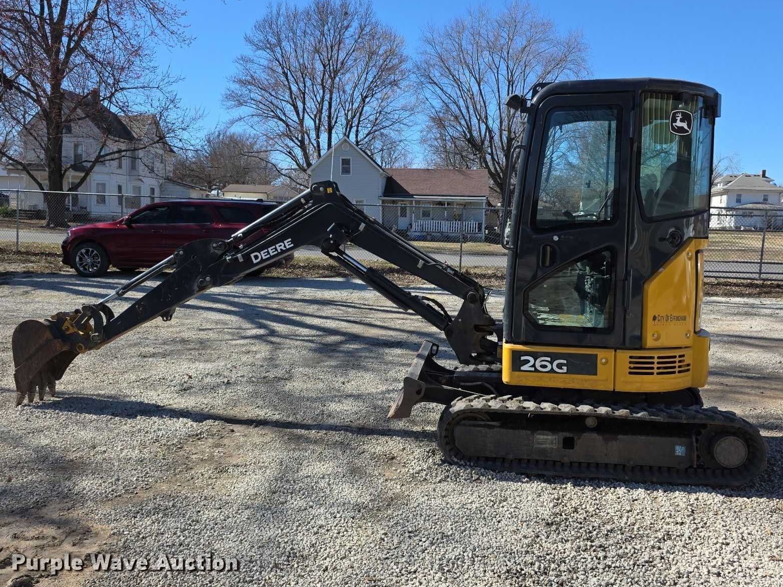 Purple Wave is selling a used Mini Excavator in Kansas. This item is a 2017 John Deere 26G mini excavator with the following: Hours: 397 on meter, Serial: 1FF026GXC6K262558