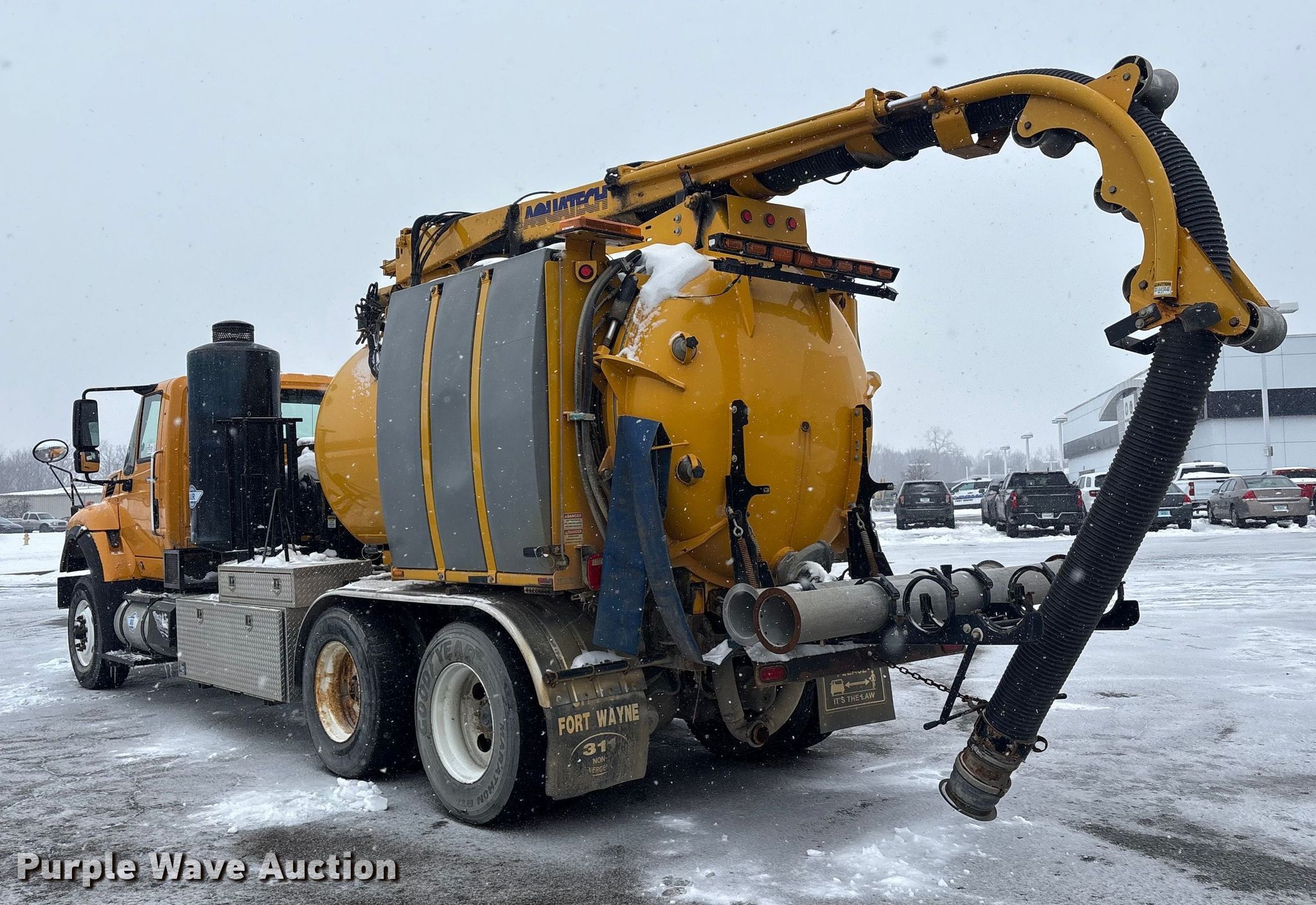 2013 International 7500 hydrovac truck. Miles: 83,387 on odometer, Hours: 11,670 on meter, VIN: 1HTWNAZT1DH329220. Engine International, Displacement: 9.34L, Cylinders: 6, Fuel type: Diesel. Transmission Allison, Automatic. Chassis Axles: Tandem, Differential lock: Full, Suspension: Spring over walking beam, Brakes: Air, PTO, GVWR: 62,000 lbs. Interior AC, Heat, Heated mirrors, Power windows, Cruise control, Auxiliary controls. Features Bed Aquatech CB-10, Serial: 20121080, Vacuum pump Roots 824 RCS, Serial: 0611938703, Hose reel Telescopic boom Diameter: 8", Remote control. Tires Front: 315/80R22.5, Rear: 11R22.5. Notes Jump start required during on-site data collection, Non-operational vacuum system, pump missing. Indiana title. Seller is a government entity who will be assigning and distributing the title. Please contact the seller for distribution questions. City of Fort Wayne. Fort Wayne, IN 46804