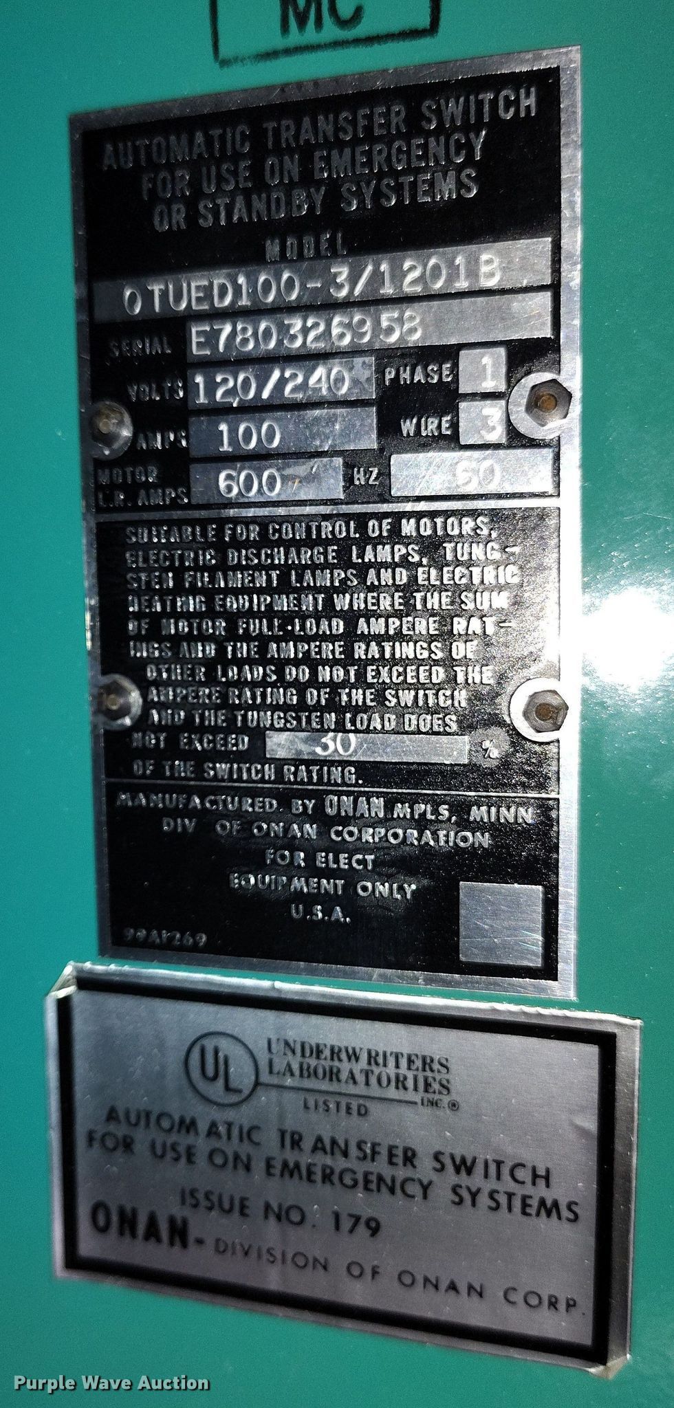Purple Wave is selling a used Generator Set in Colorado. This item is a Onan 12.0 DJC generator with the following: Serial: L780381567
