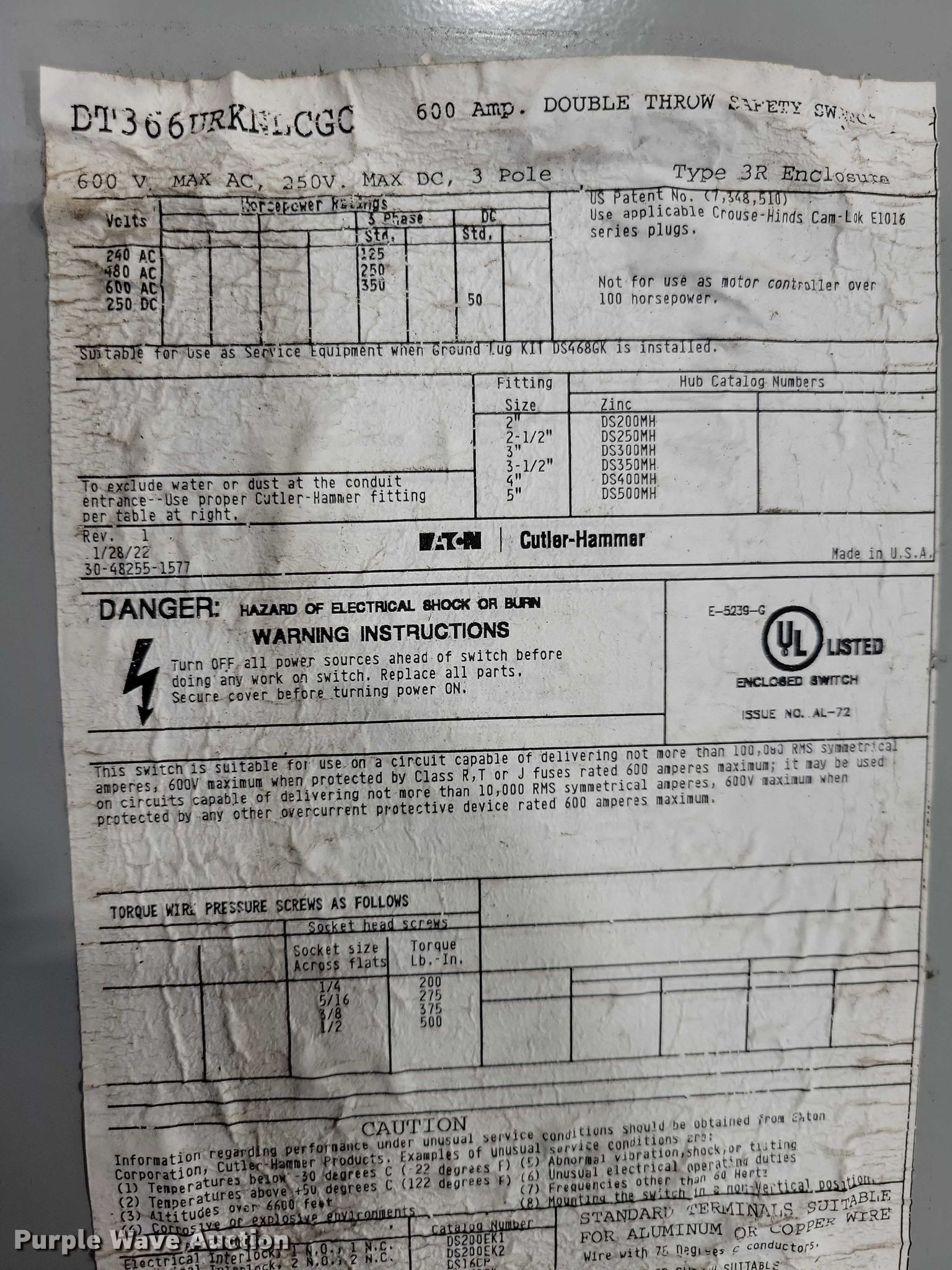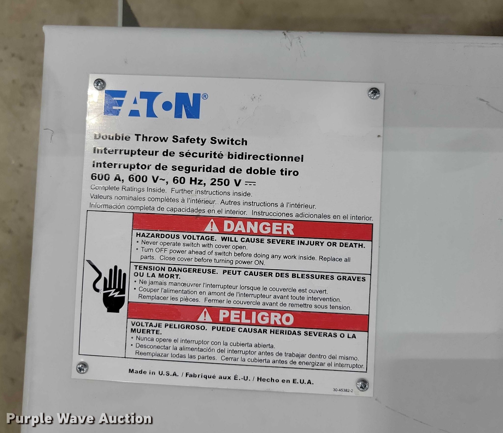 Purple Wave is selling a used Building Materials in Iowa. This item is a Generac Eaton double throw safety switch with the following: Phase: Three, Amps: 600