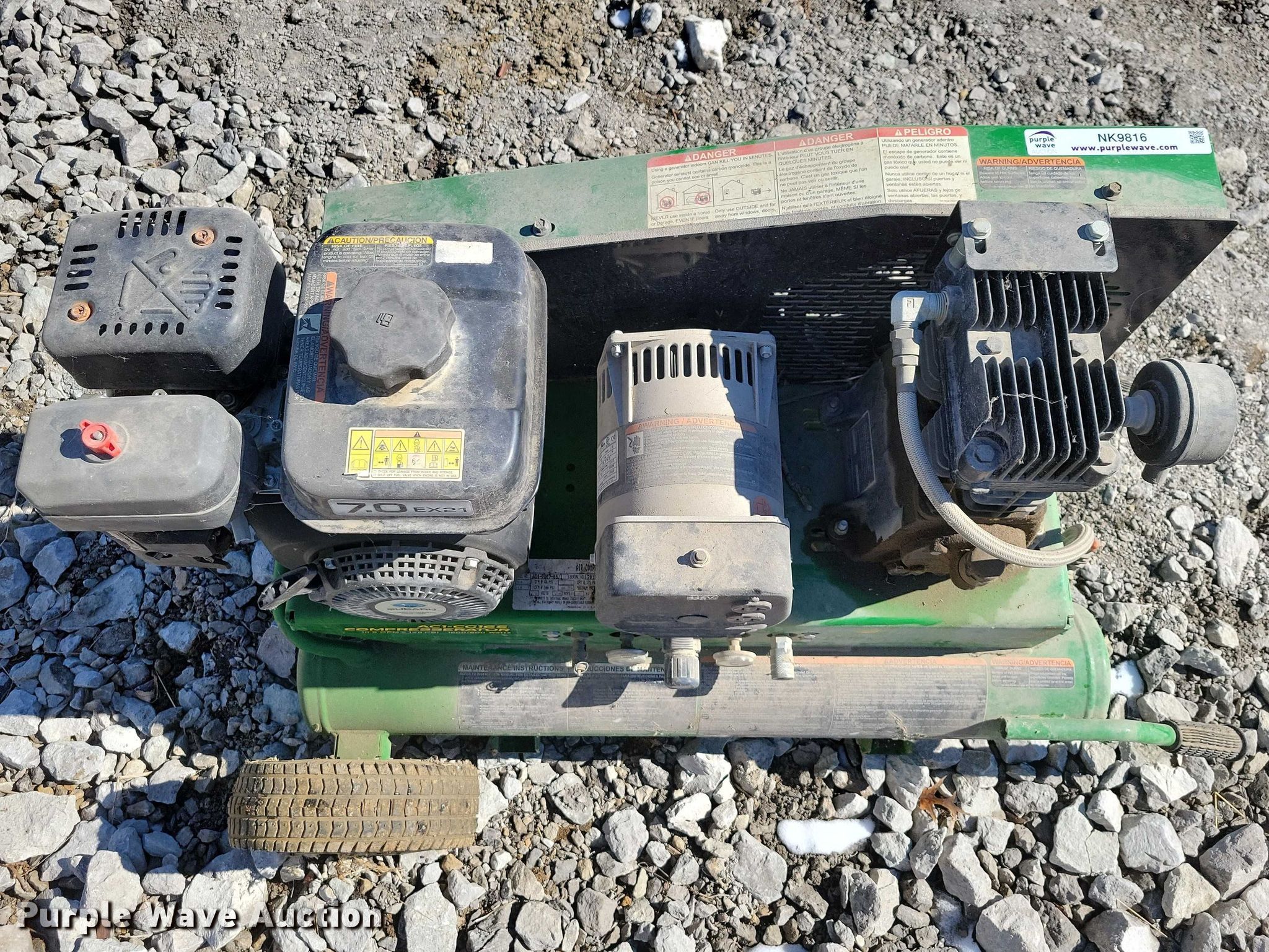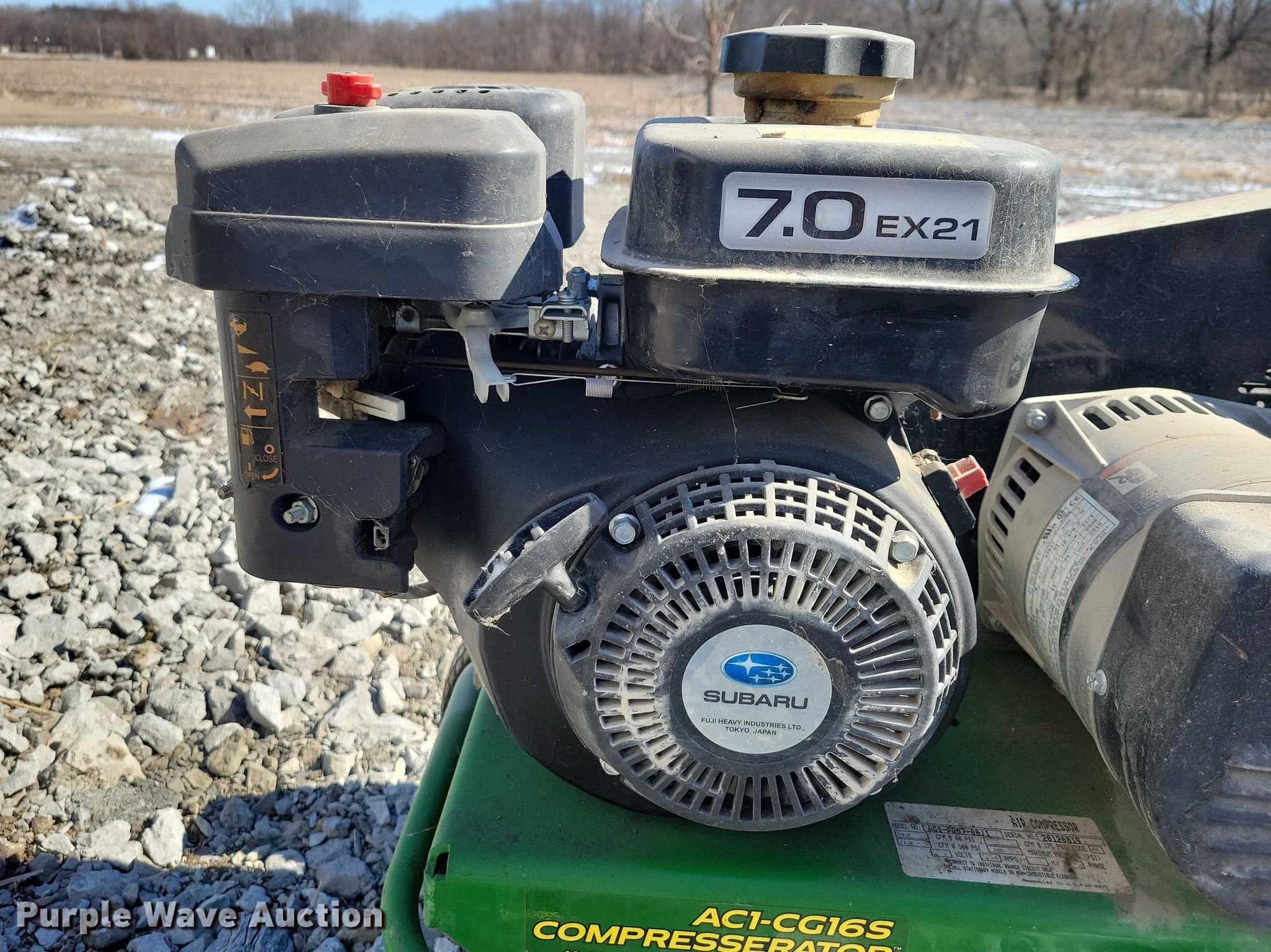 Purple Wave is selling a used Air Compressor in Iowa. This item is a John Deere AC1-CG16S air compressor with the following: Subaru EX21, Cylinders: 1, Fuel type: Gas, HP: 7