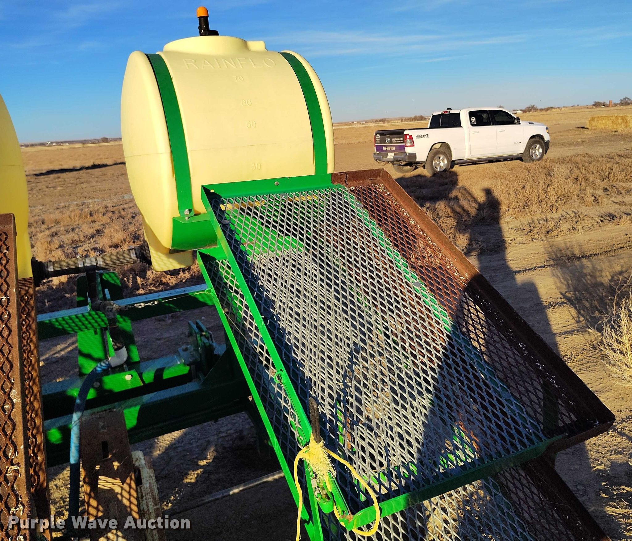 Rain-Flo Irrigation 1600 Serries II transplanter. Width: 17', Row units: 3, Row spacing: 72", Serial: 5118. Features Frame Hitch: Three point, Row units Meter drive: Ground, Other meters: hemp, cantaloupe, Fertilizer/ insecticide Fertilizer Liquid capacity: 420 gallons.. Tires Drive/ outside tire size: 20.5x8.0-10 Quantity: 2. SRF Farms. Rocky Ford, CO 81067