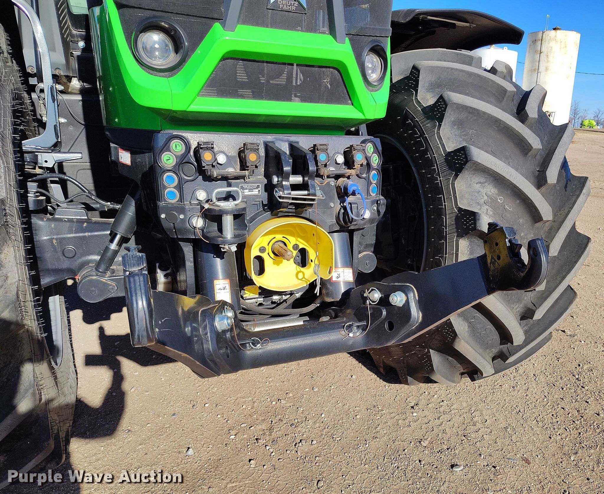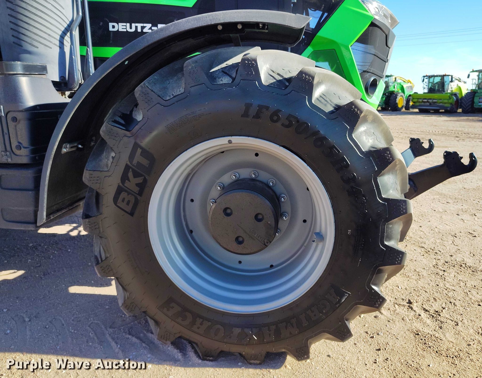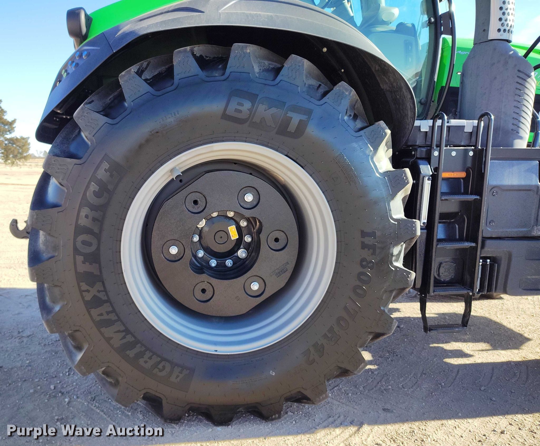 2022 Deutz-Fahr 9340 TTV Agrotron Warrior MFWD tractor. Hours: 127 on meter, Serial: WSXAE50200LD50102. Engine Detuz TCD 7.8 L06, Displacement: 7.8L, Cylinders: 6, Fuel type: Diesel, HP: 336. Transmission CVT, Left-hand reverser, Differential lock. Operators station AC, Heat, Display Detuz-Fahr iMonitor, Auto steer. Features PTO: 540, 1000, Front mount PTO: 540, Three point Top link, Front mount three point, Seven pin outlet, ISOBUS outlet, Hydraulic remote sets Front: 2, Rear: 5, Power beyond (hydraulics), Front mount power beyond (hydraulics). Tires Front: 650/65R34, Rear: 800/70R42, Wheel weights: 6. Notes Hail damage. Armstrong Equipment LLC. Yuma, CO 80759