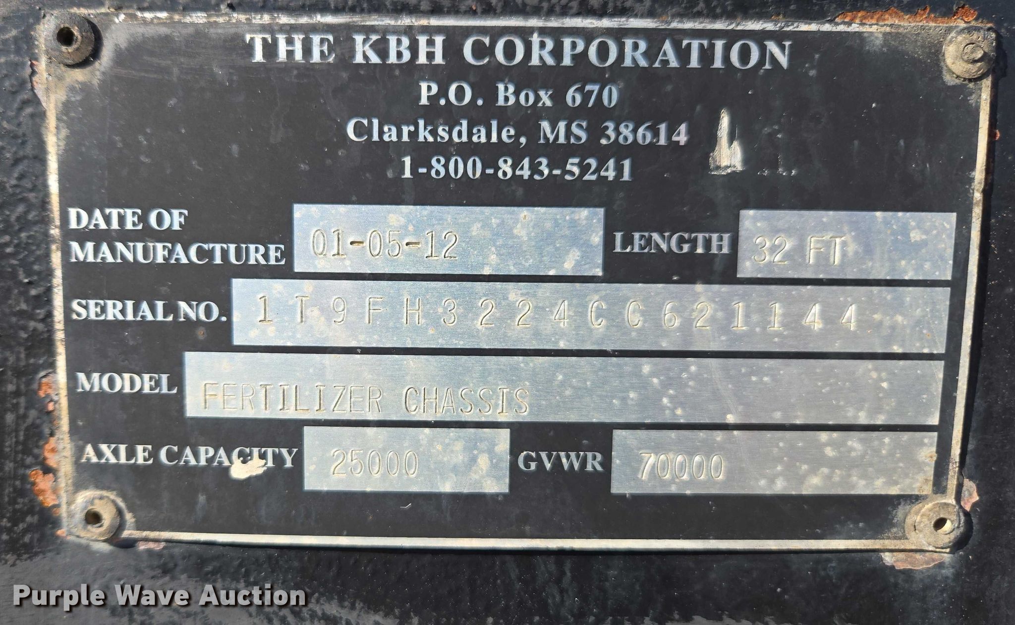 Purple Wave is selling a used Fertilizer or Seed Tender in Alabama. This item is a 2012 KBH fertilizer tender trailer with the following: Hours: 766 on meter, VIN: 1T9FH3224CC621144, Serial: TT02306