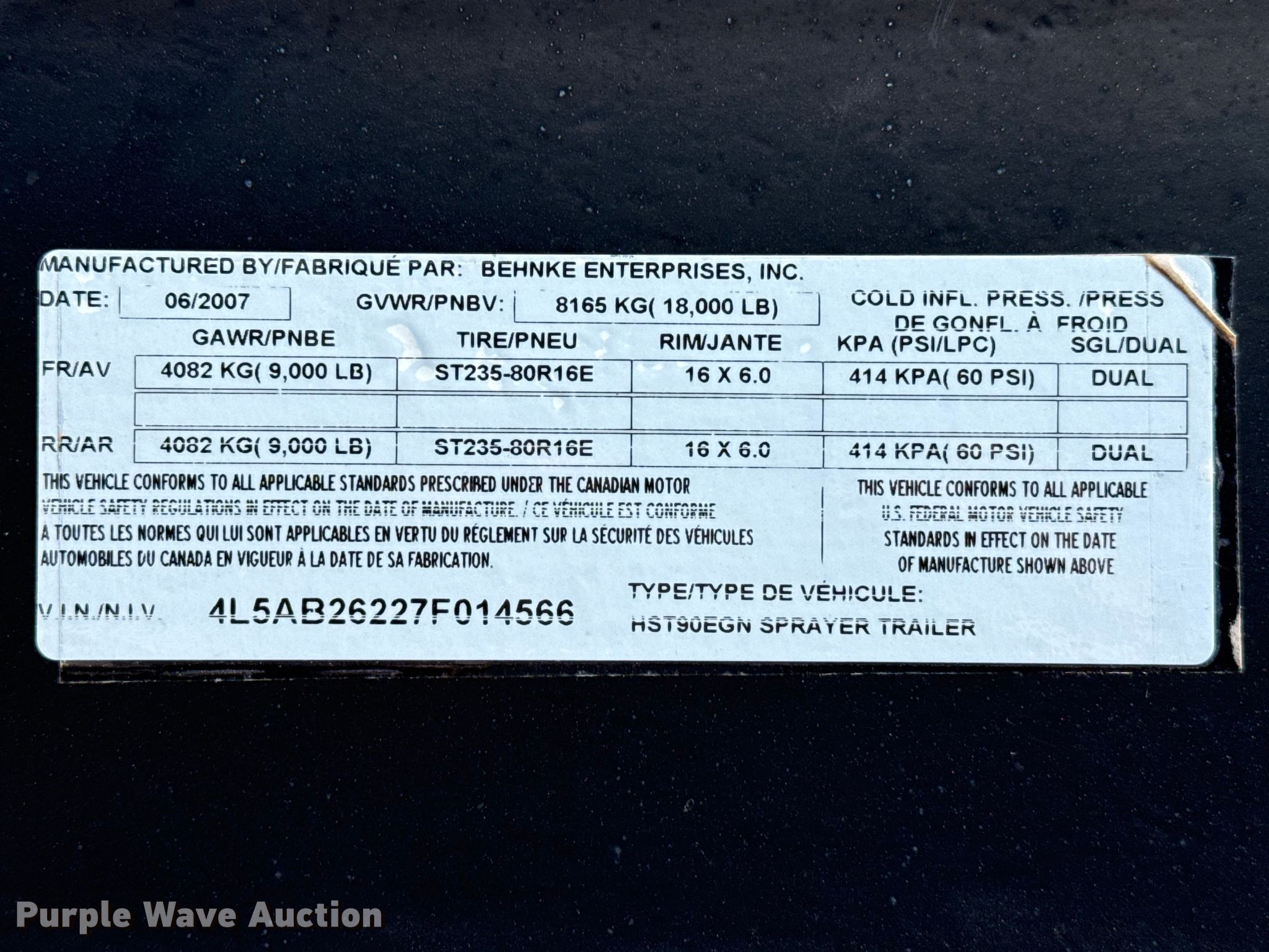 Purple Wave is selling a used Ag Equip. or Header Trailer in Kansas. This item is a 2007 Behnke HET90EGN sprayer trailer with the following: VIN: 4L5AB26227F014566