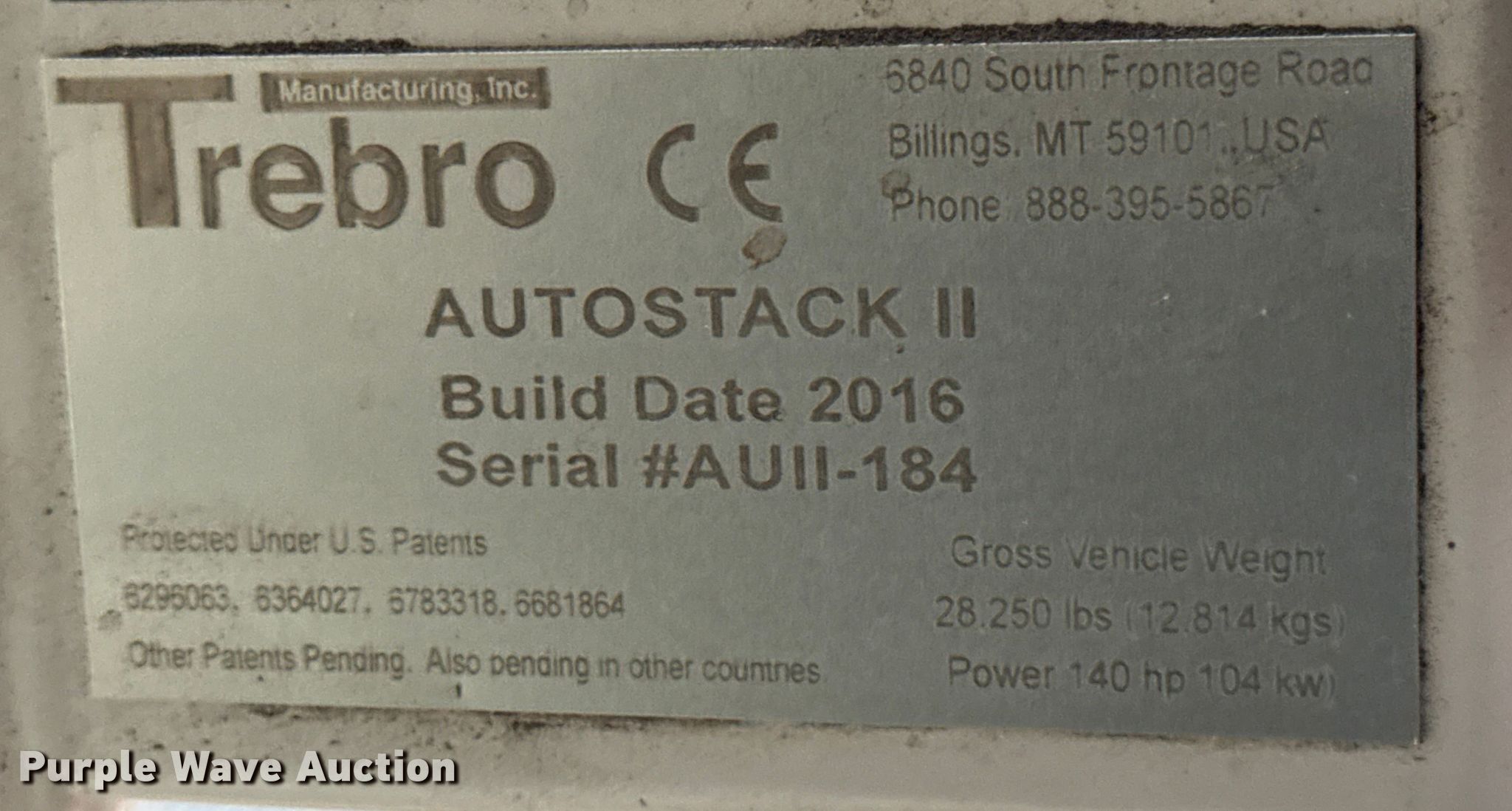 2016 Trebro Autostack II sod harvester. Engine hours: 3,740 on meter. Engine Cummins QSB4.5 130, Displacement: 4.5L, Cylinders: 4, Fuel type: Diesel. Transmission Hydrostatic. Interior AC, Heat. Tires Size: 54x31.00-26. Notes (2) 24' cutters. Payne Sod Farm Equipment - Rotation Sale. Manteno, IL 60950
