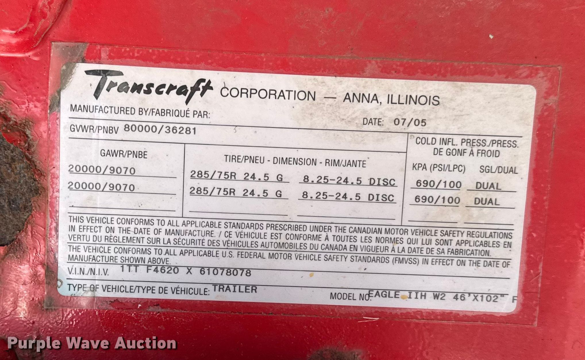 Purple Wave is selling a used Flat or Drop Deck Trailer in Illinois. This item is a 2006 Transcraft Eagle II flatbed trailer with the following: VIN: 1TTF4620X61078078