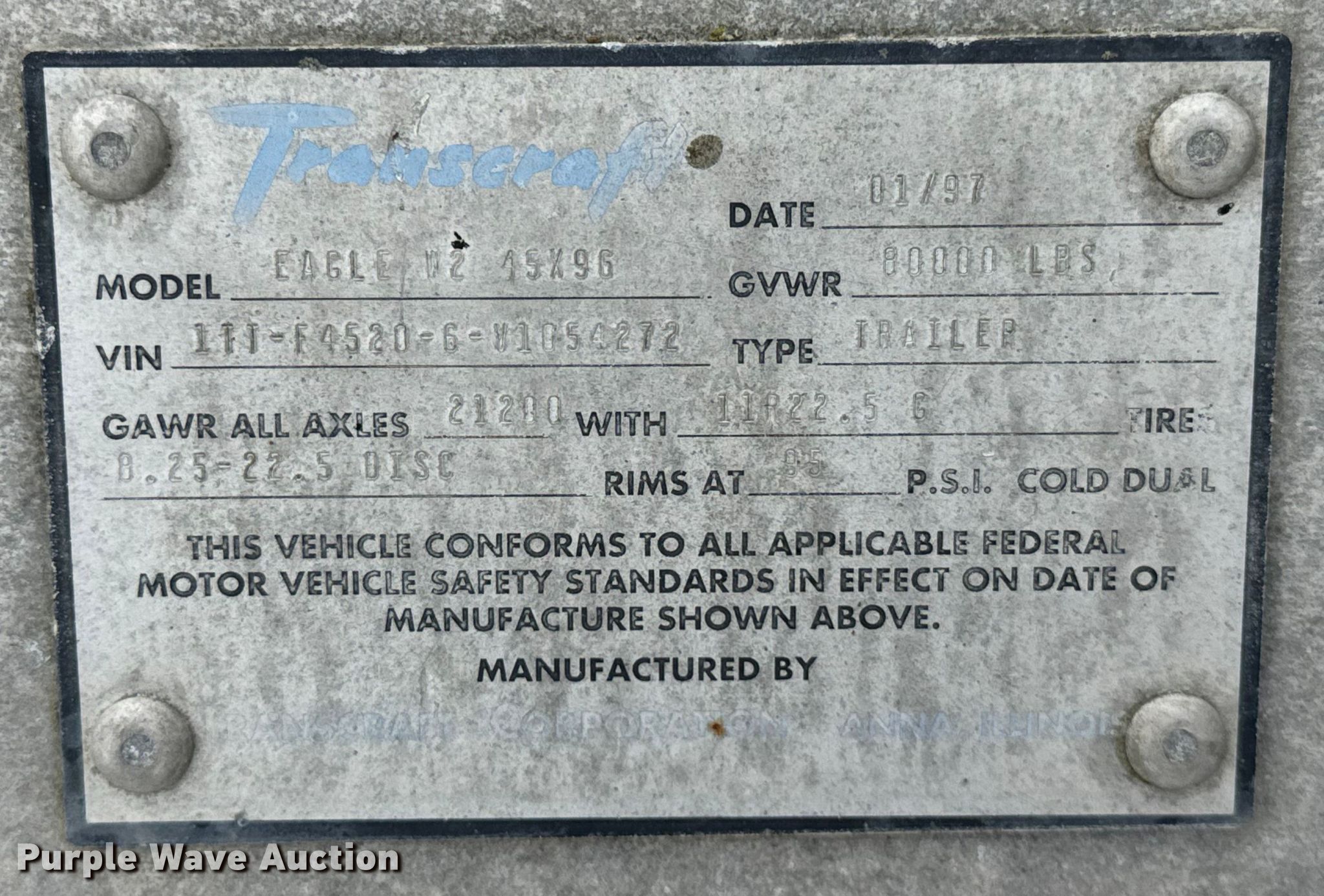 Purple Wave is selling a used Flat or Drop Deck Trailer in Illinois. This item is a 1997 Transcraft Eagle W2 flatbed trailer with the following: VIN: 1TTF45206V1054272
