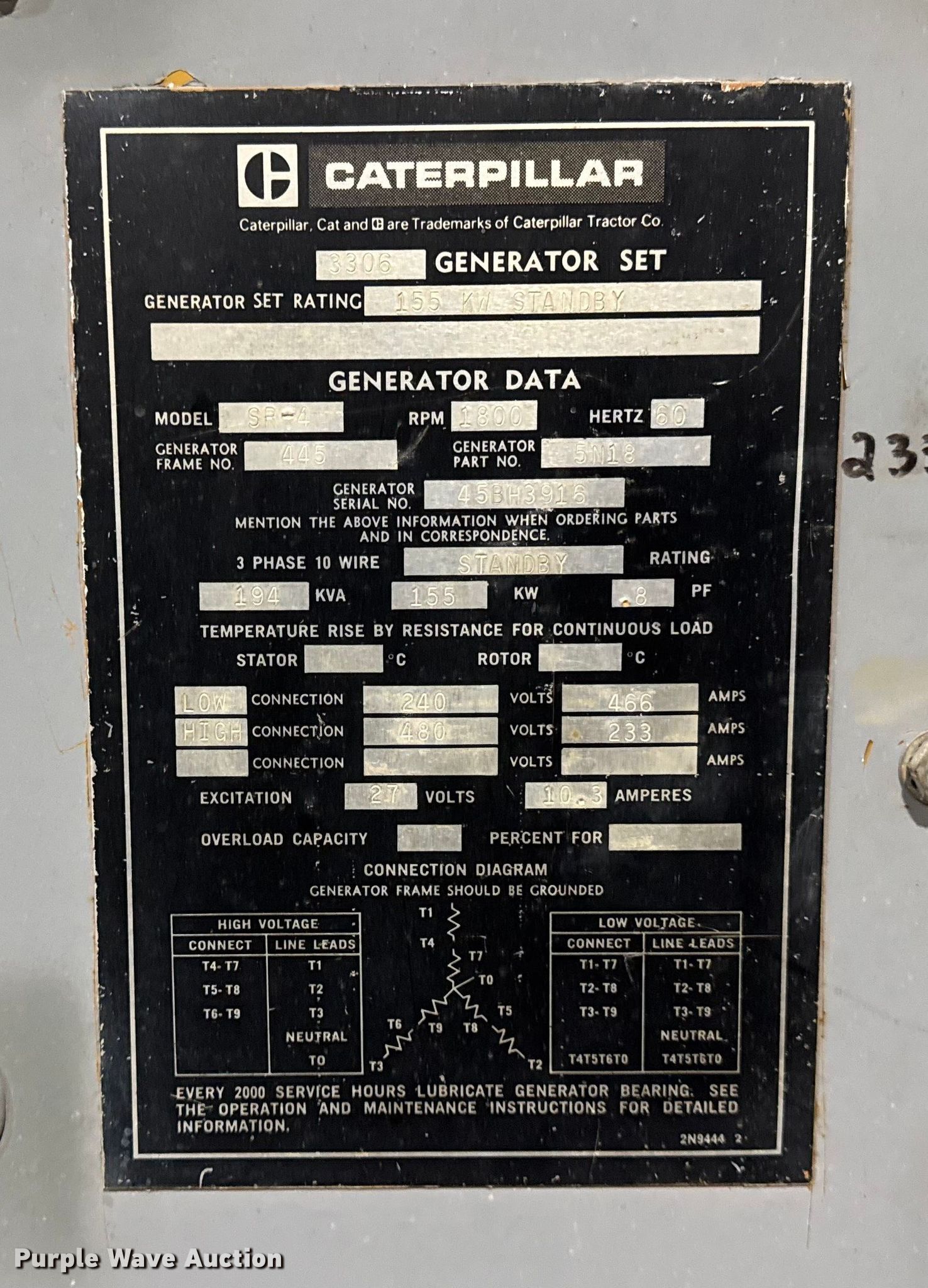 Caterpillar 3306 generator. Hours: 52 on meter, Serial: 45BH3916. Engine Caterpillar 3306, Cylinders: 6, Fuel type: Diesel. Features Generator Model: SR4, kVA: 194, kW: 155, Phase: Three, Skid mounted, Fuel tank. H & E Sod Nursery, Inc.. 13246 E 1250 N Rd. Momence, IL 60954