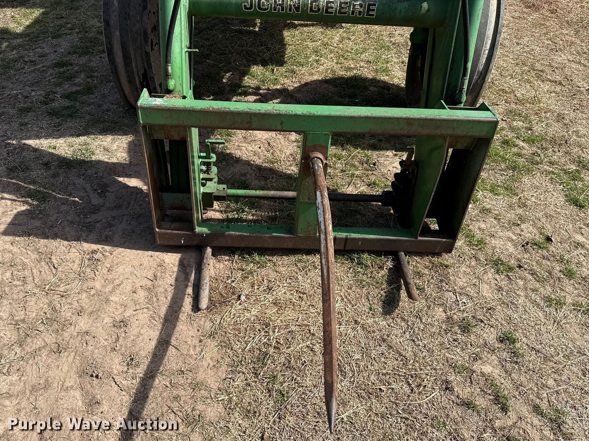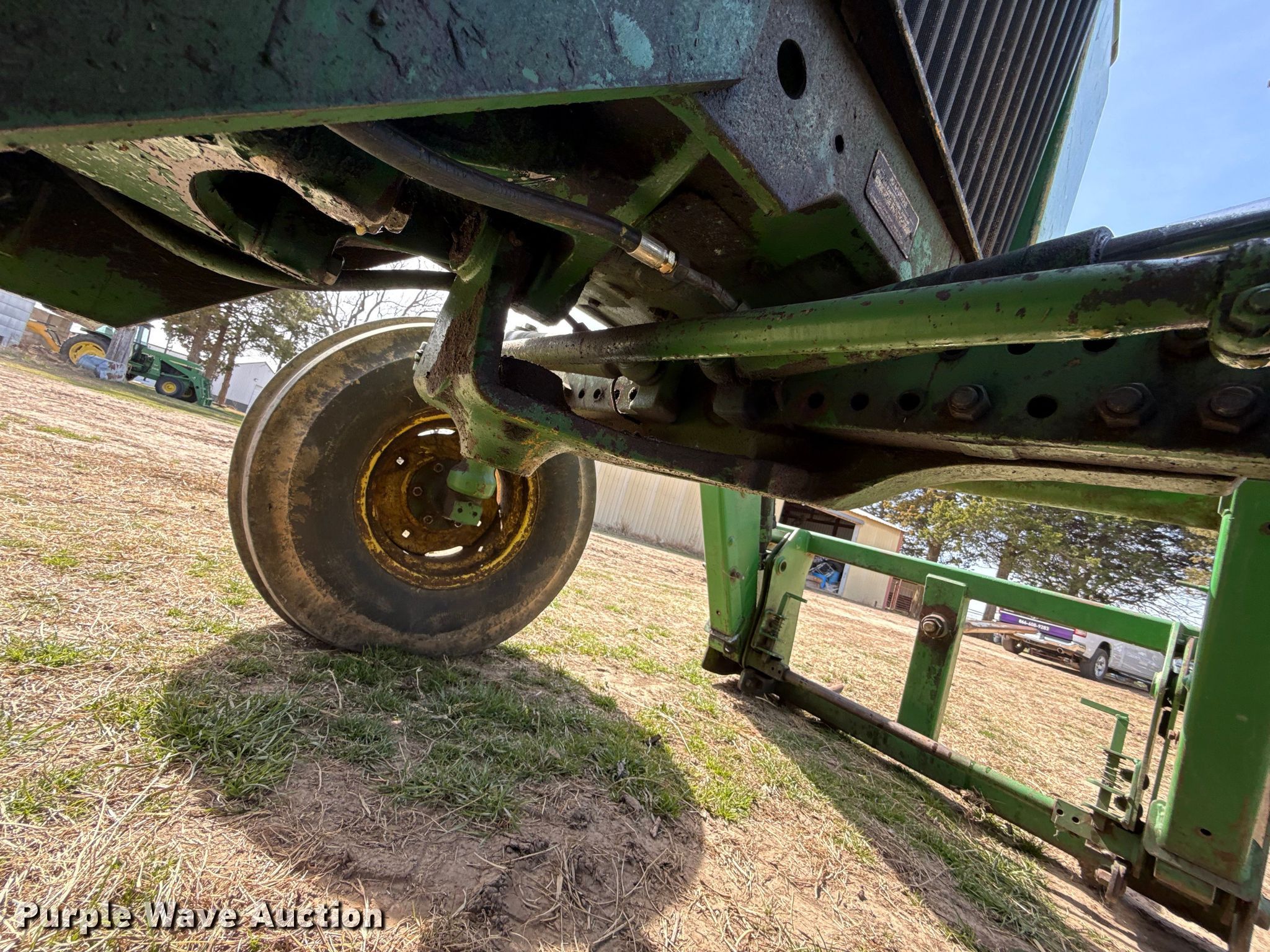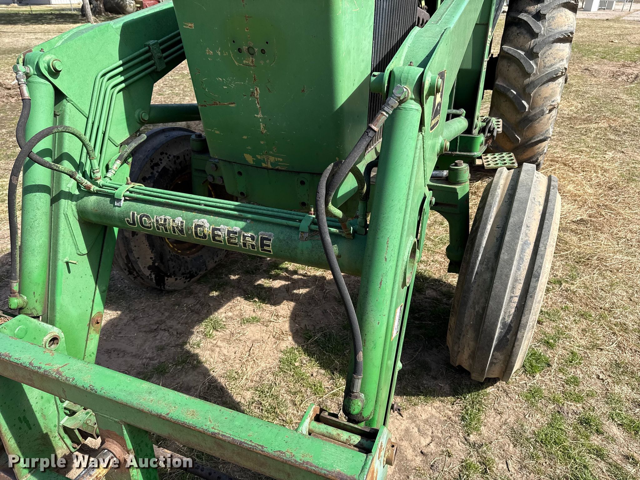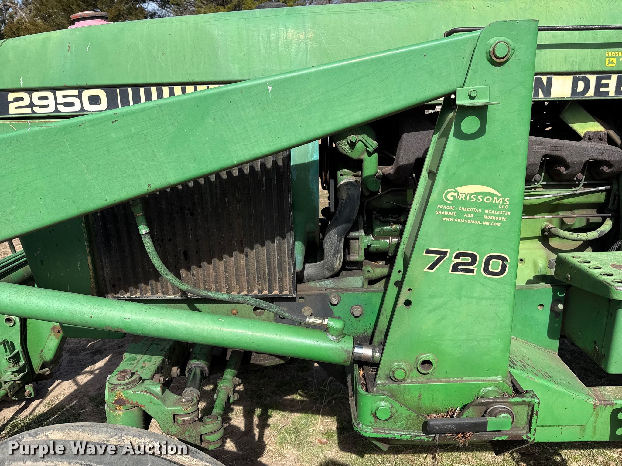 1983 John Deere 2950 tractor. Hours: 1,932 on meter, Serial: L02950T463140. Engine John Deere 6359DL, Serial: 04549347CD, Cylinders: 6, Fuel type: Diesel. Transmission Powershift, 16F - 8R, Differential lock. Operators station AC. Features PTO: 540, Three point Top link, Seven pin outlet, Hydraulic remote sets Rear: 2, Loader John Deere 720, Quick attach, Bale spear, Controls: Joystick. Tires Front: 10.00-16, Rear: 18.4-34, Wheel weights: 2. Notes Jump start required during on-site data collection, Fan belt disconnected, Alternator belt disconnected, Unknown operating condition of AC. Allen's Auto Salvage. Okemah, OK 74859