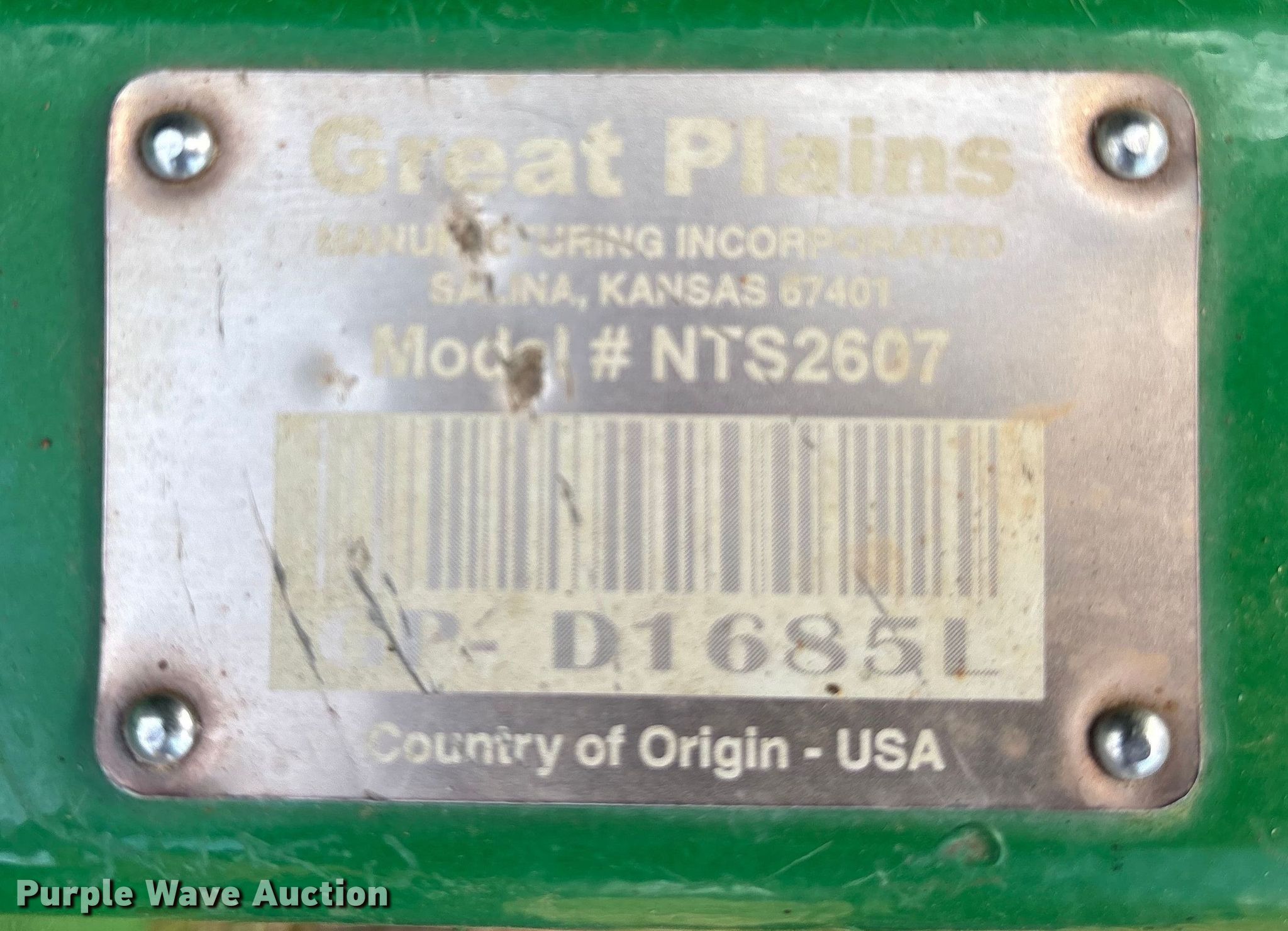 Purple Wave is selling a used Grain Drill or Seeder in Texas. This item is a 2021 Great Plains NTS2607 no-till seeder with the following: Width: 7', Row spacing: 8", Serial: GPD1685L