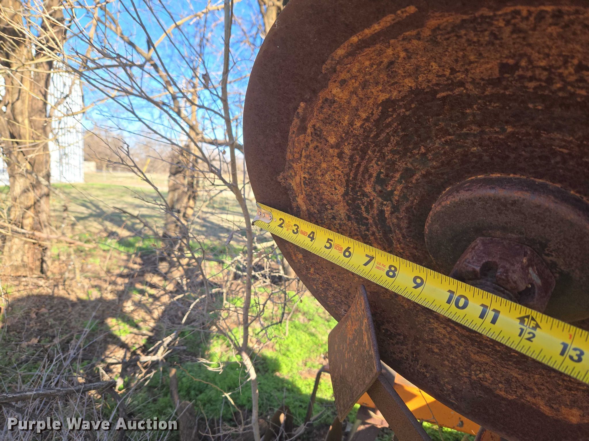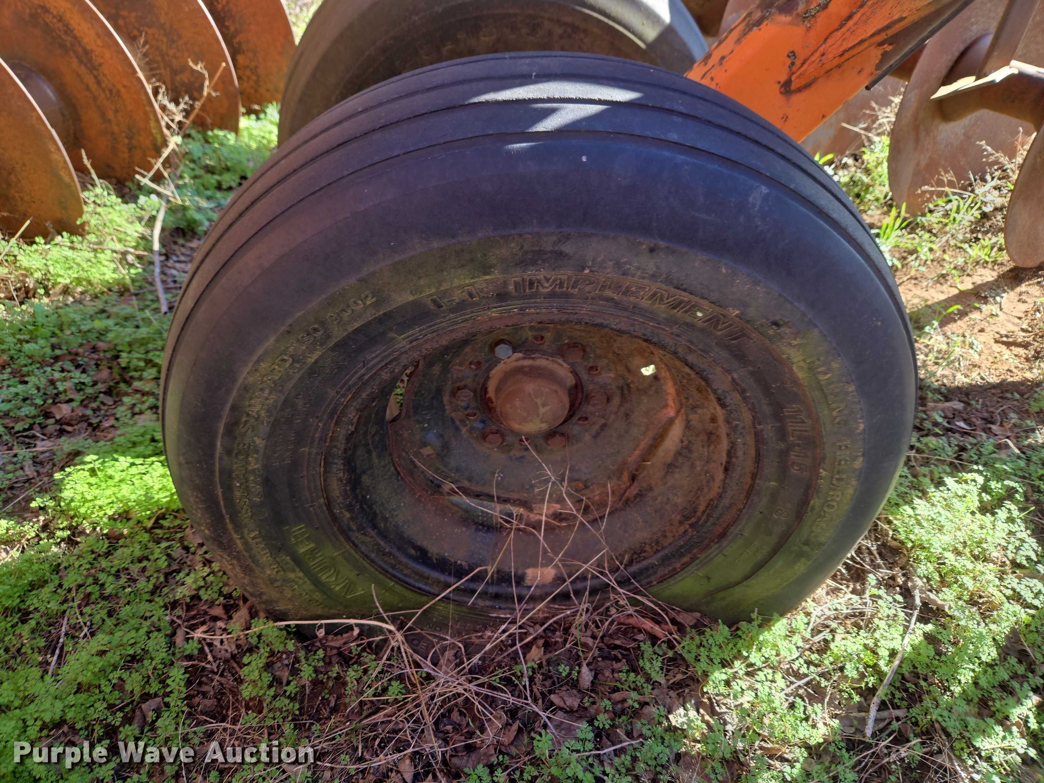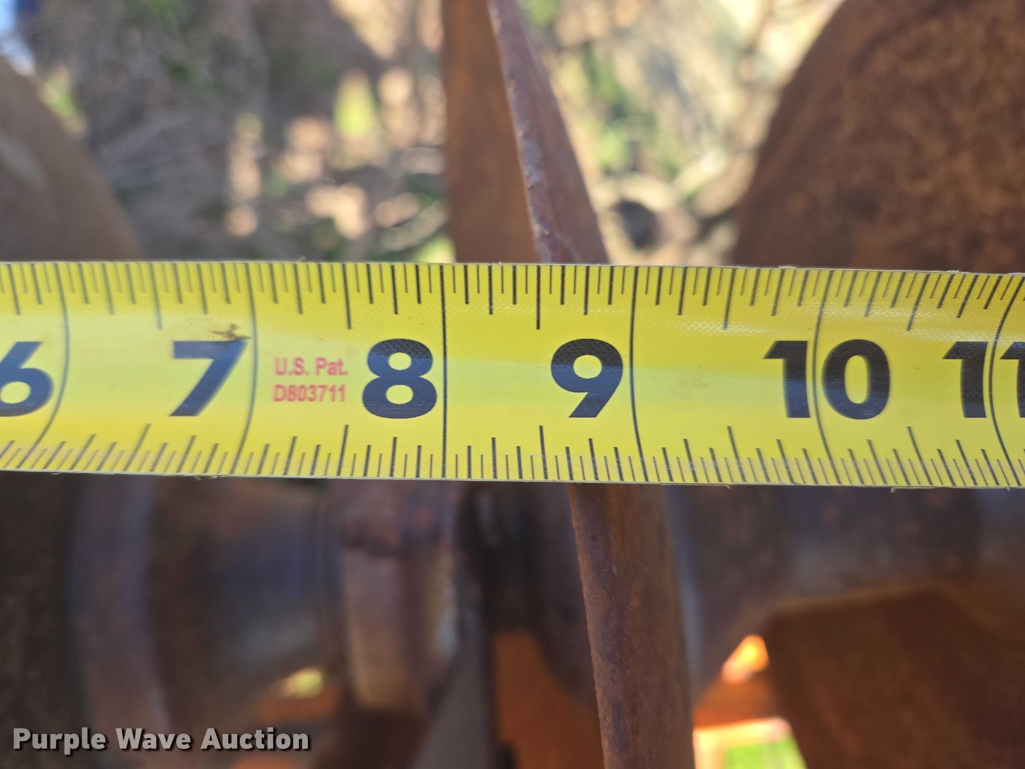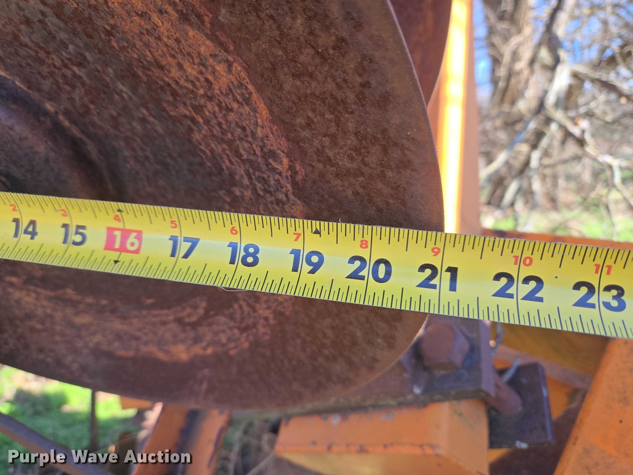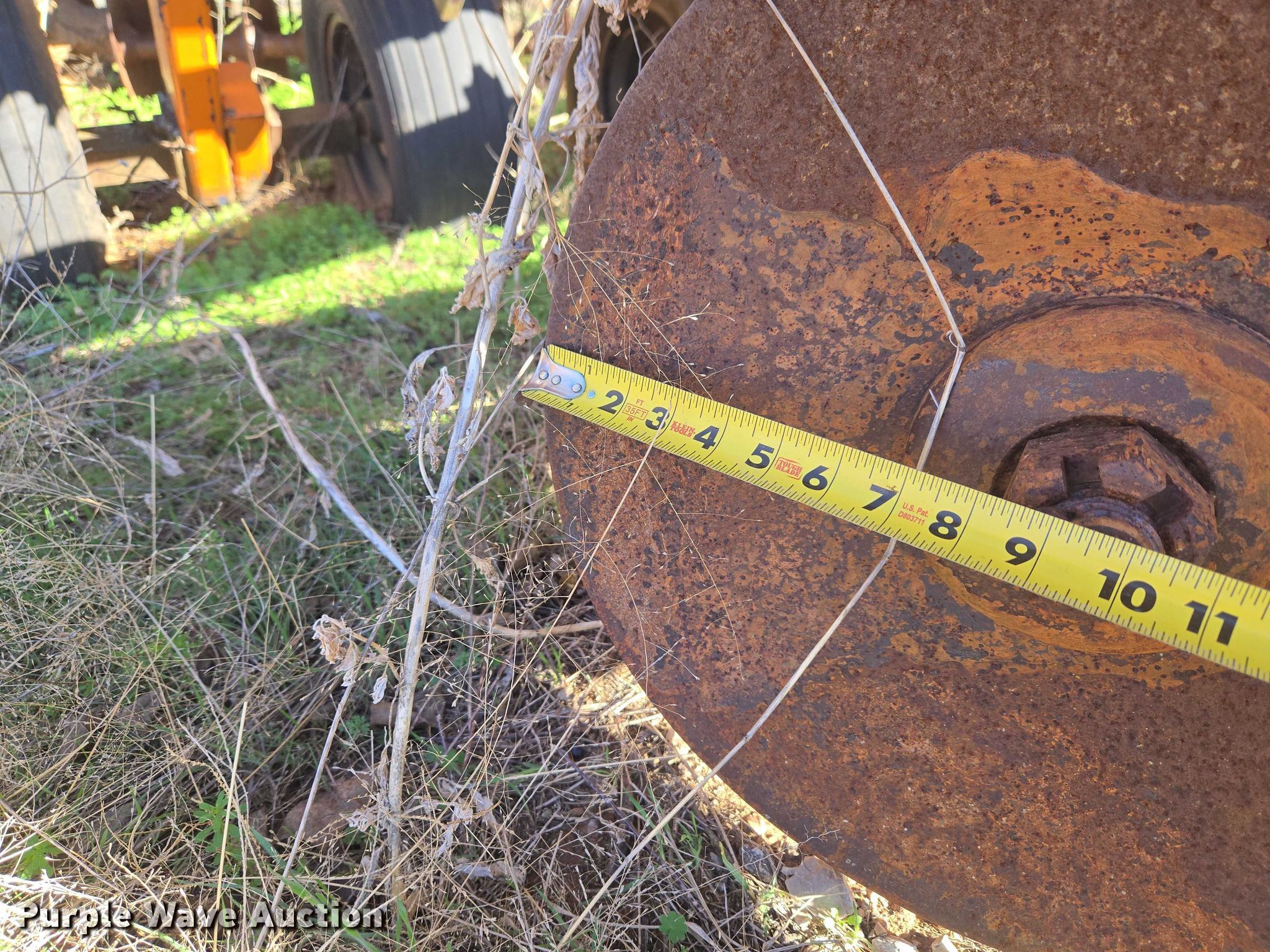Cook 18 off-set disk. Overall width: 15' 6", Serial: OSF18115. Features Front blades Diameter: 19", Spacing: 9", Rear blades Diameter: 21", Spacing: 9", Disk scrapers, Operation Hydraulic lift, Hydraulic fold. Tires Tire size: 11L-15. Notes Hydraulic leak, Flat tires. Kouba Farms. Yukon, OK 73099