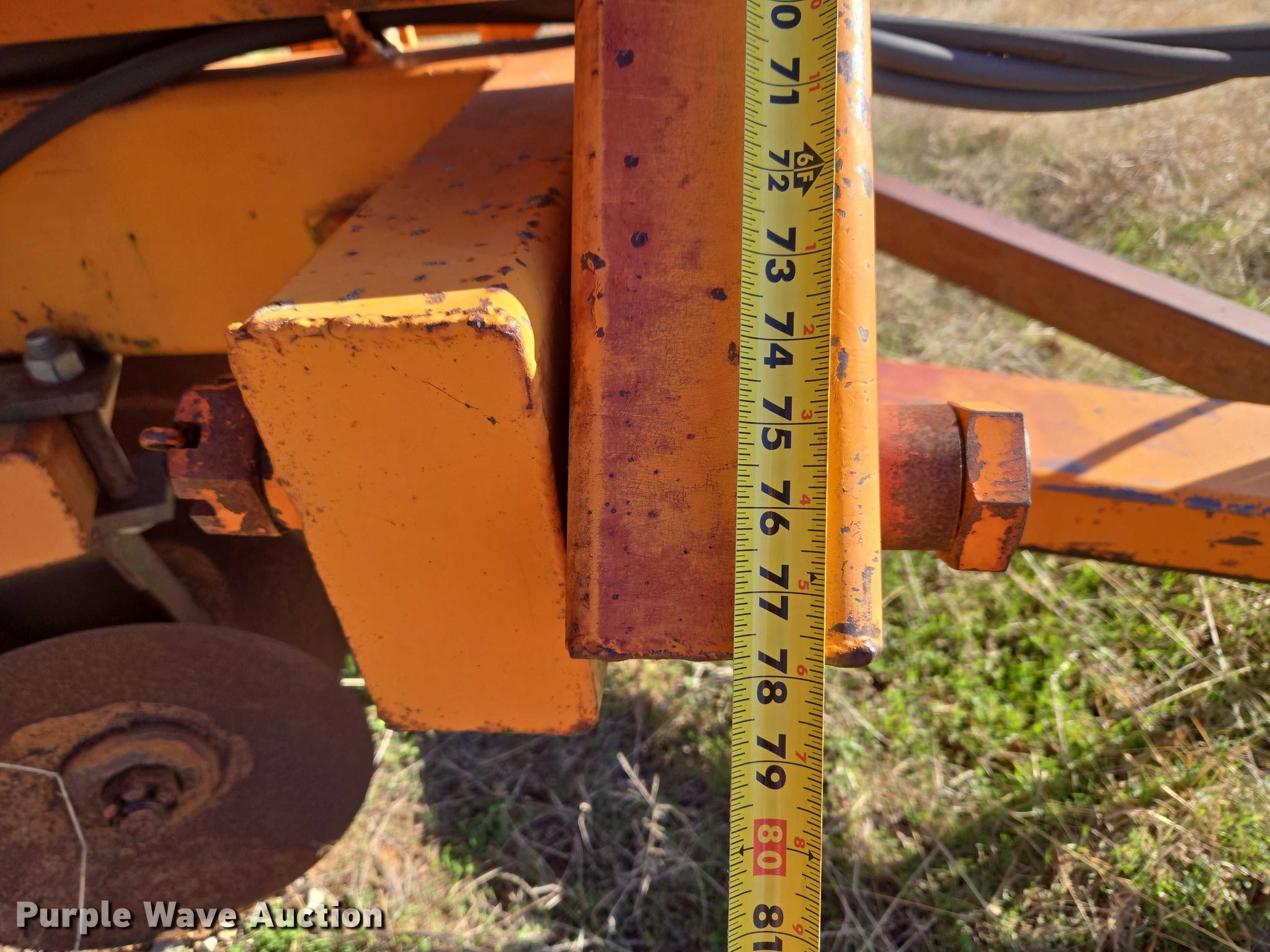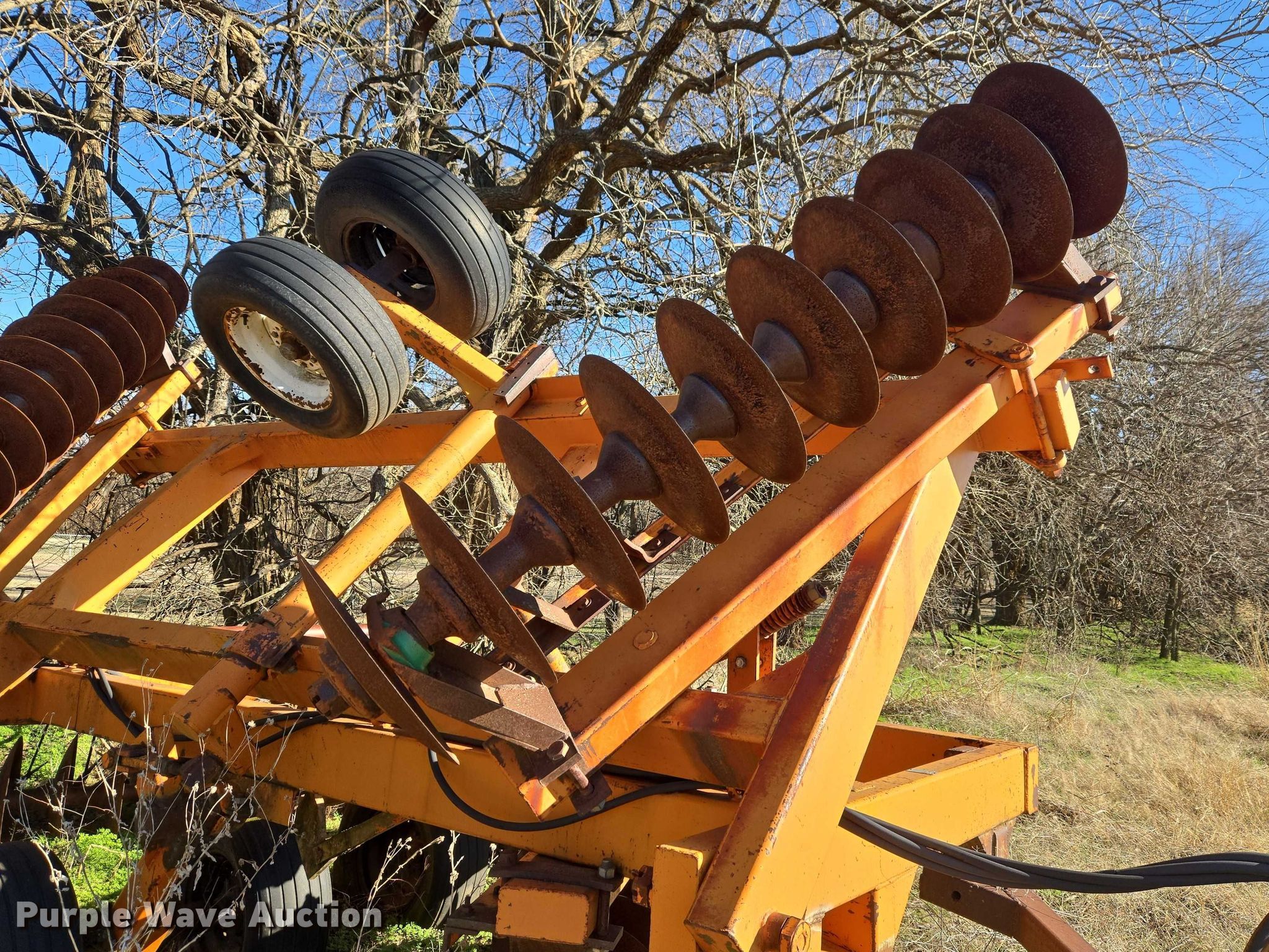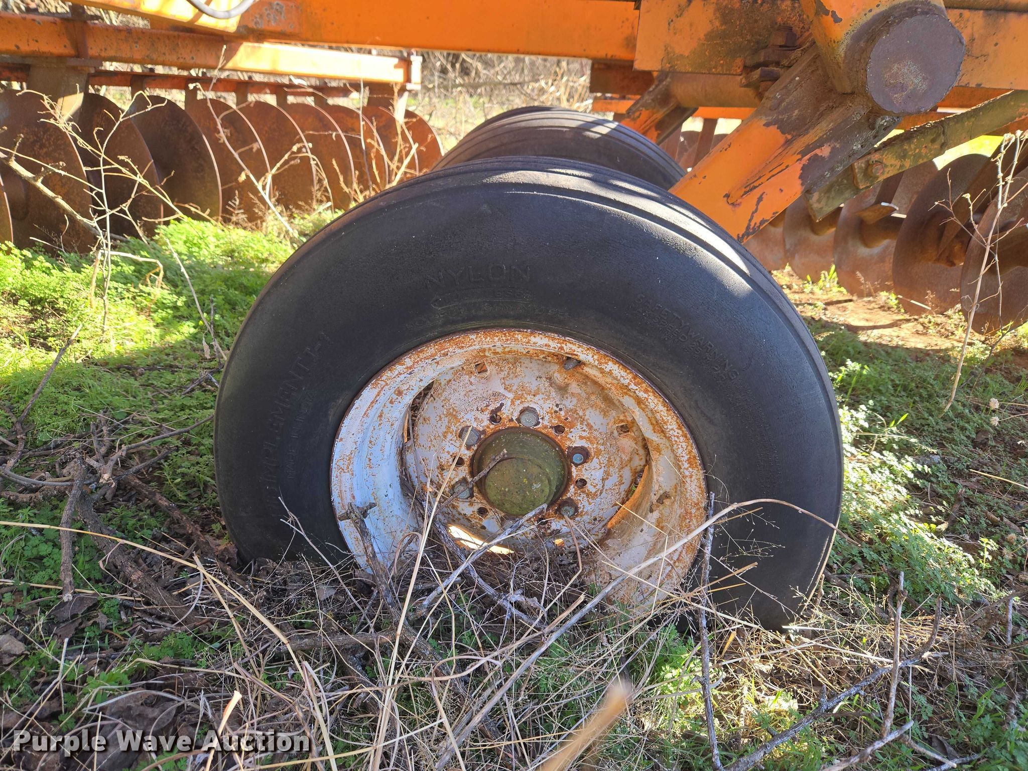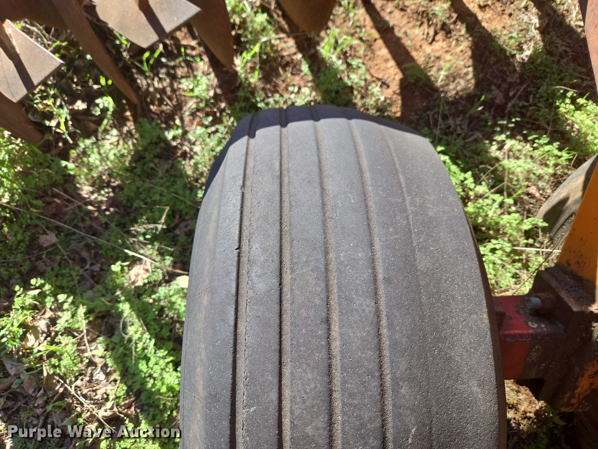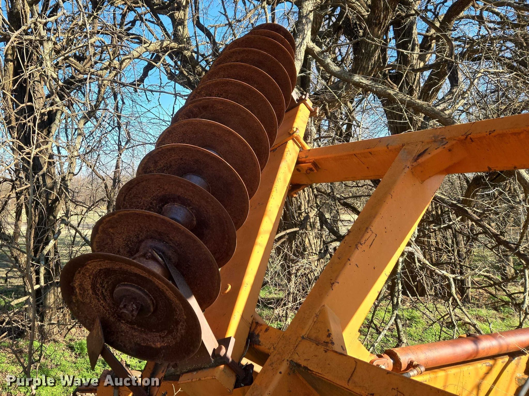 Cook 18 off-set disk. Overall width: 15' 6", Serial: OSF18115. Features Front blades Diameter: 19", Spacing: 9", Rear blades Diameter: 21", Spacing: 9", Disk scrapers, Operation Hydraulic lift, Hydraulic fold. Tires Tire size: 11L-15. Notes Hydraulic leak, Flat tires. Kouba Farms. Yukon, OK 73099