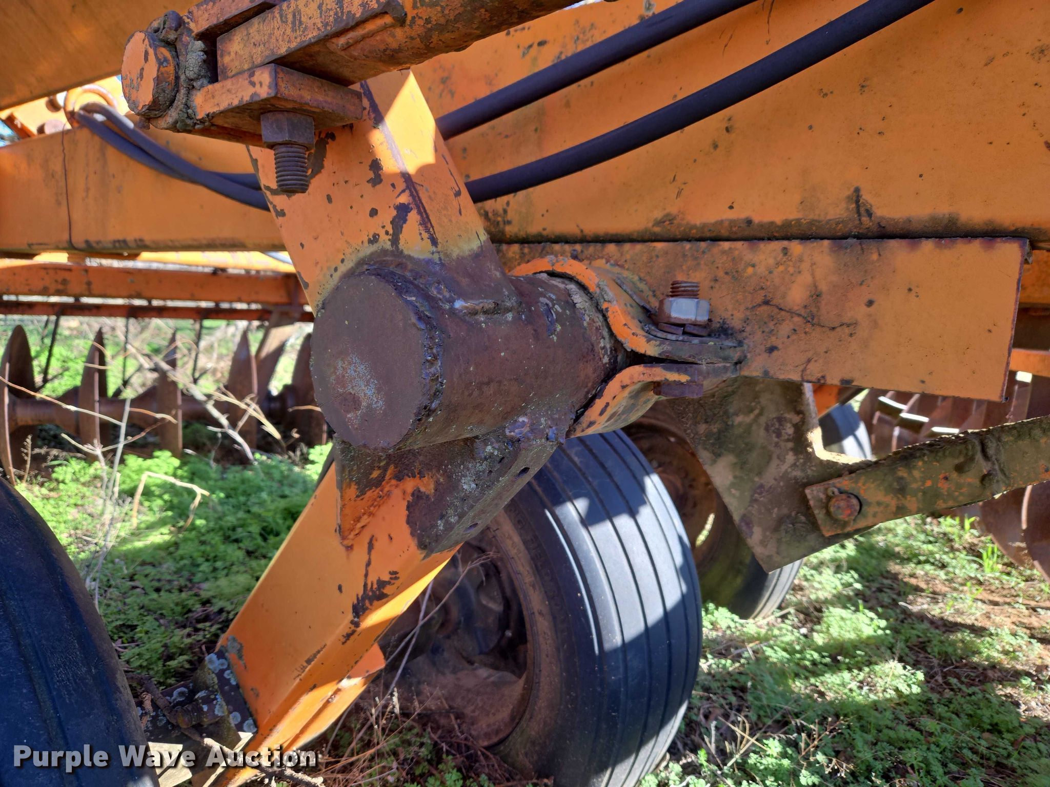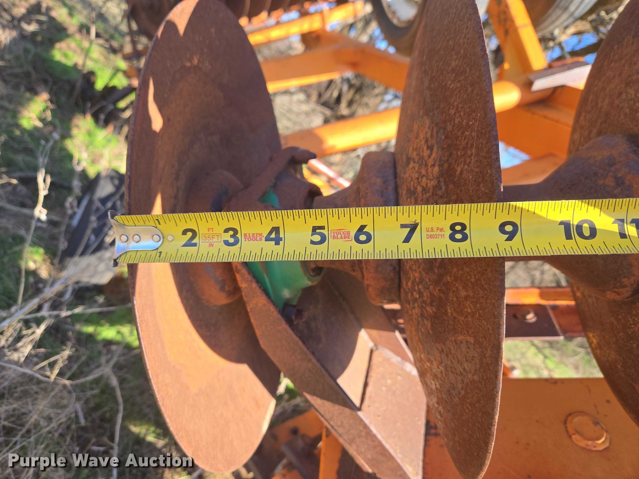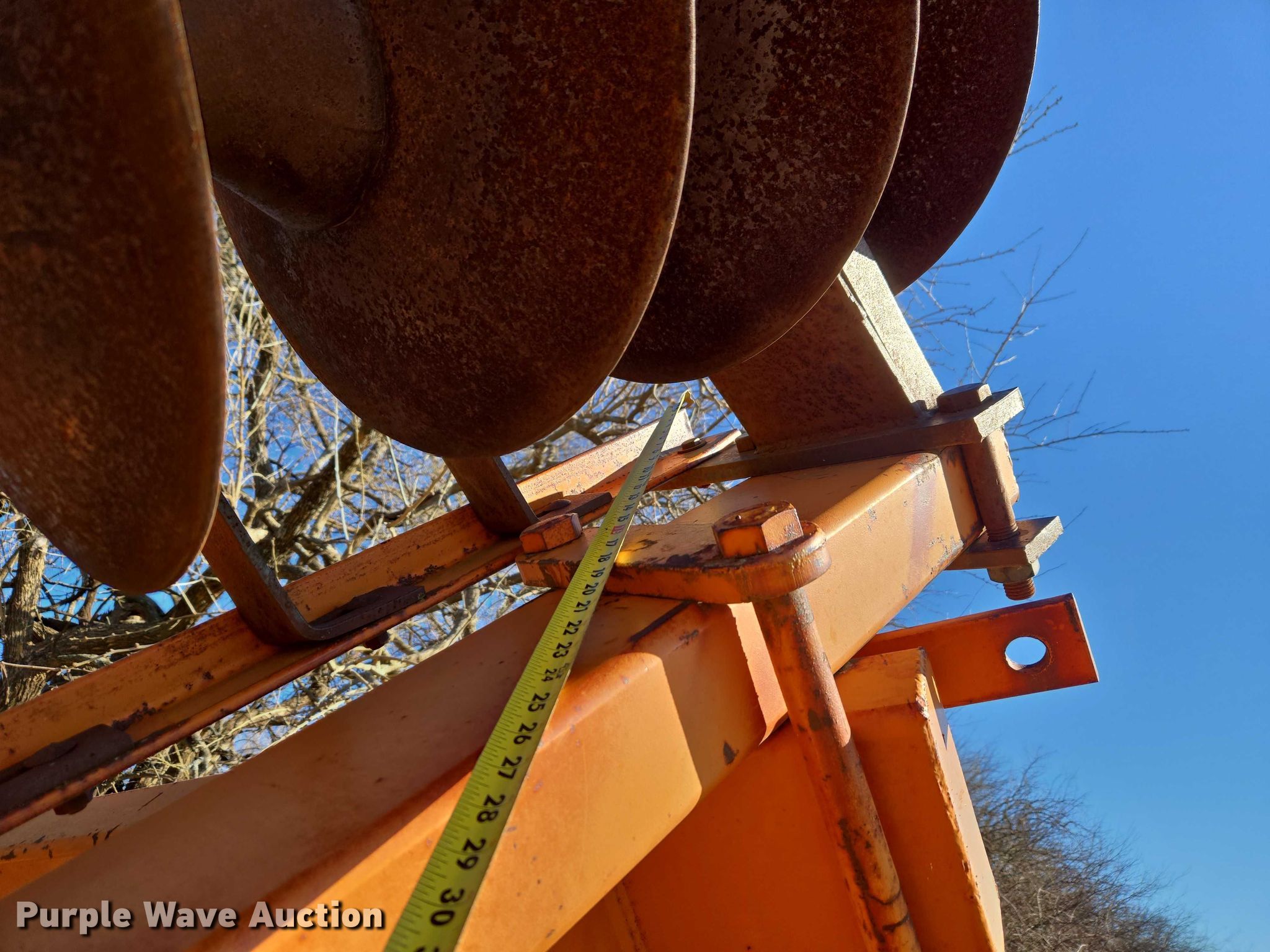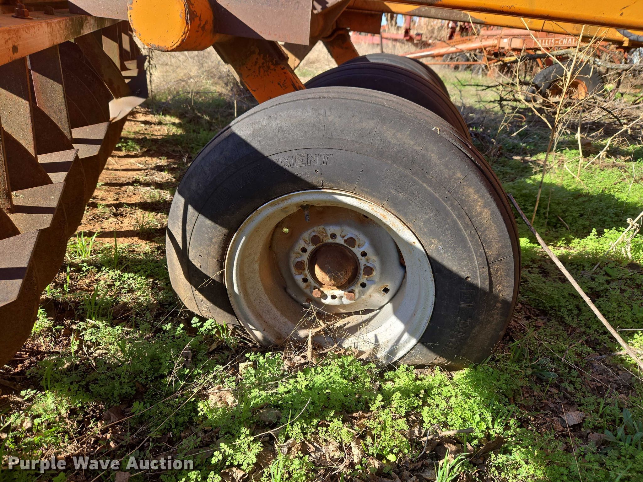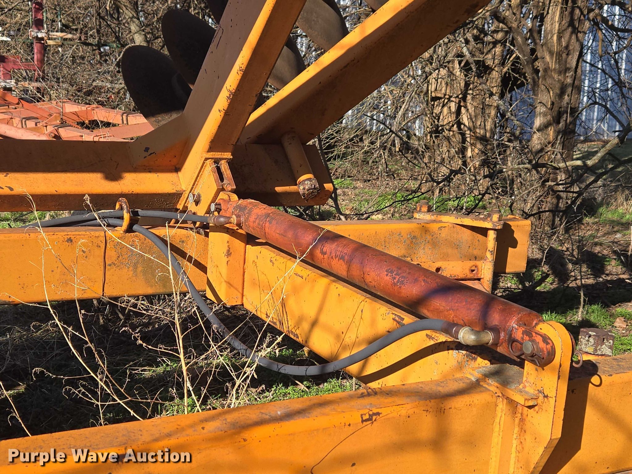 Cook 18 off-set disk. Overall width: 15' 6", Serial: OSF18115. Features Front blades Diameter: 19", Spacing: 9", Rear blades Diameter: 21", Spacing: 9", Disk scrapers, Operation Hydraulic lift, Hydraulic fold. Tires Tire size: 11L-15. Notes Hydraulic leak, Flat tires. Kouba Farms. Yukon, OK 73099