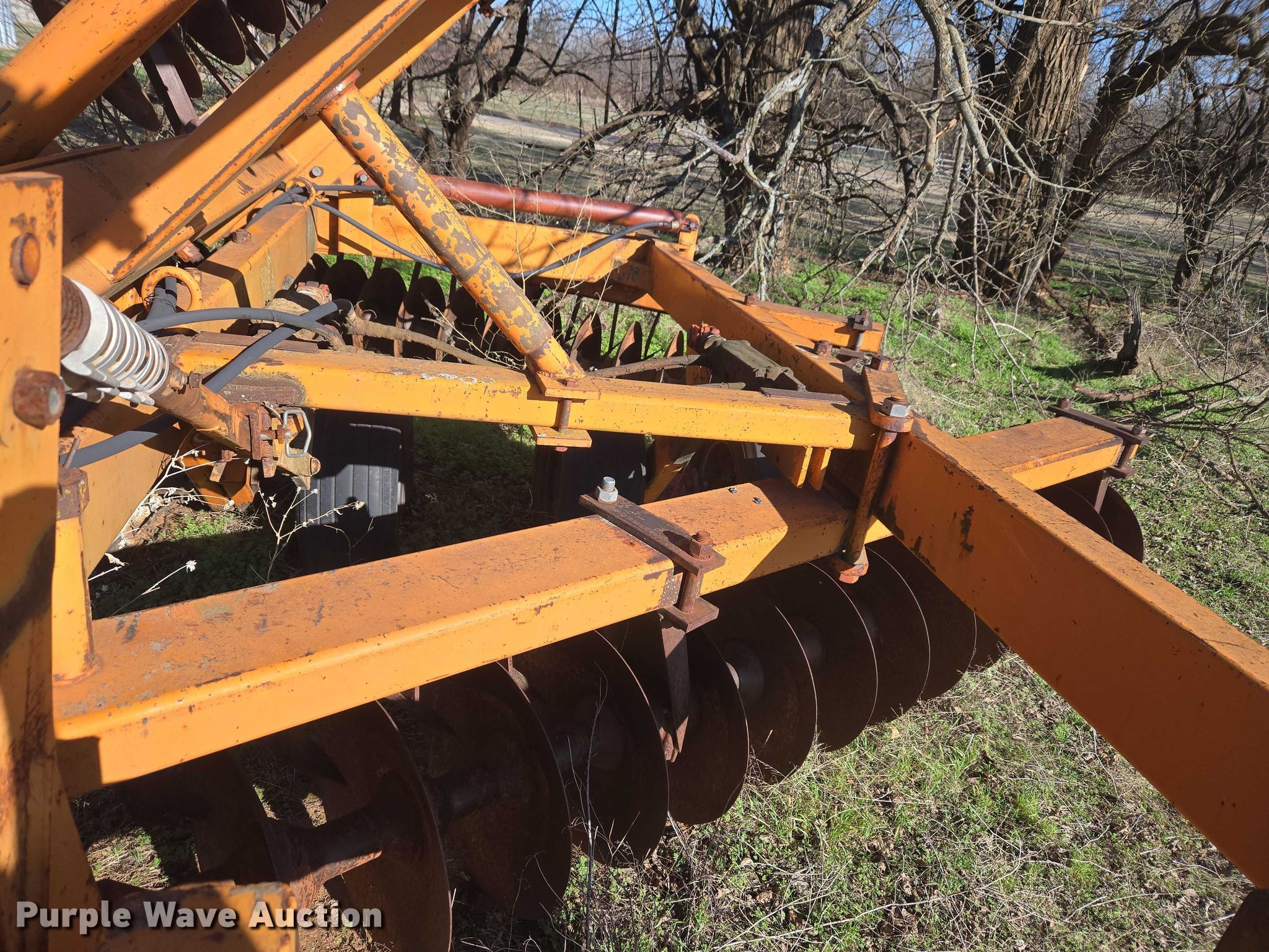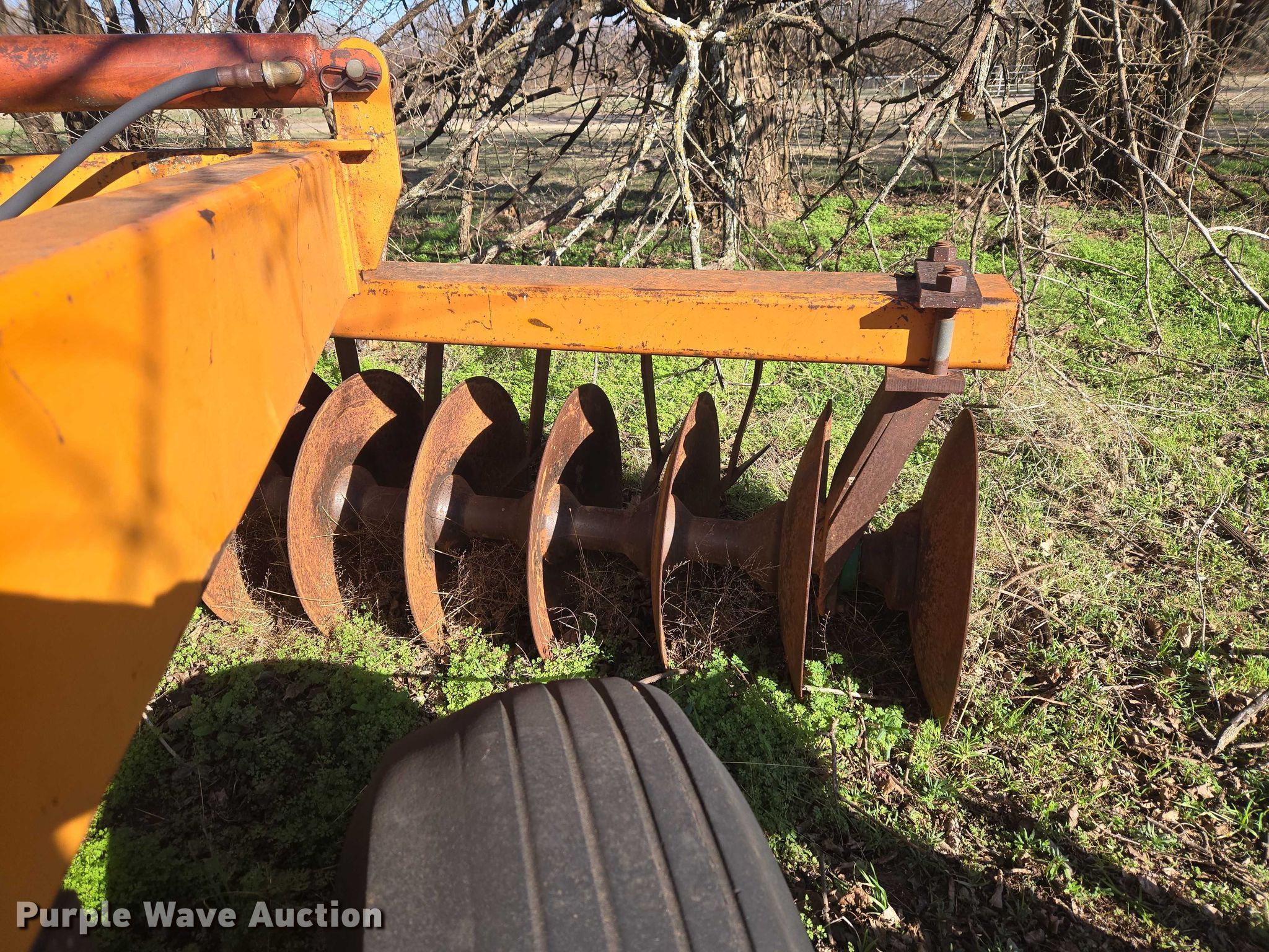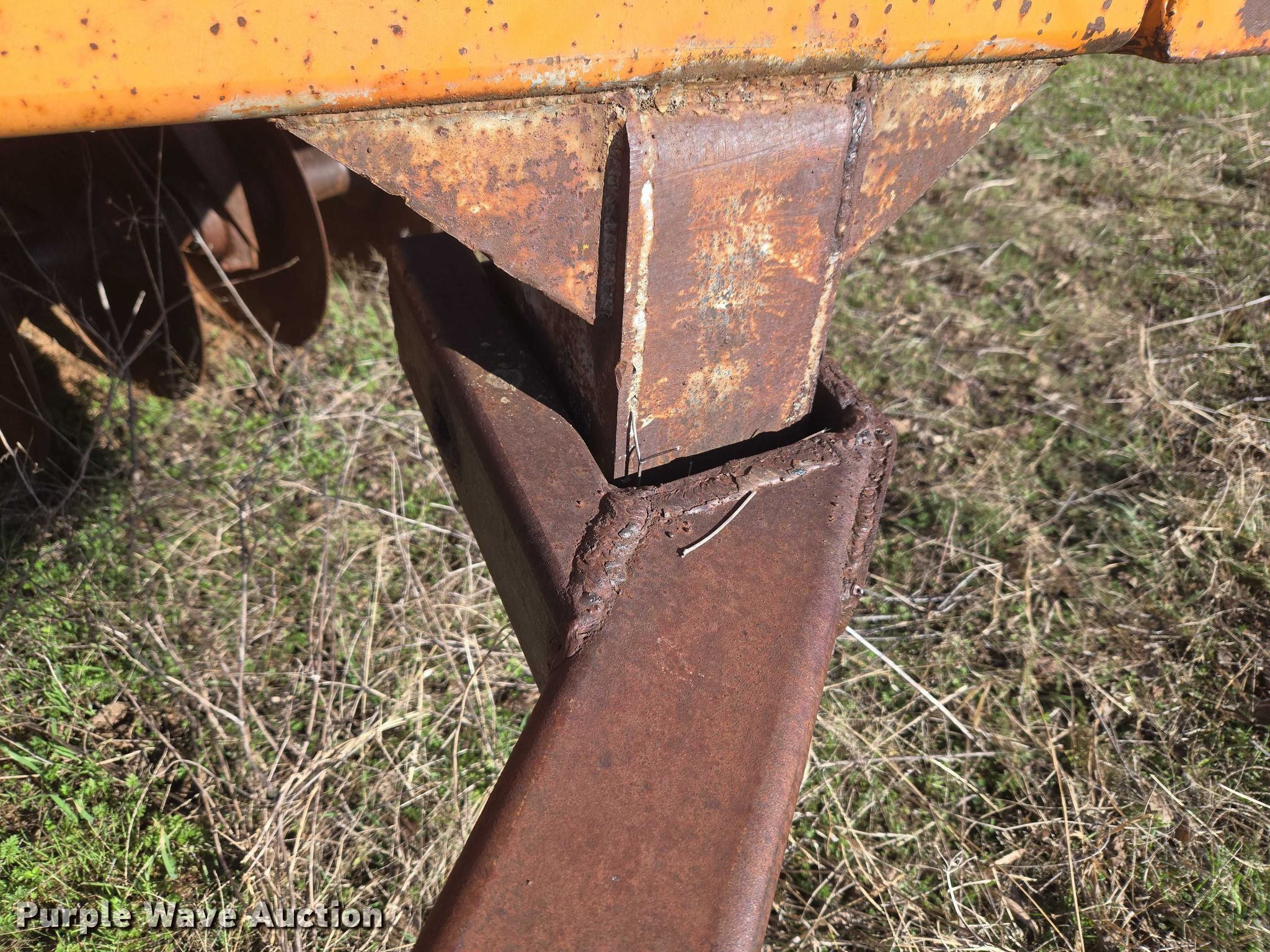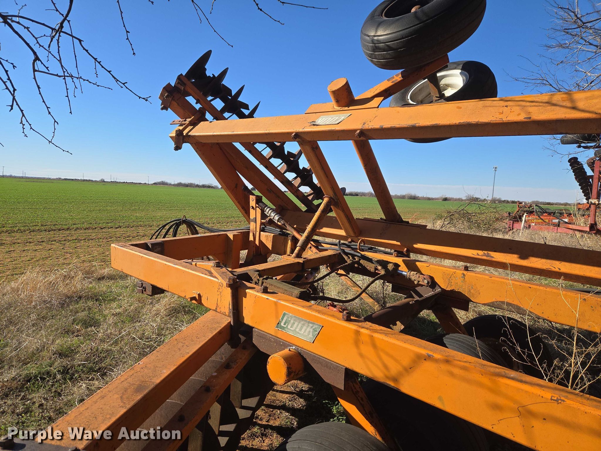 Cook 18 off-set disk. Overall width: 15' 6", Serial: OSF18115. Features Front blades Diameter: 19", Spacing: 9", Rear blades Diameter: 21", Spacing: 9", Disk scrapers, Operation Hydraulic lift, Hydraulic fold. Tires Tire size: 11L-15. Notes Hydraulic leak, Flat tires. Kouba Farms. Yukon, OK 73099