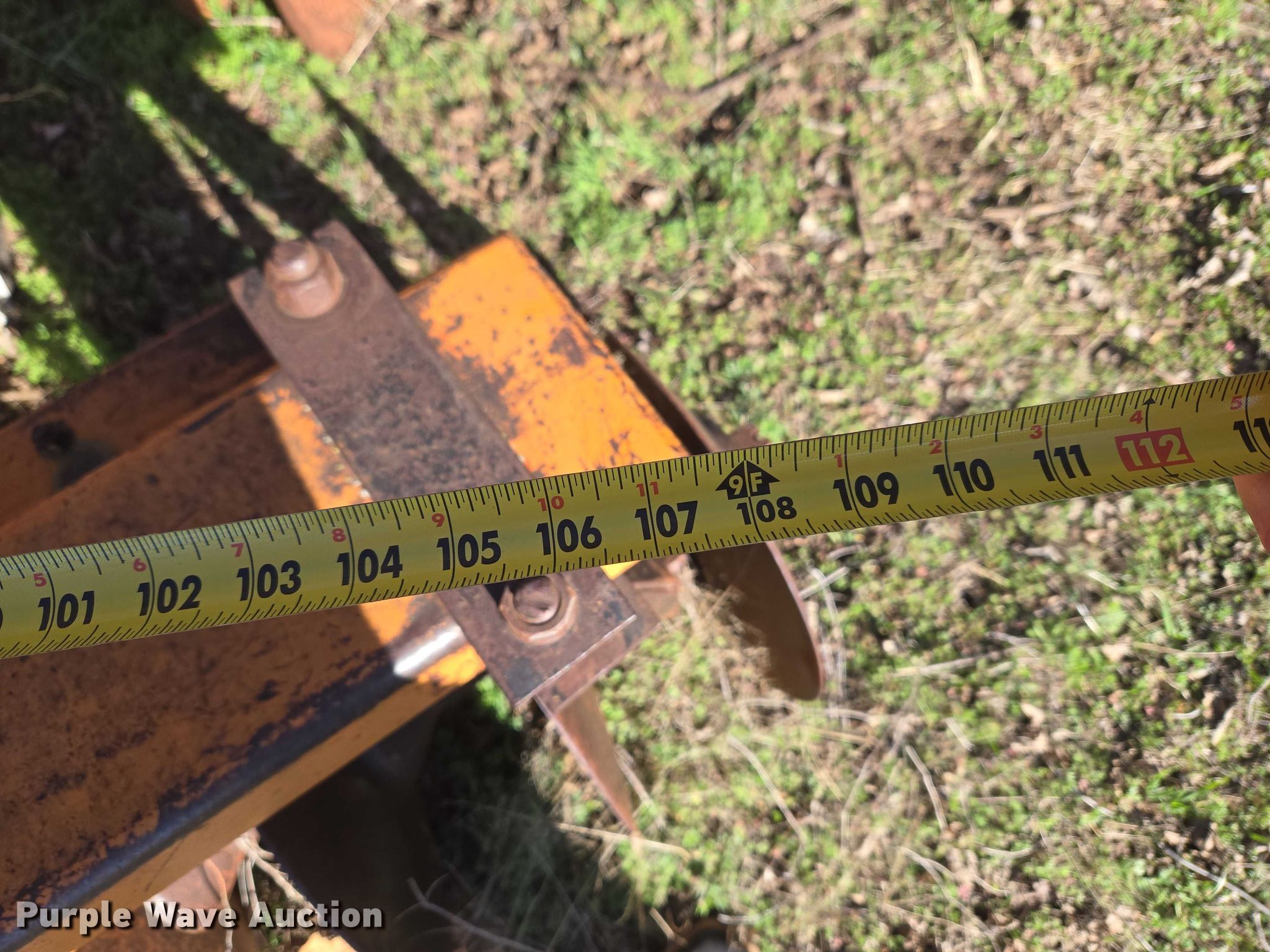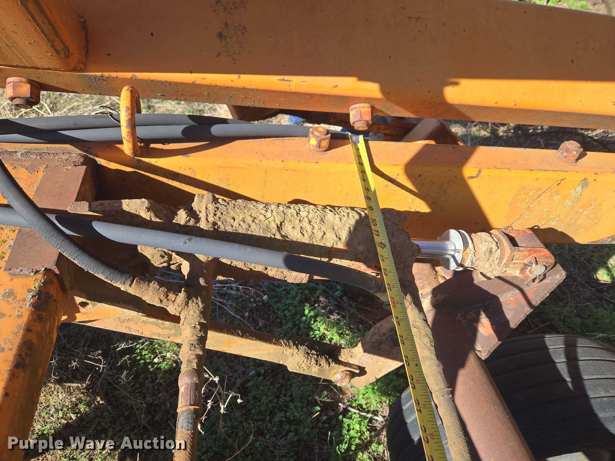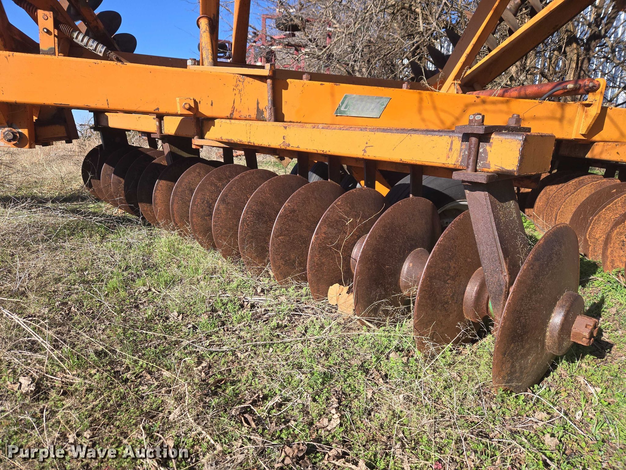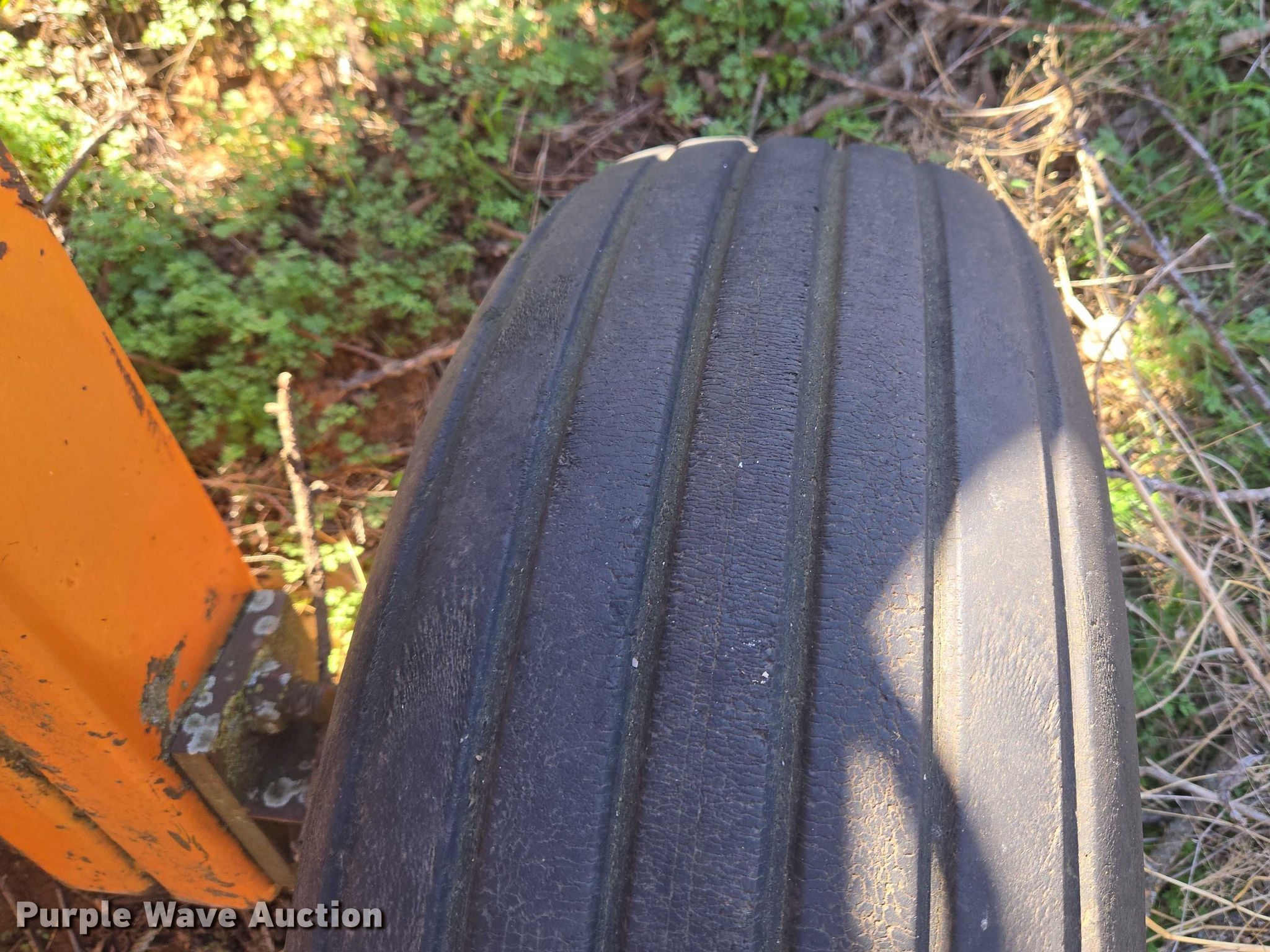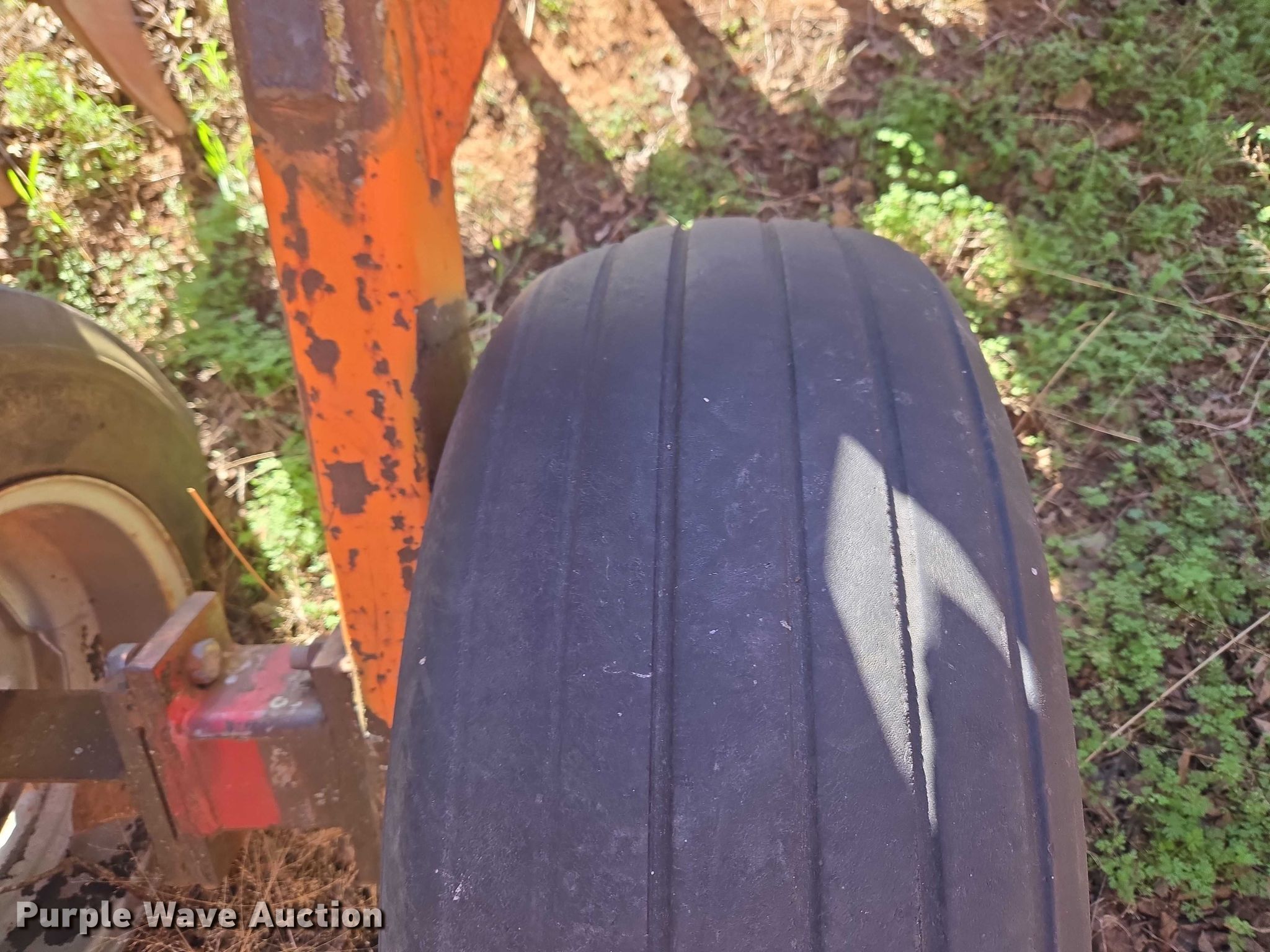 Cook 18 off-set disk. Overall width: 15' 6", Serial: OSF18115. Features Front blades Diameter: 19", Spacing: 9", Rear blades Diameter: 21", Spacing: 9", Disk scrapers, Operation Hydraulic lift, Hydraulic fold. Tires Tire size: 11L-15. Notes Hydraulic leak, Flat tires. Kouba Farms. Yukon, OK 73099