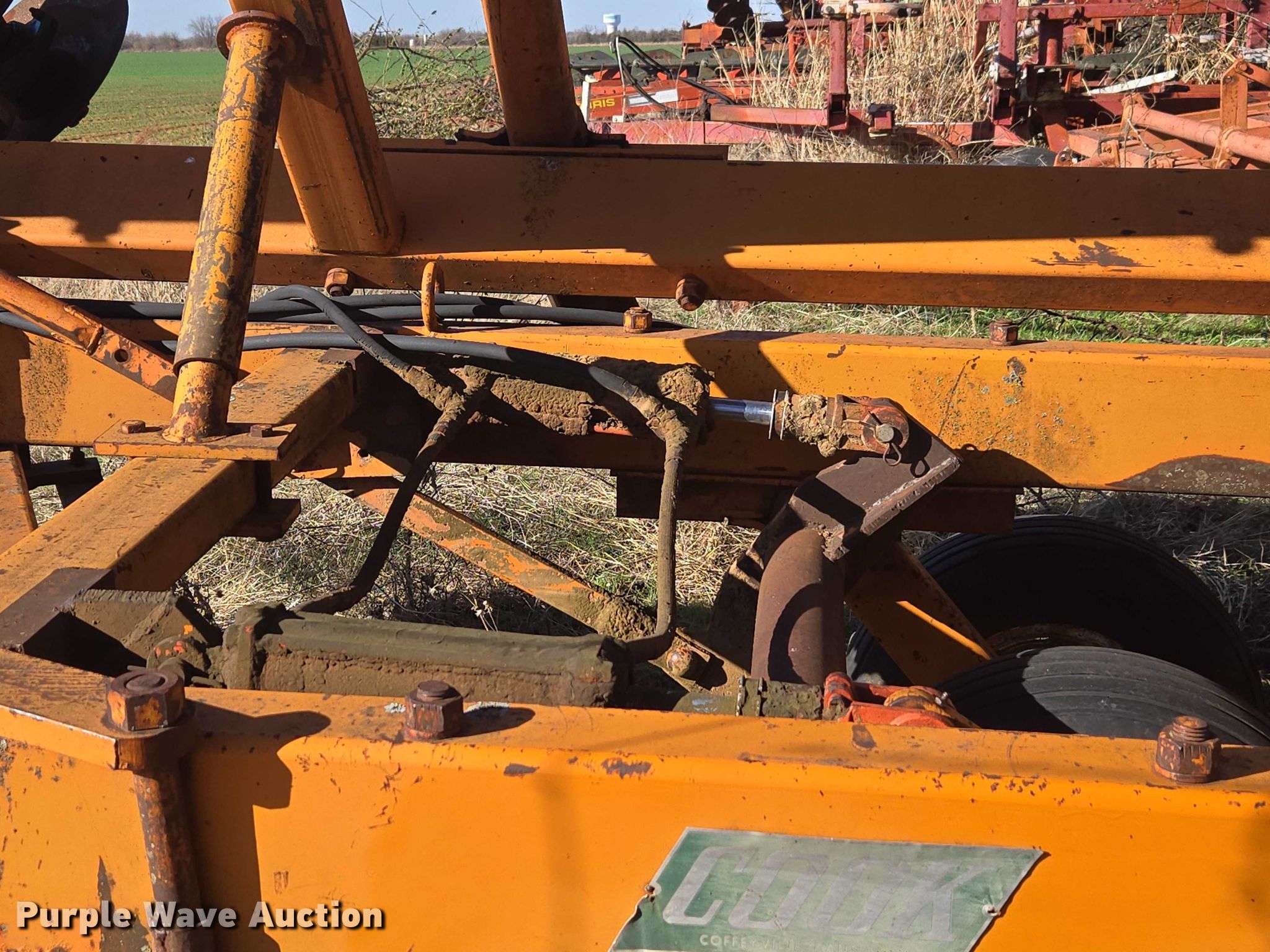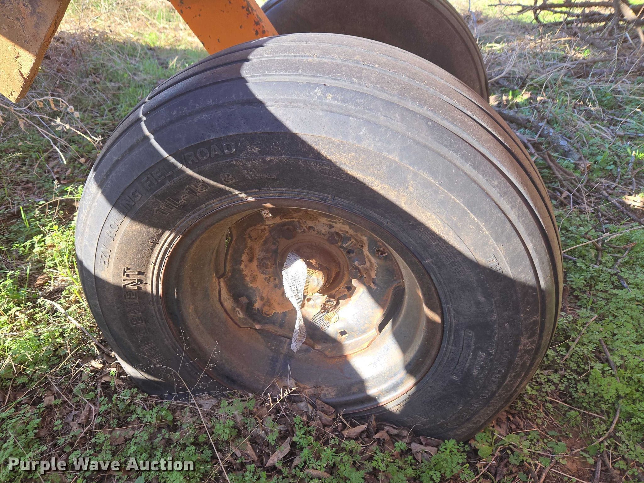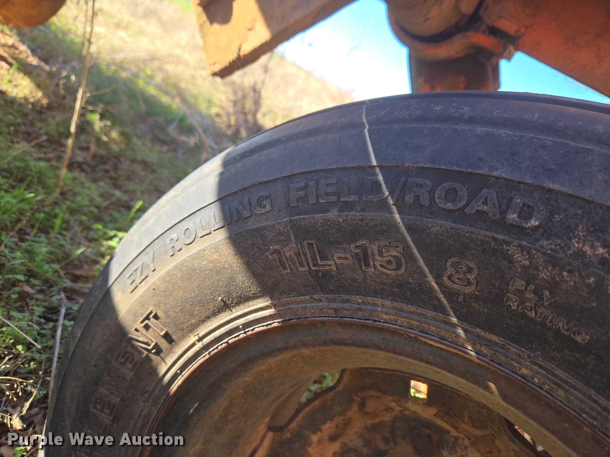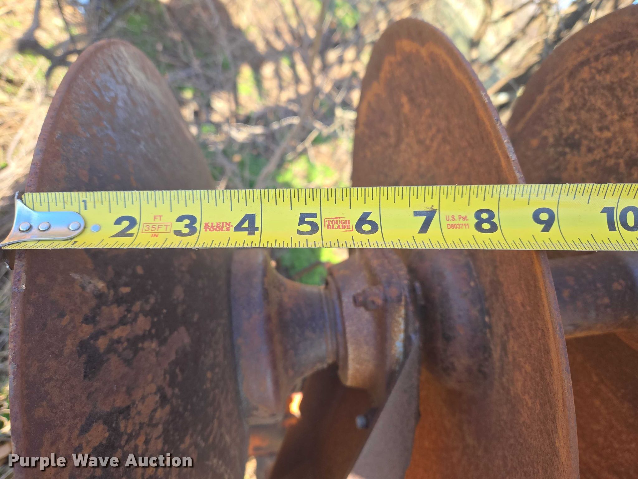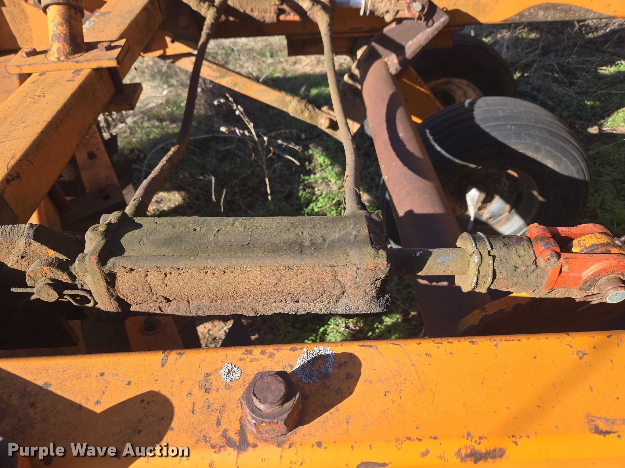Cook 18 off-set disk. Overall width: 15' 6", Serial: OSF18115. Features Front blades Diameter: 19", Spacing: 9", Rear blades Diameter: 21", Spacing: 9", Disk scrapers, Operation Hydraulic lift, Hydraulic fold. Tires Tire size: 11L-15. Notes Hydraulic leak, Flat tires. Kouba Farms. Yukon, OK 73099