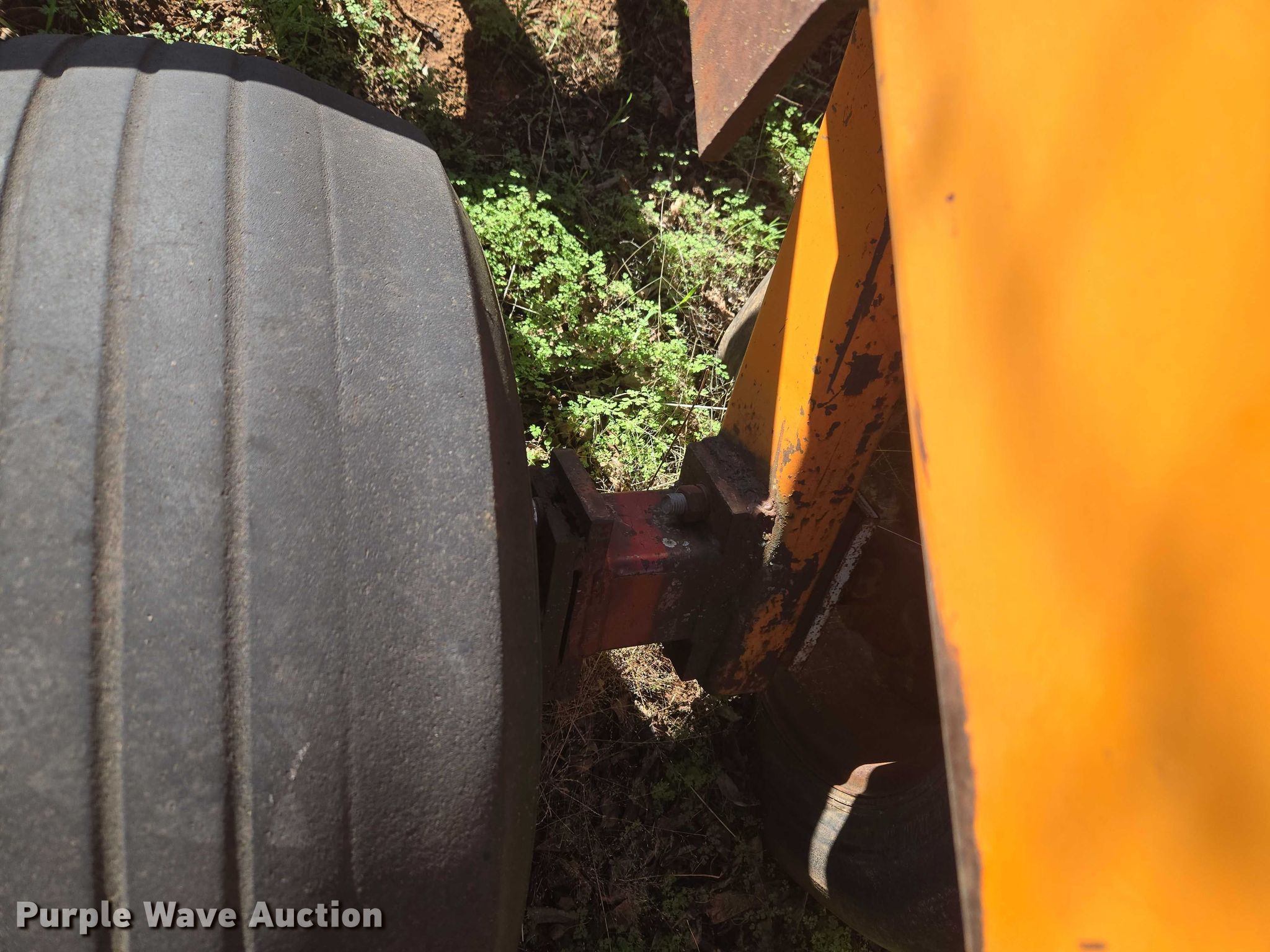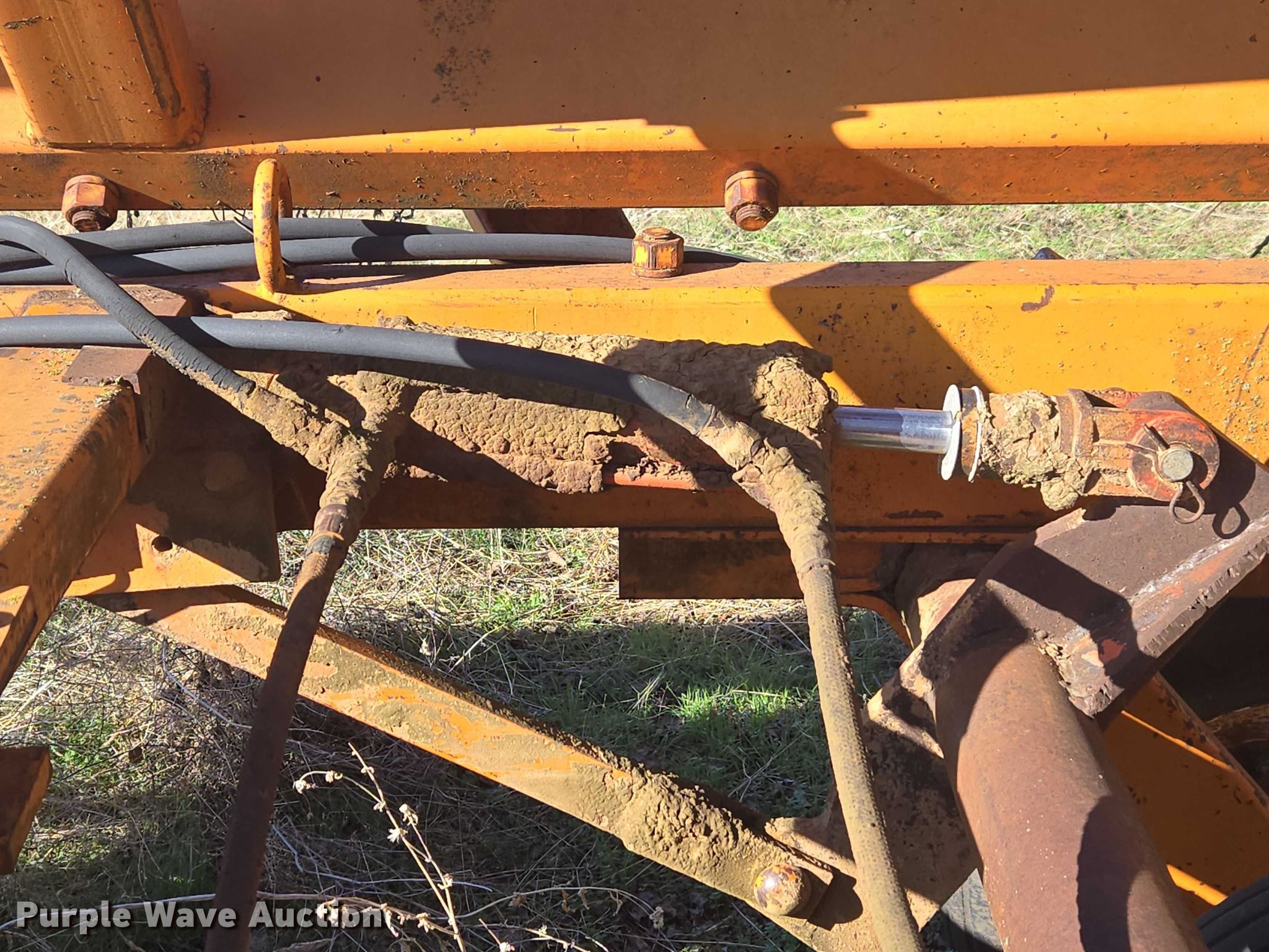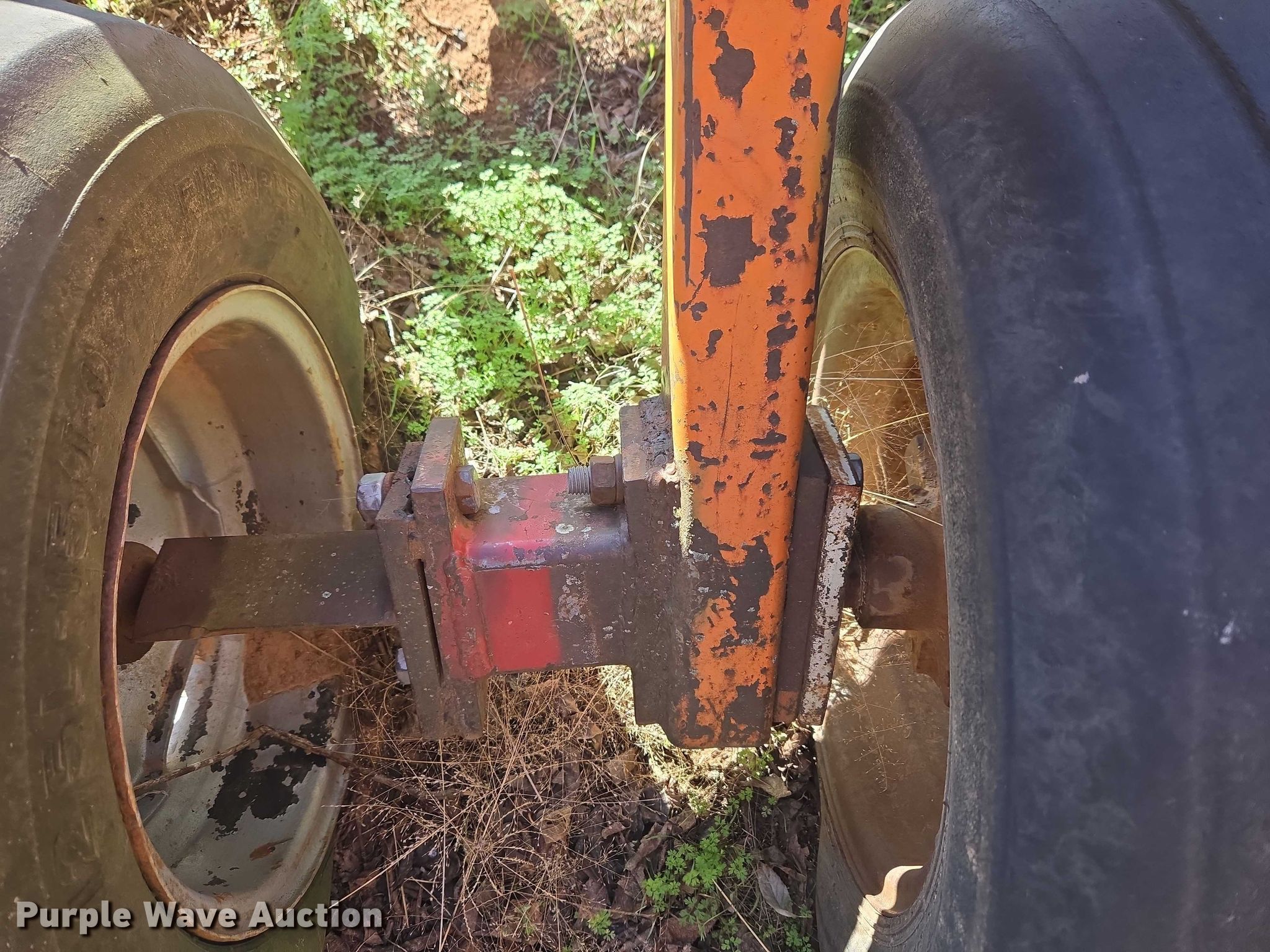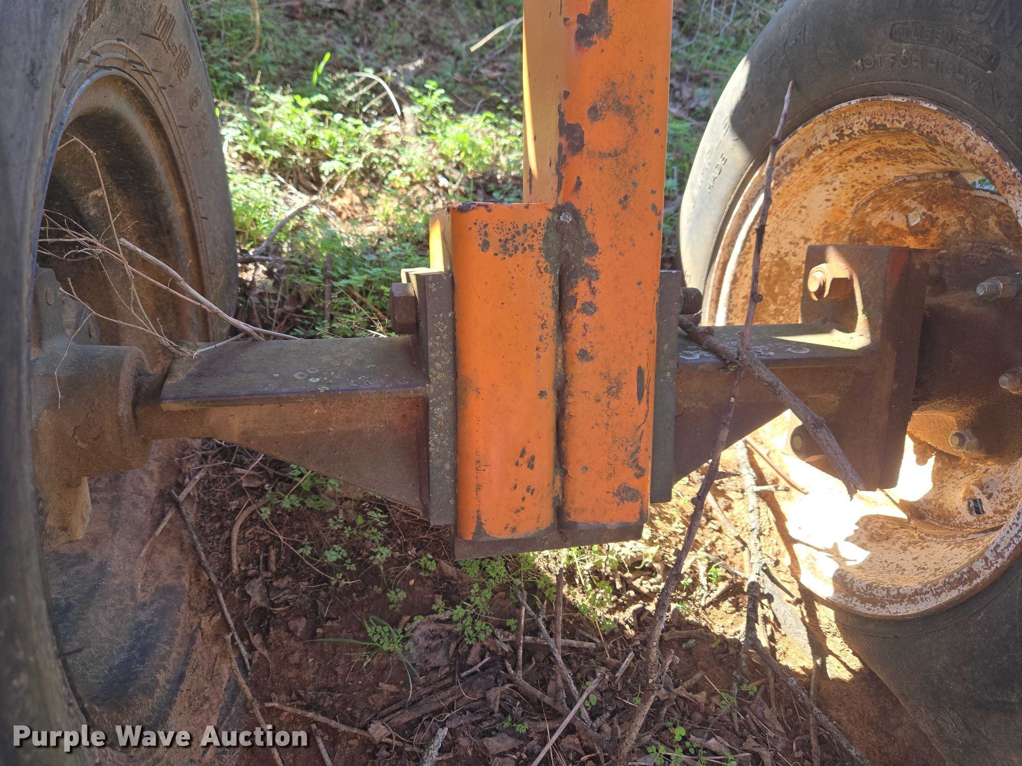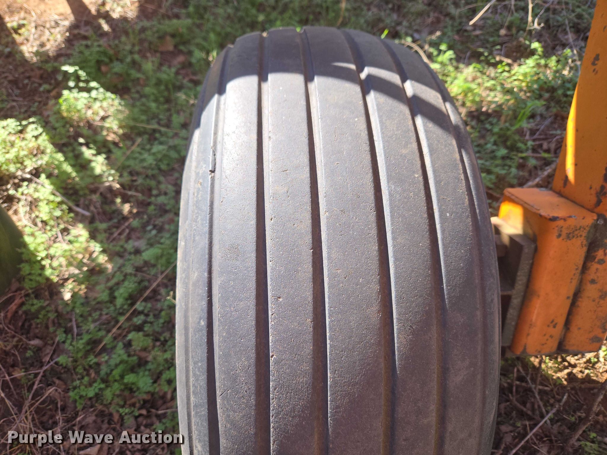 Cook 18 off-set disk. Overall width: 15' 6", Serial: OSF18115. Features Front blades Diameter: 19", Spacing: 9", Rear blades Diameter: 21", Spacing: 9", Disk scrapers, Operation Hydraulic lift, Hydraulic fold. Tires Tire size: 11L-15. Notes Hydraulic leak, Flat tires. Kouba Farms. Yukon, OK 73099