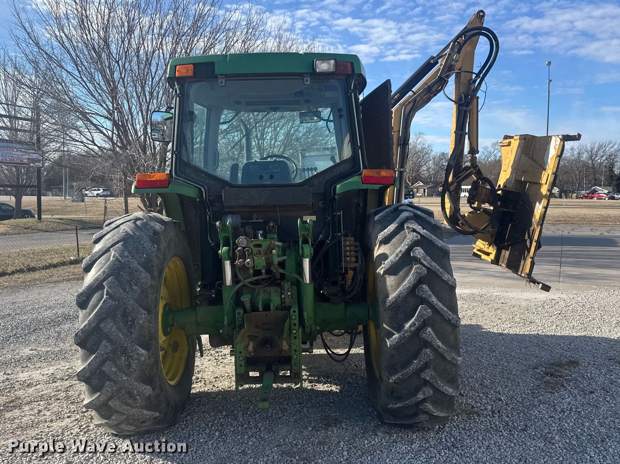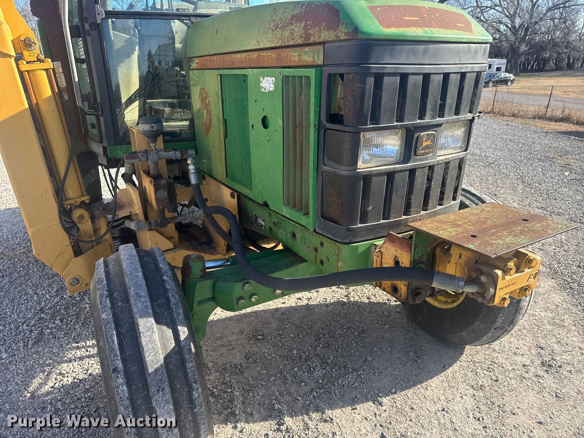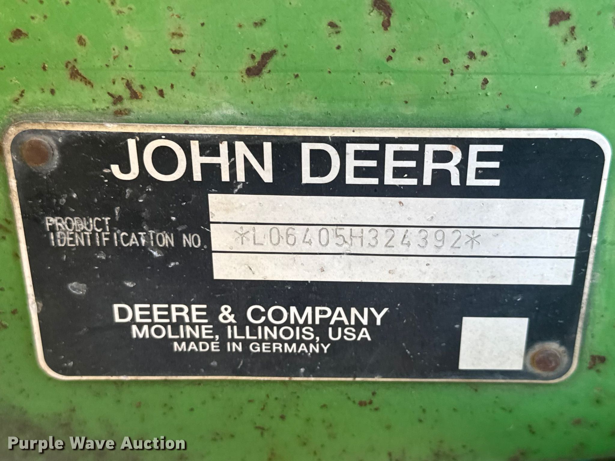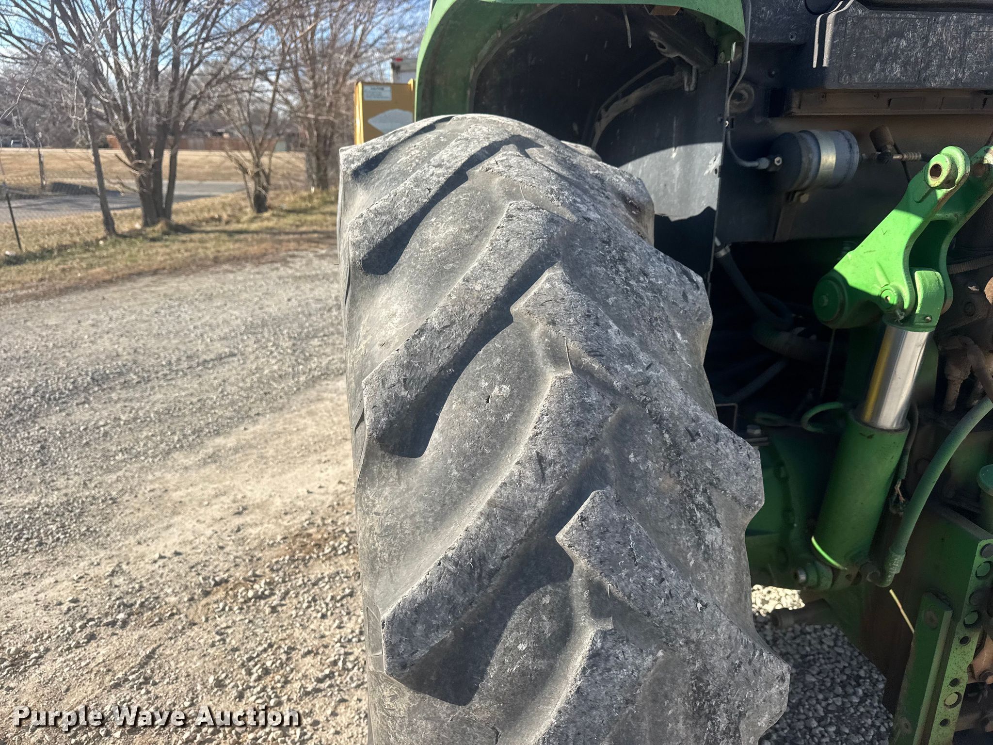 2002 John Deere 6405 tractor. Hours: Unknown, Serial: L06405H324392. Engine John Deere 4045TL062, Serial: CD4045T664428, Displacement: 4.5L, Cylinders: 4, Fuel type: Diesel. Transmission Synchro, 12F - 4R, Differential lock. Operators station AC, Heat. Features PTO: 540, Three point, Seven pin outlet, Hydraulic remote sets Rear: 2, Diamond side boom mower Width: 48". Tires Front: 10.00-16, Rear: 18.4-34, Wheel weights: 3. Notes Non-operational hour meter. QP Distribution. Mulvane, KS 67110