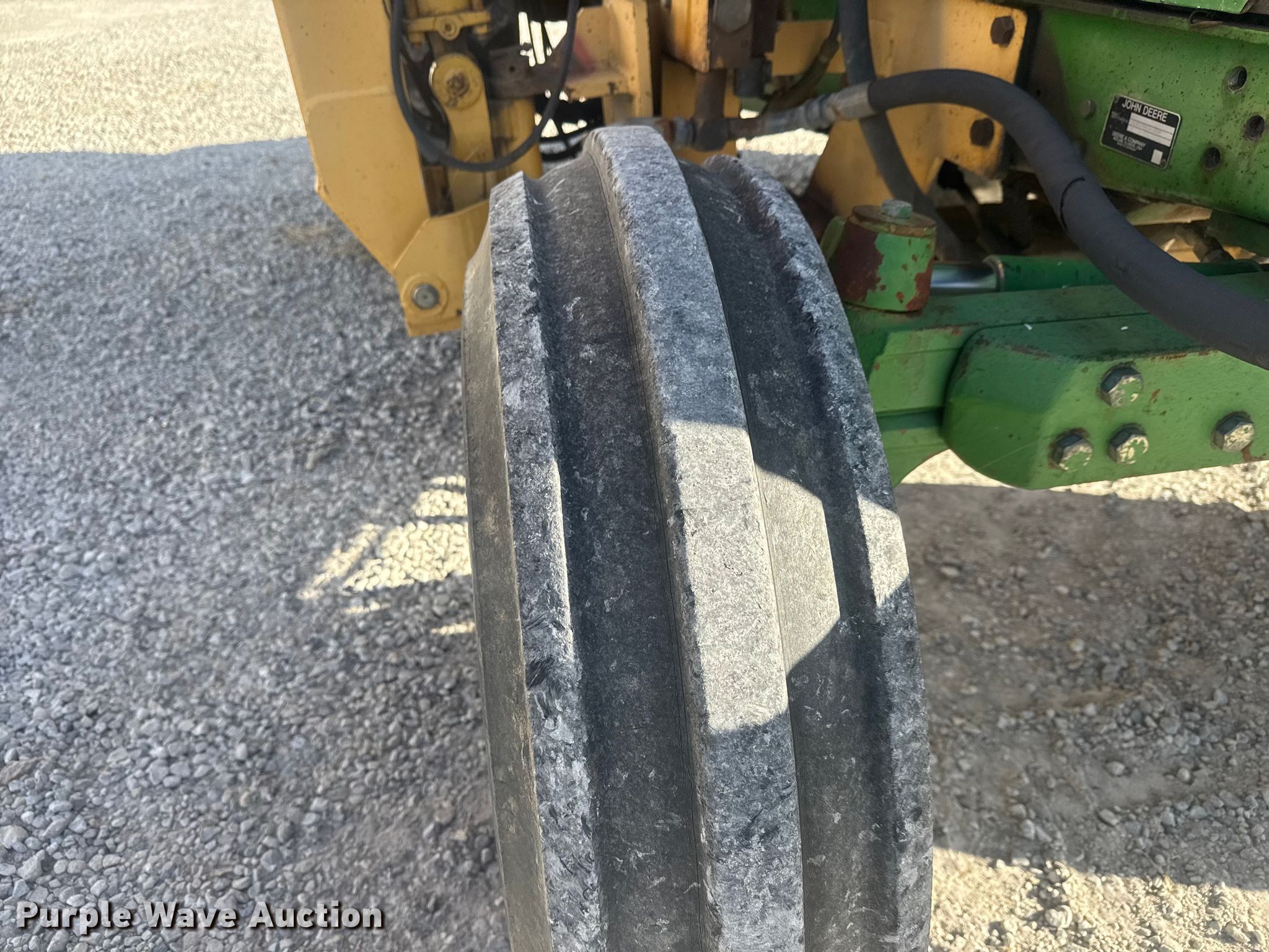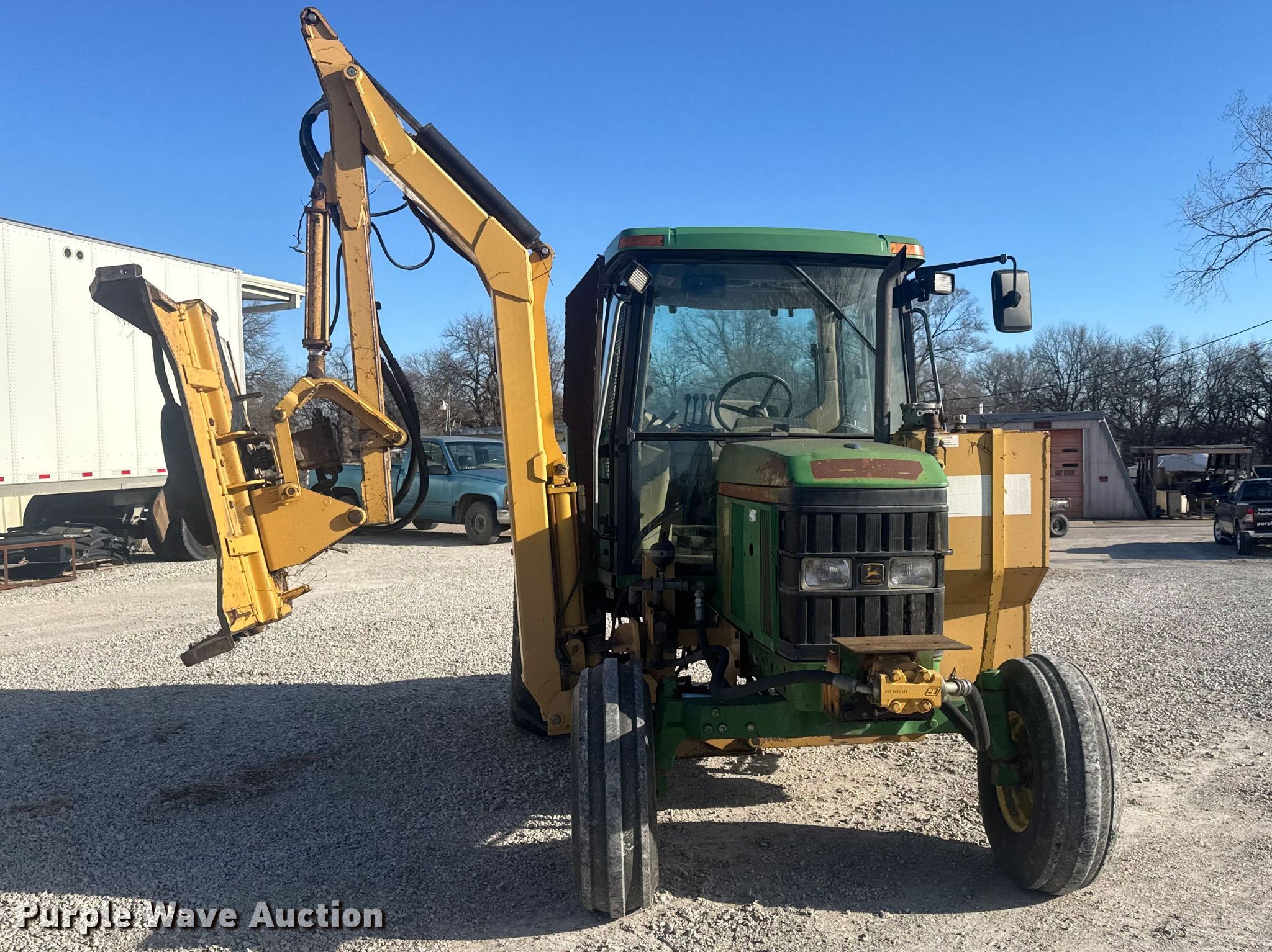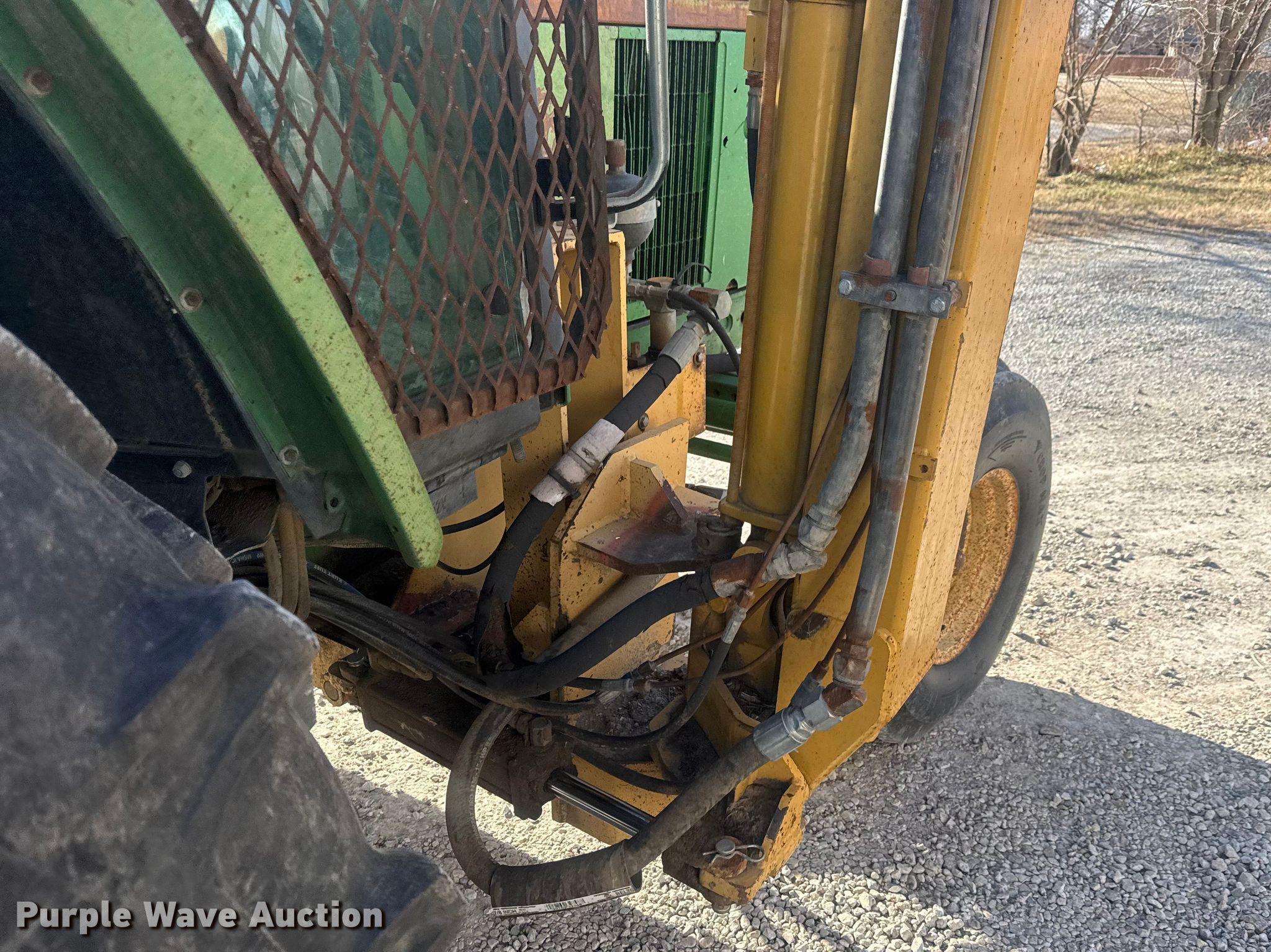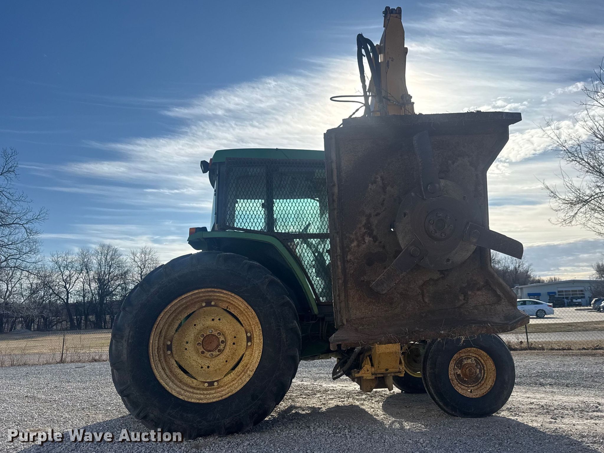 2002 John Deere 6405 tractor. Hours: Unknown, Serial: L06405H324392. Engine John Deere 4045TL062, Serial: CD4045T664428, Displacement: 4.5L, Cylinders: 4, Fuel type: Diesel. Transmission Synchro, 12F - 4R, Differential lock. Operators station AC, Heat. Features PTO: 540, Three point, Seven pin outlet, Hydraulic remote sets Rear: 2, Diamond side boom mower Width: 48". Tires Front: 10.00-16, Rear: 18.4-34, Wheel weights: 3. Notes Non-operational hour meter. QP Distribution. Mulvane, KS 67110