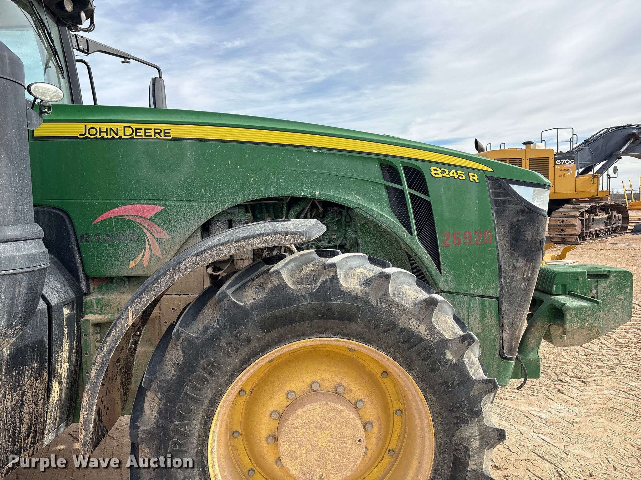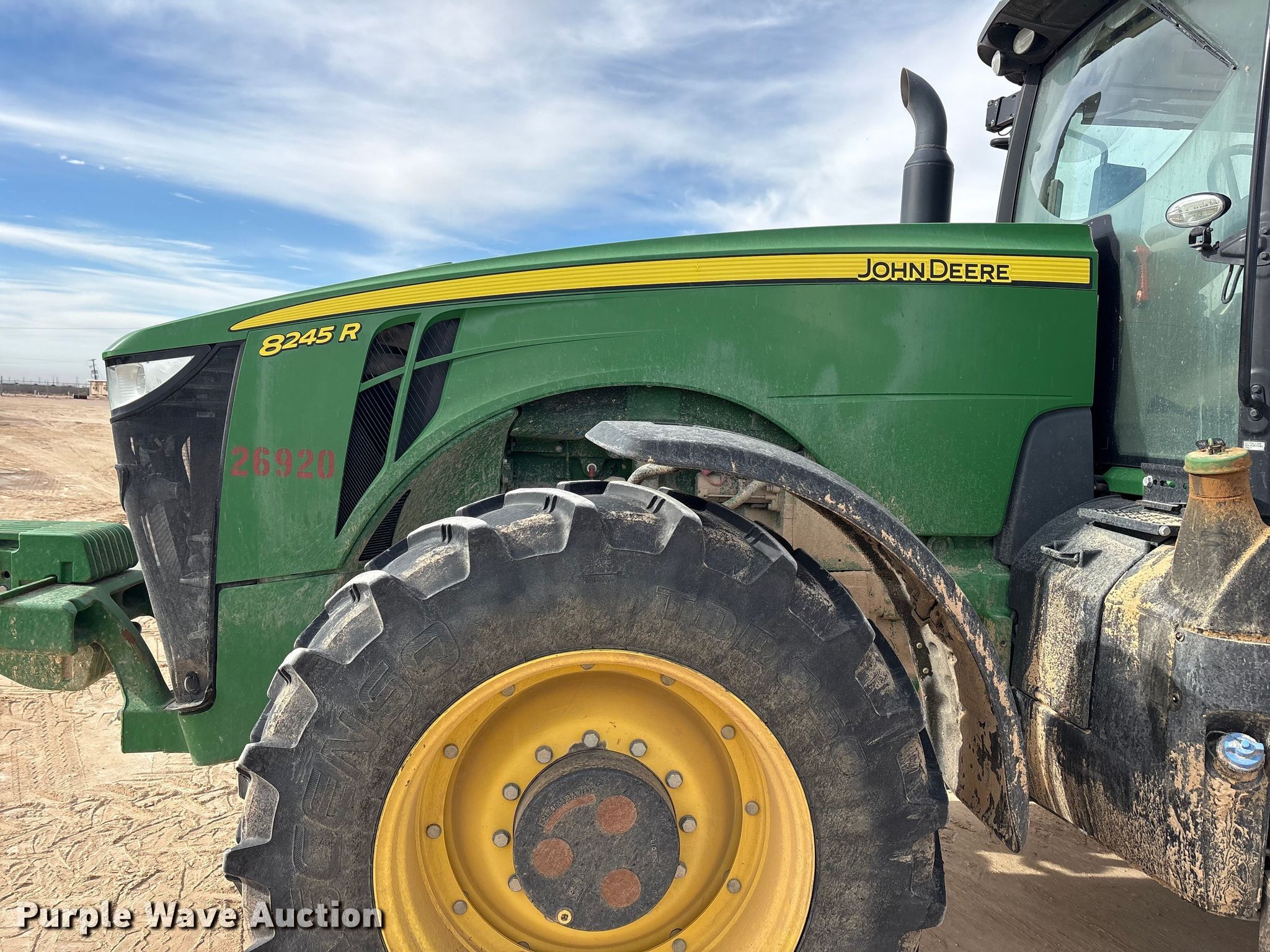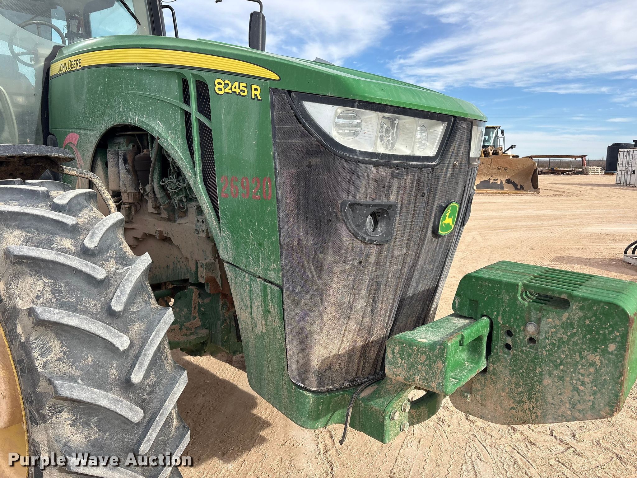 2019 John Deere 8245R MFWD tractor. Hours: 11,451 on meter, Serial: 1RW8245RCKD144074, Unit #: 26920. Engine John Deere, Displacement: 9.0L, Cylinders: 6, Fuel type: Diesel. Transmission IVT, Differential lock. Operators station AC, Heat, Display John Deere, Auto steer. Features PTO: 1 3/4" 1000, Three point Top link, Quick attach, Seven pin outlet, ISOBUS outlet, Hydraulic remote sets Rear: 4, Power beyond (hydraulics), Suitcase weights: 8. Tires Front: 420/85R34, Rear: 480/80R50, Duals. Notes Jump start required during on-site data collection. Rango. Monahans, TX 79756