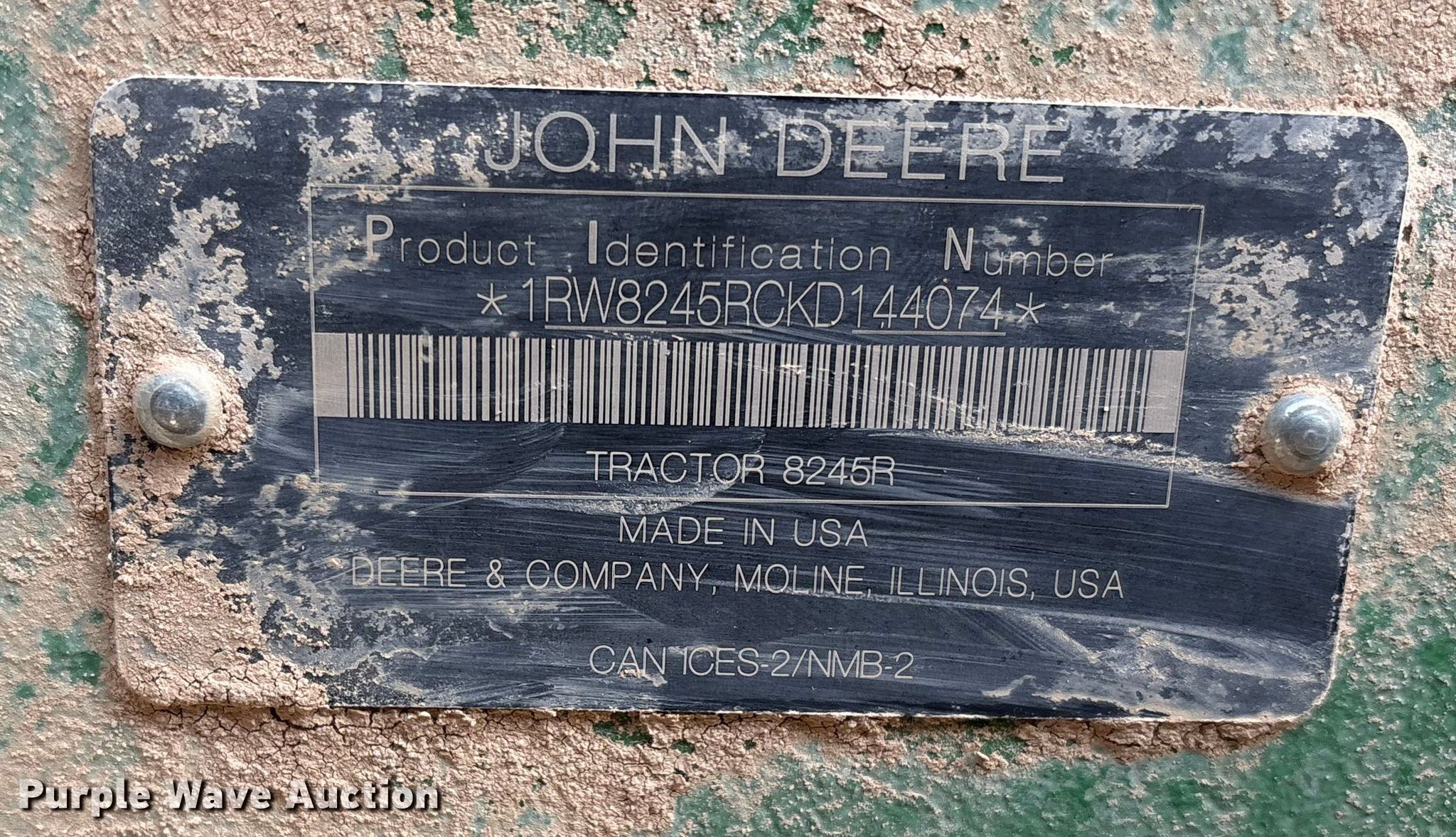 Purple Wave is selling a used Tractor in Texas. This item is a 2019 John Deere 8245R MFWD tractor with the following: Hours: 11,451 on meter, Serial: 1RW8245RCKD144074, Unit #: 26920