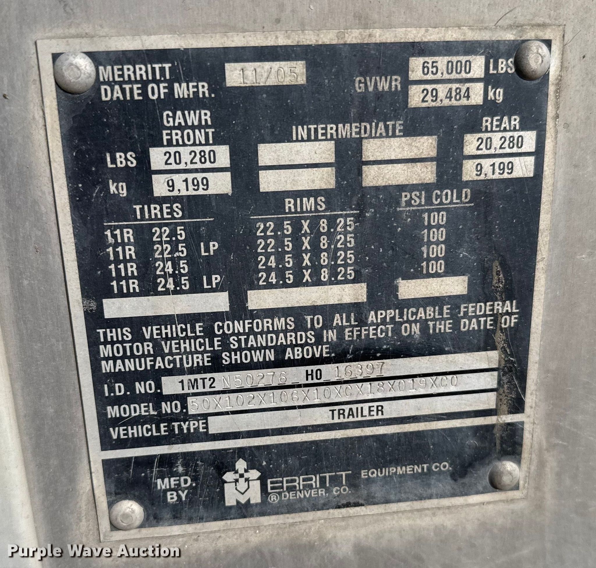 2006 Merritt livestock trailer. VIN: 1MT2N50276H016397. Dimensions Overall Length: 50', Width: 102", Body Length: 50', Width: 102". Features Decks: Two, Center gates: 2. Chassis Landing gear: Dual, Suspension: Air, Brakes: Air, Axles: Tandem, GVWR: 65,000 lbs. Tires Aluminum wheels, Size: 11R24.5. Kansas title. Title distribution may be delayed up to 14 days from verification of funds. Short & Son Inc.. Goodland, KS 67735