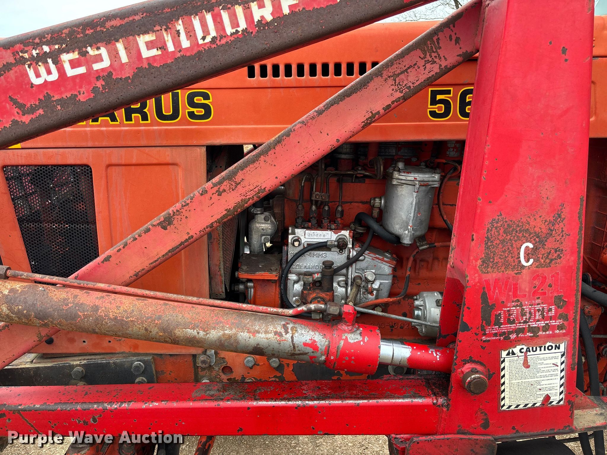 Belarus 562M tractor. Hours: 2,179 on meter, Serial: 256407. Engine Cylinders: 4, Fuel type: Diesel. Transmission Manual, 9F - 2R. Operators station Heat. Features PTO: 540, Three point, Seven pin outlet, Hydraulic remote sets Rear: 1, Loader Westerndorf WL21, Bucket Width: 60".. Tires Front: 11.2-20, Rear: 15.5-38, Wheelbase: 96". Notes sliding gear transmission, Glass cracked, Hydraulic leak, Front driveshaft removed but included. Florence, MO 63363