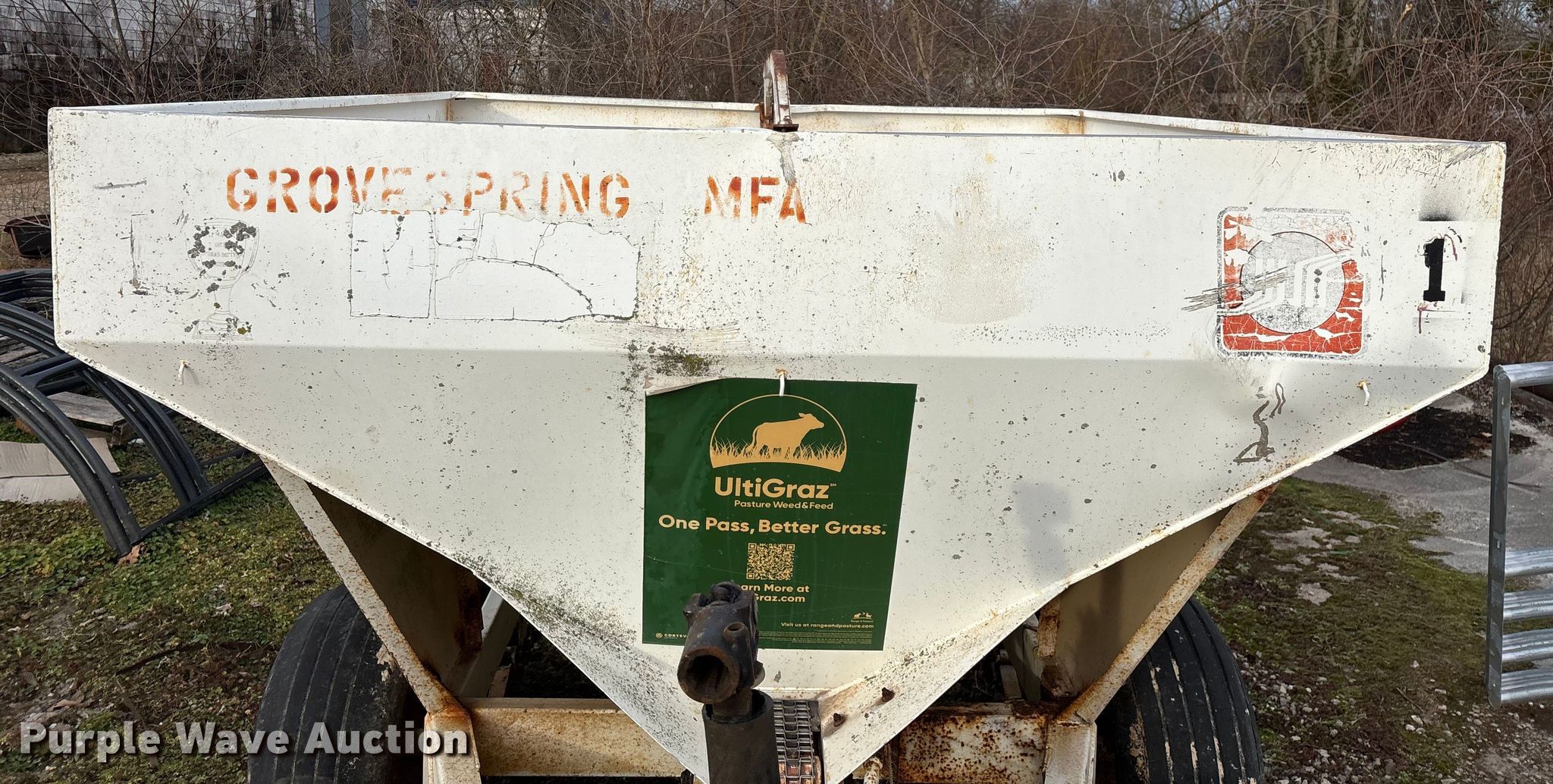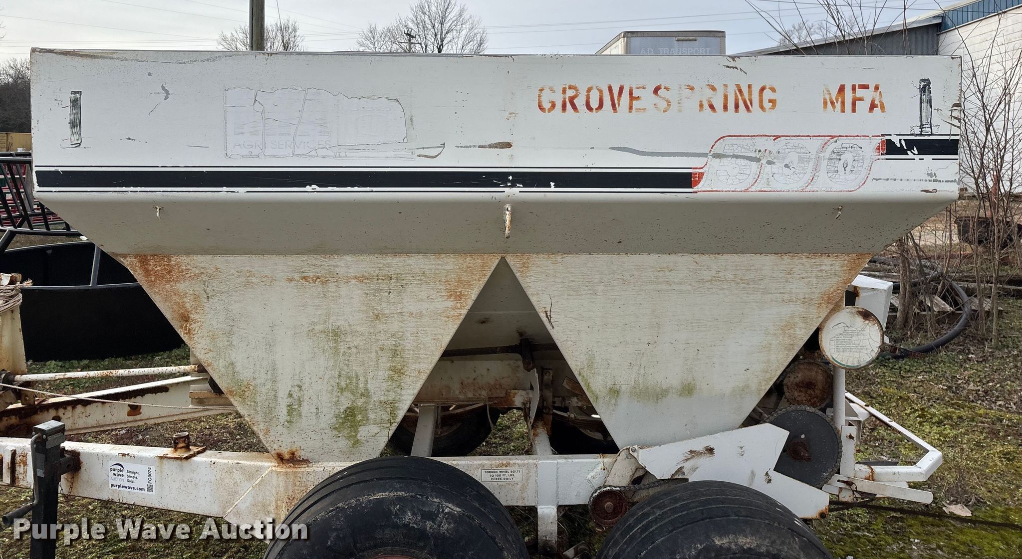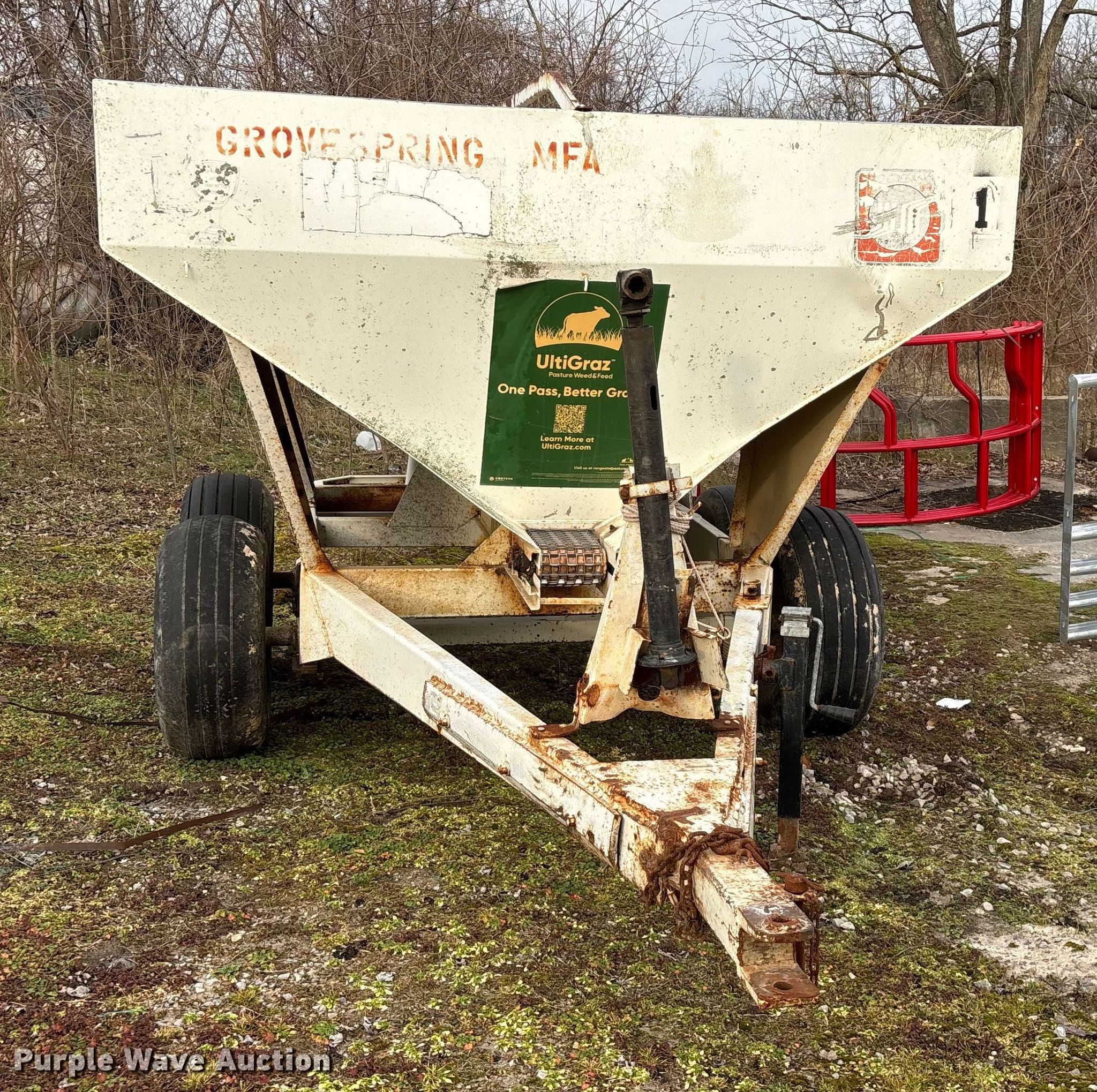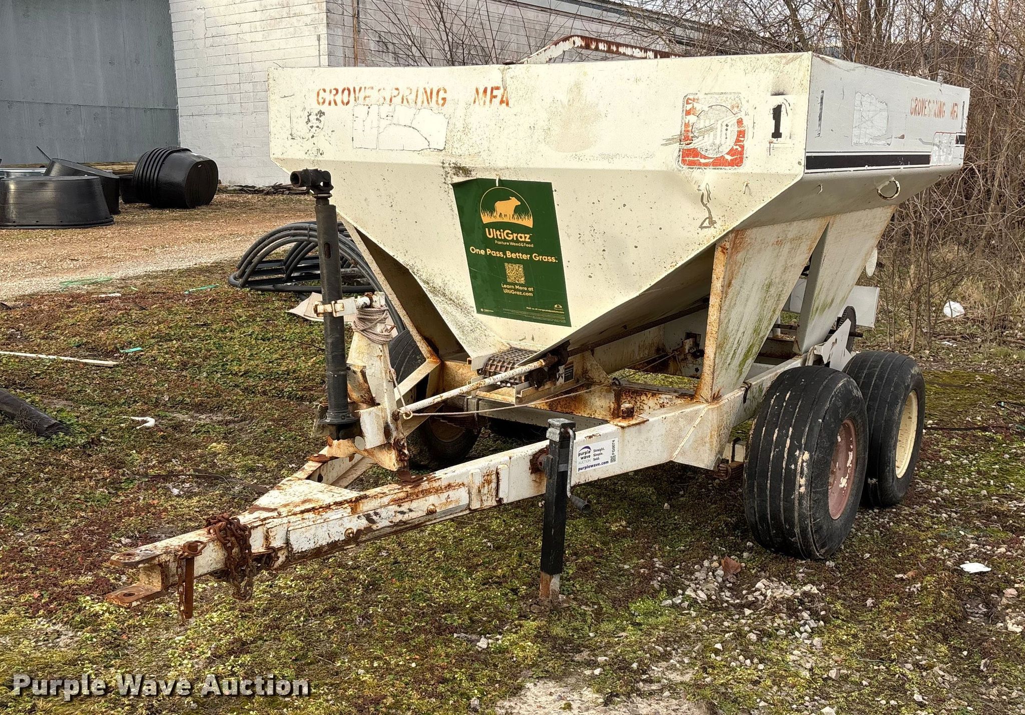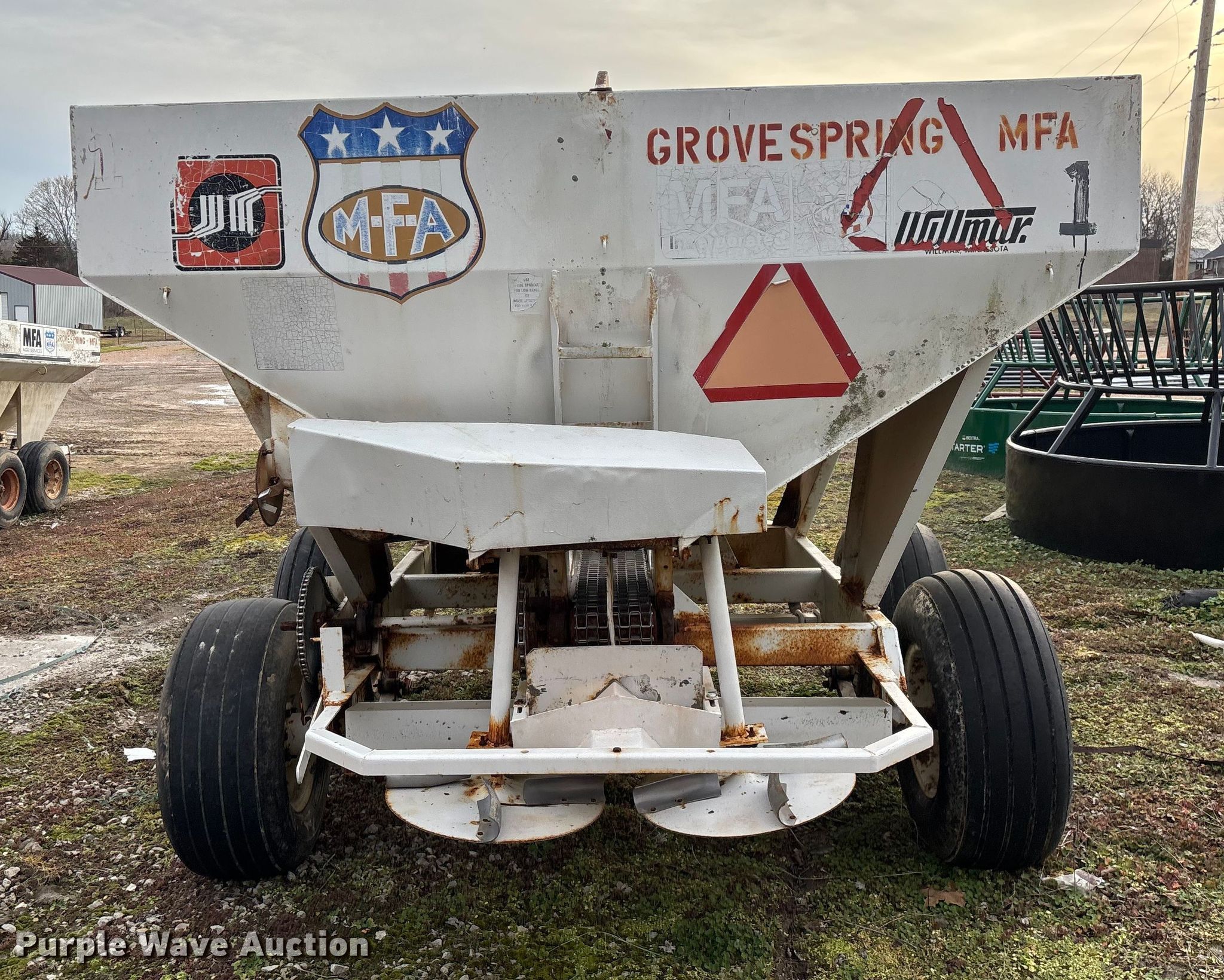 Willmar 500 spreader. Unit #: 1. Features PTO: 540, Dry fertilizer spreader Dual spinners, Ground driven, Conveyor/chain Width: 7".. Tires Size: 12.5L-15SL. Notes Frame rust damage, Decals will be removed prior to auction, Tire flat. MFA Farmers Produce Exchange. Grovespring, MO 65662